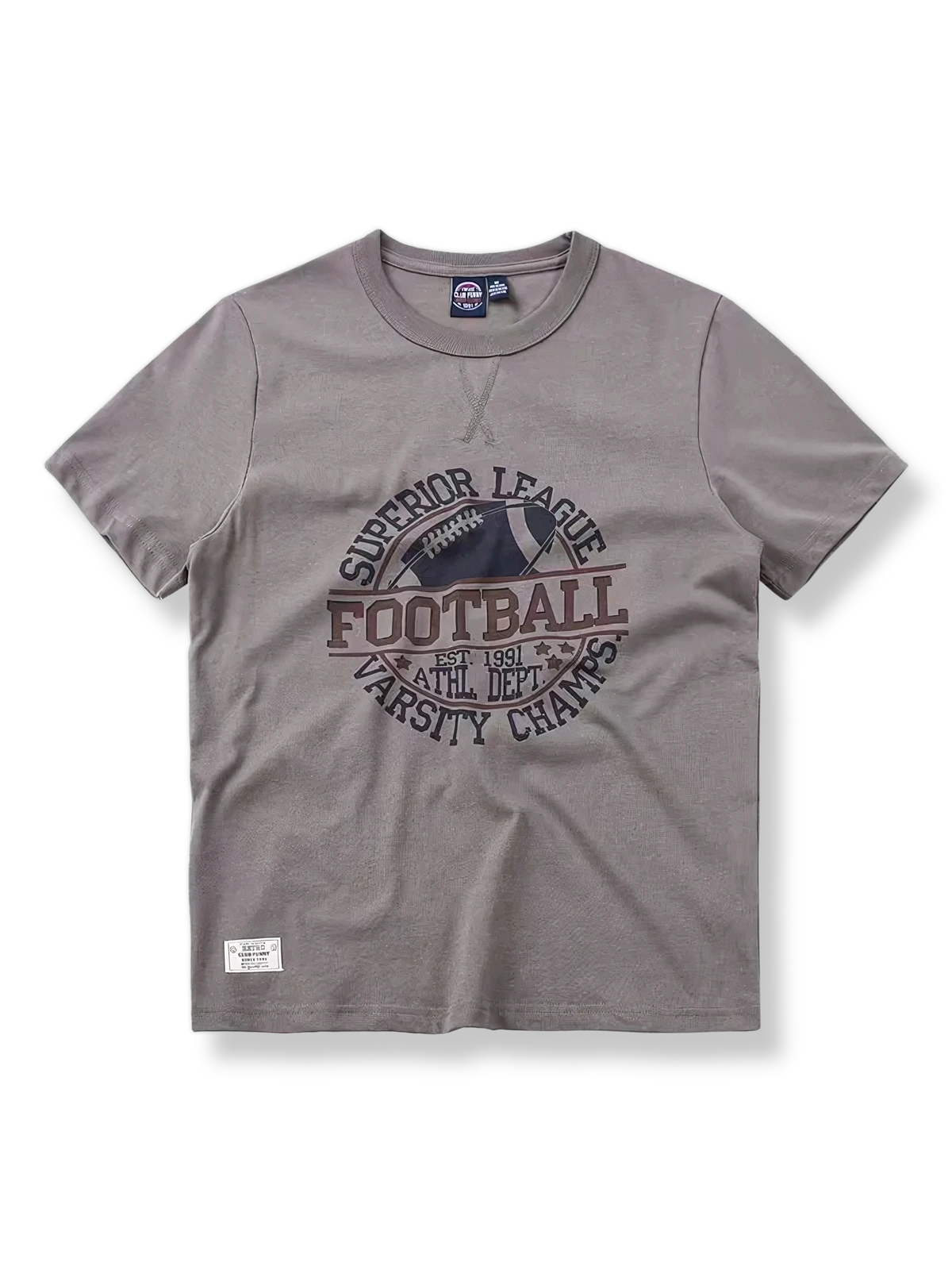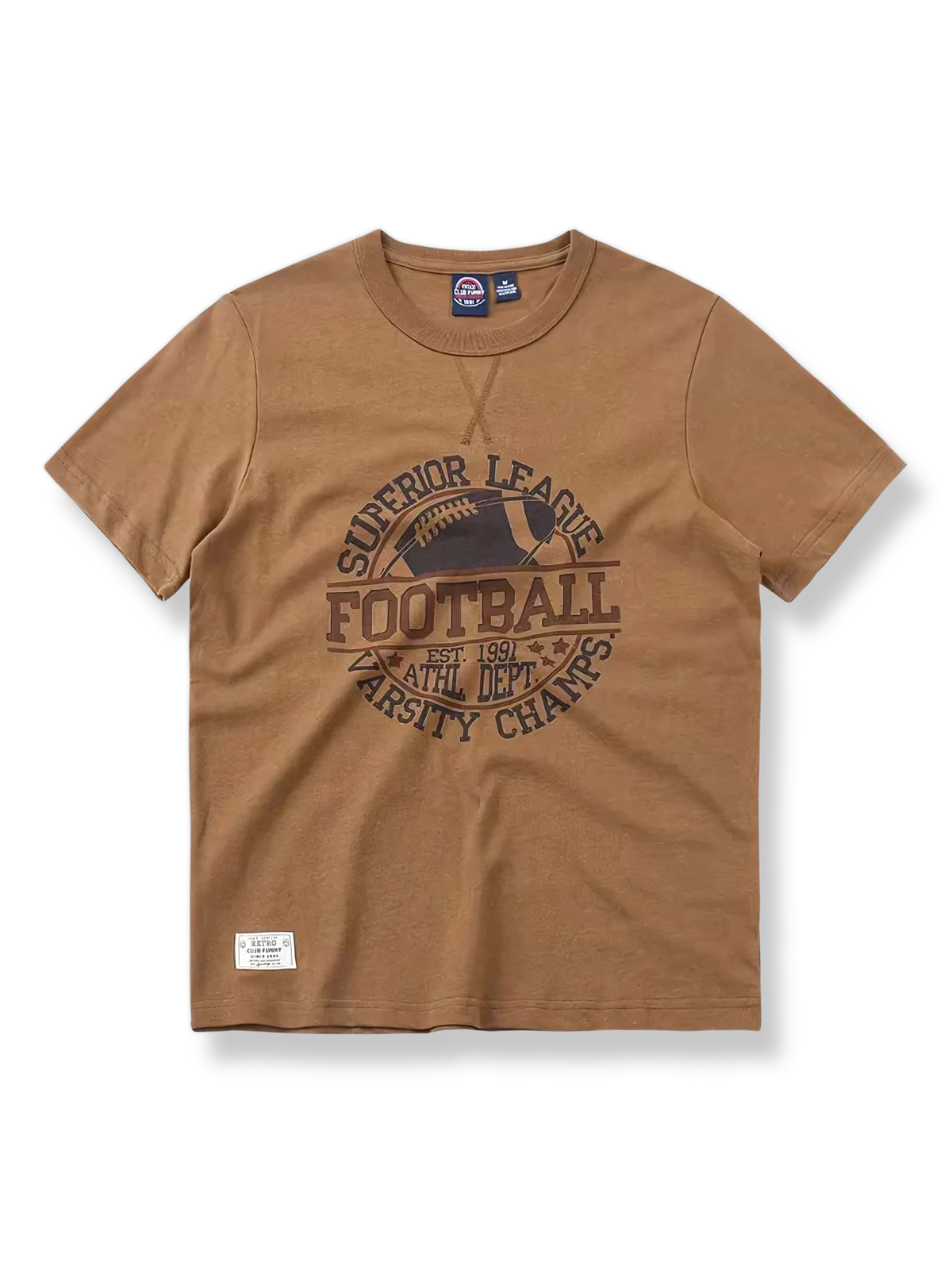 このTシャツは、ラグビースポーツの魅力とレトロなカレッジスタイルが見事に融合したデザインです。胸元に「SUPERIOR LEAGUE FOOTBALL」と創立年をプリントし、カレッジスポーツの競争精神とノスタルジアを表現しています。