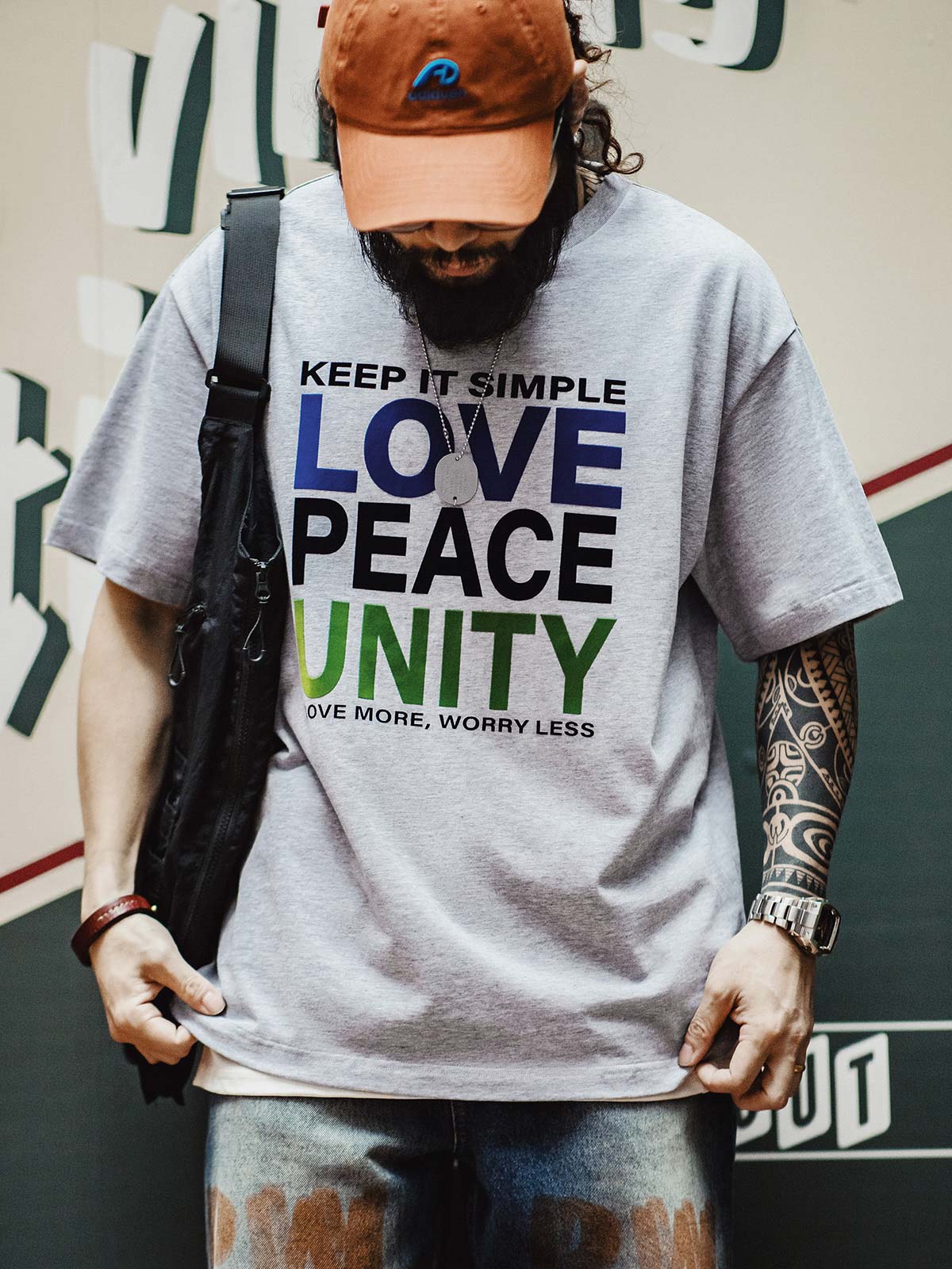 このTシャツは、100%コットン素材を使用しており、快適で通気性が良く、夏の着用に最適です。ゆったりとしたカットとアメリカンカジュアルなスタイルが特徴で、自由な着心地を提供します。胸部には「Love Peace Unity」のレターフロッキープリントが施され、個性を強調し、メッセージを伝えます。コントラストのあるデザインが視覚的なレイヤー感を増し、日常の通勤やストリートスタイルのコーディネートを際立たせます。このレタープリントTシャツは、ストリートスタイルの必須アイテムであり、Tシャツのメッセージが個性を簡単に表現します。