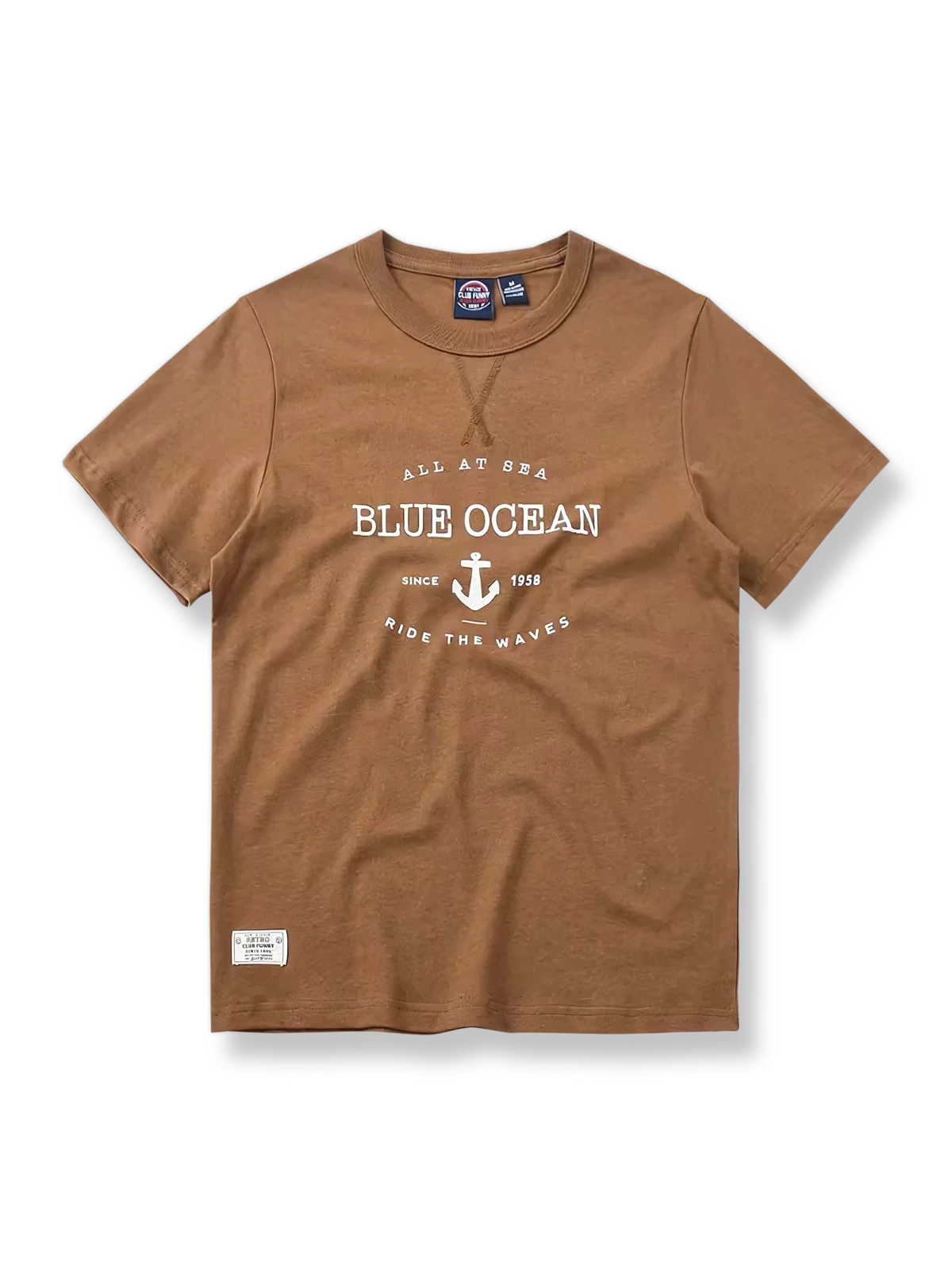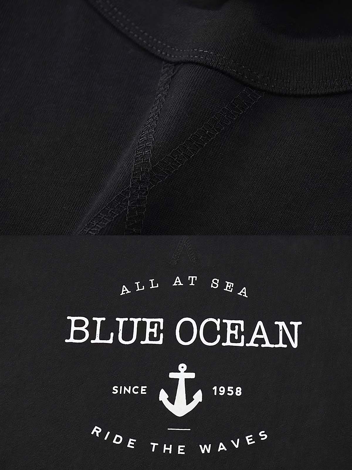 この半袖Tシャツは、1958年の航海探検をテーマに、「BLUE OCEAN」と船錨のデザインを採用し、海洋探検家の冒険精神を称えます。クラシックな海洋シンボルを現代的なスタイルで表現し、航海のロマンスと精神を反映しています。