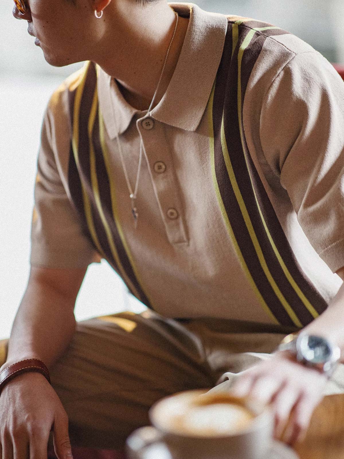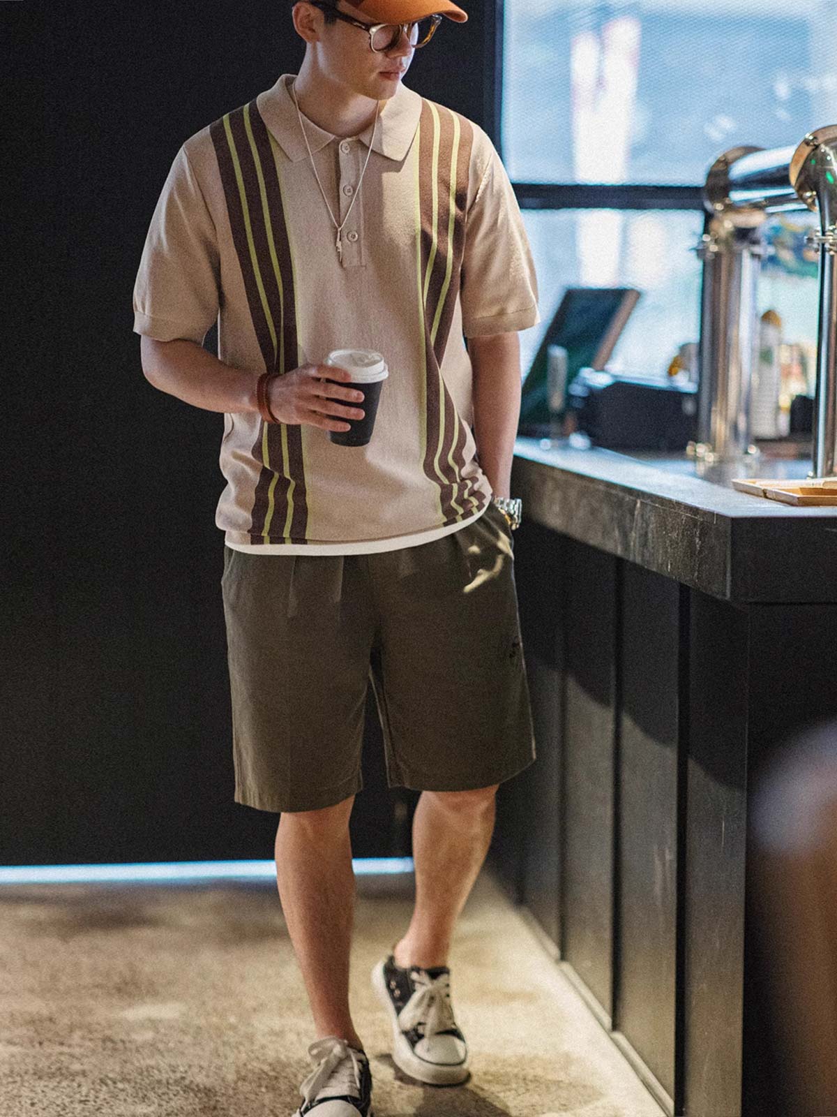 このアメリカンヴィンテージスタイルのニットポロボウリングシャツは、バイカラーストライプデザインで濃厚なレトロ感を演出します。襟付きデザインは全体にカジュアルでファッショナブルな雰囲気を加えます。生地は51.2%のレーヨンと48.8%のナイロンで構成されており、優れた通気性と快适さを提供し、耐久性と伸縮性も兼ね備えています。このシャツのデザインはクラシックなアメリカンボウリングシャツからインスパイアされており、ジーンズやカジュアルパンツと合わせることで、様々なカジュアルシーンに適応します。