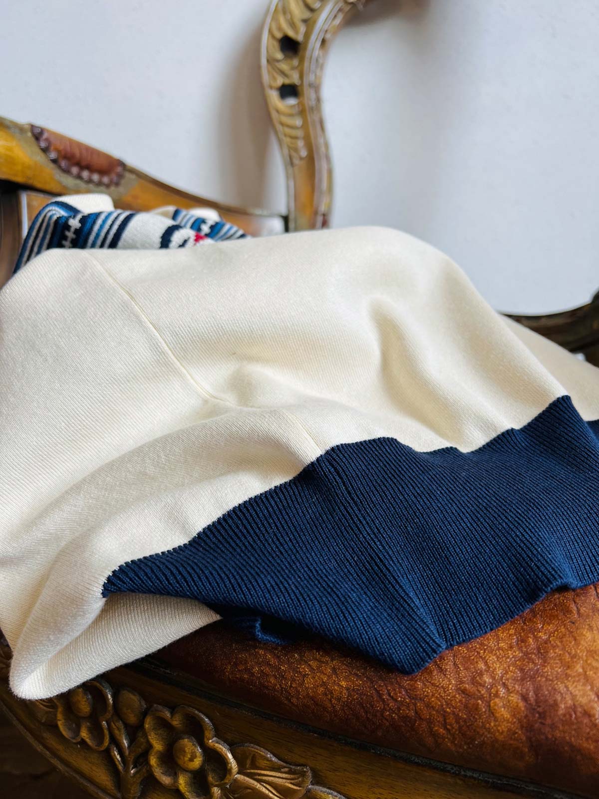 体に優しくフィットするクラシックなニット構造を採用しています。リブ編みの裾と袖口は快適性を保ちつつ、動きやすさを提供します。