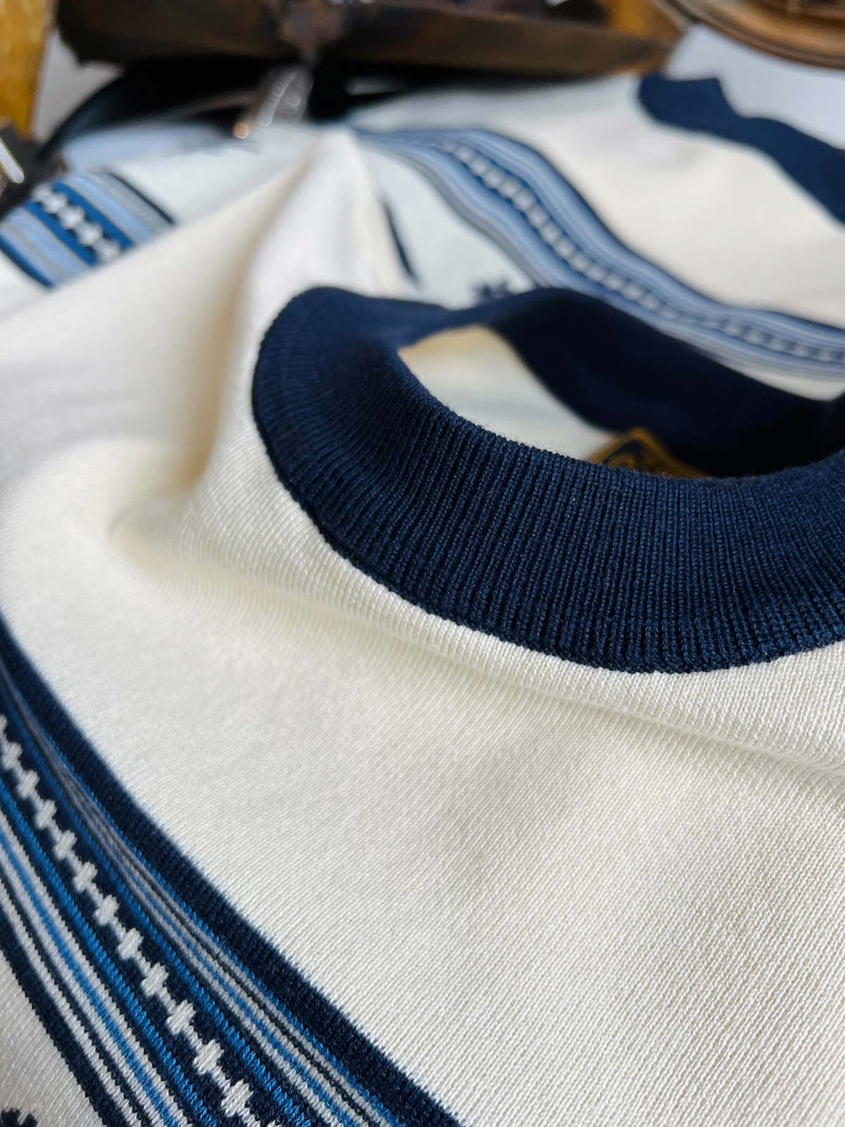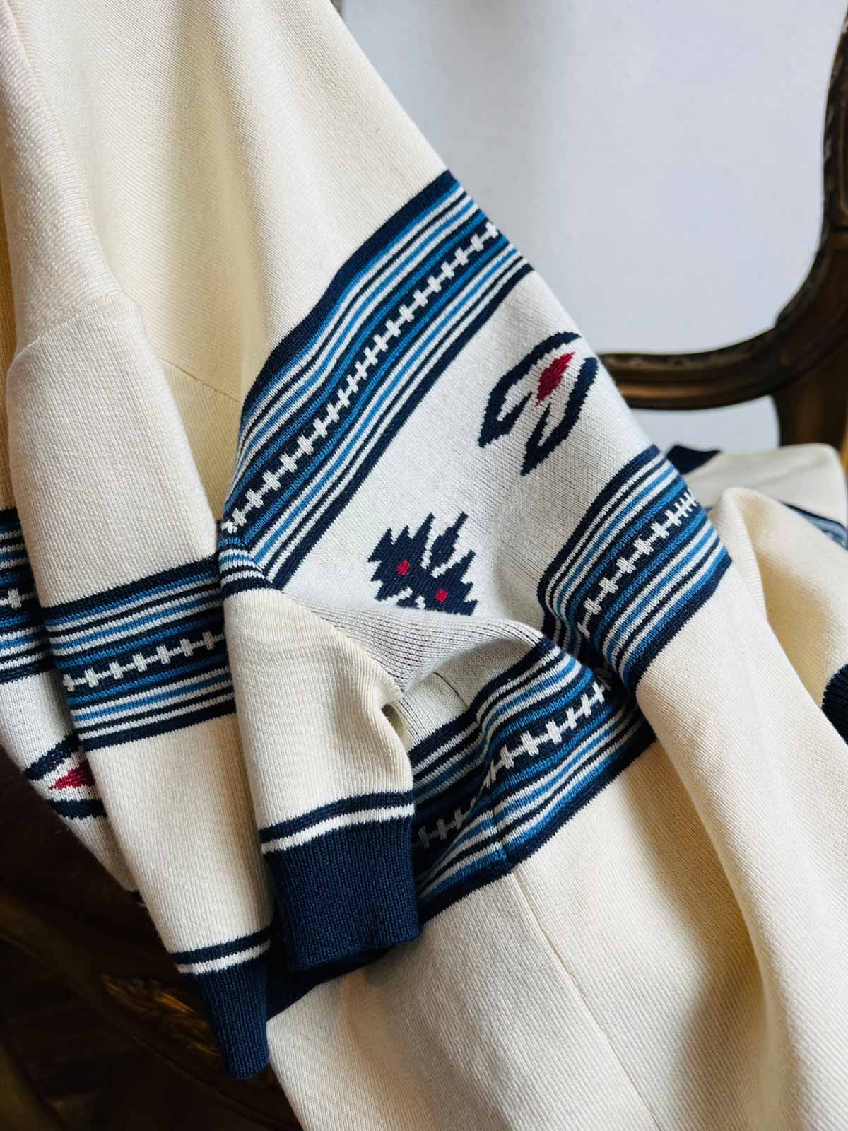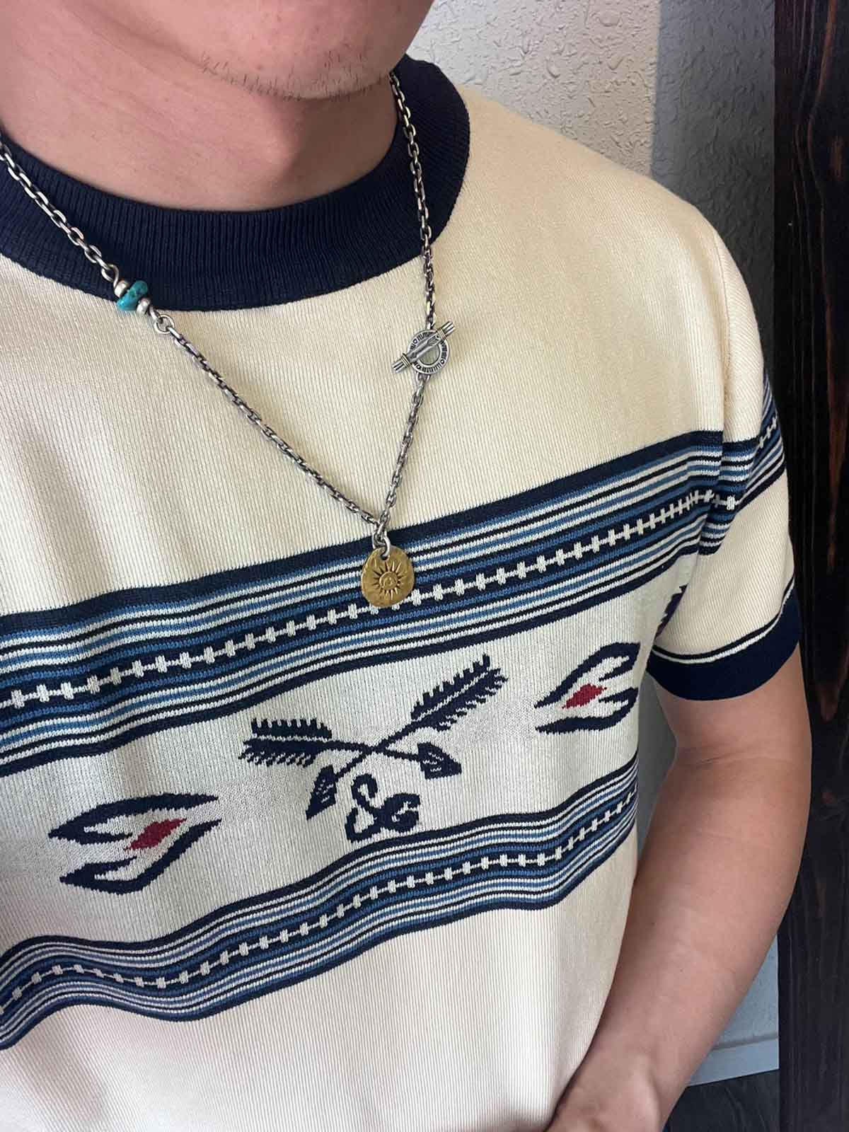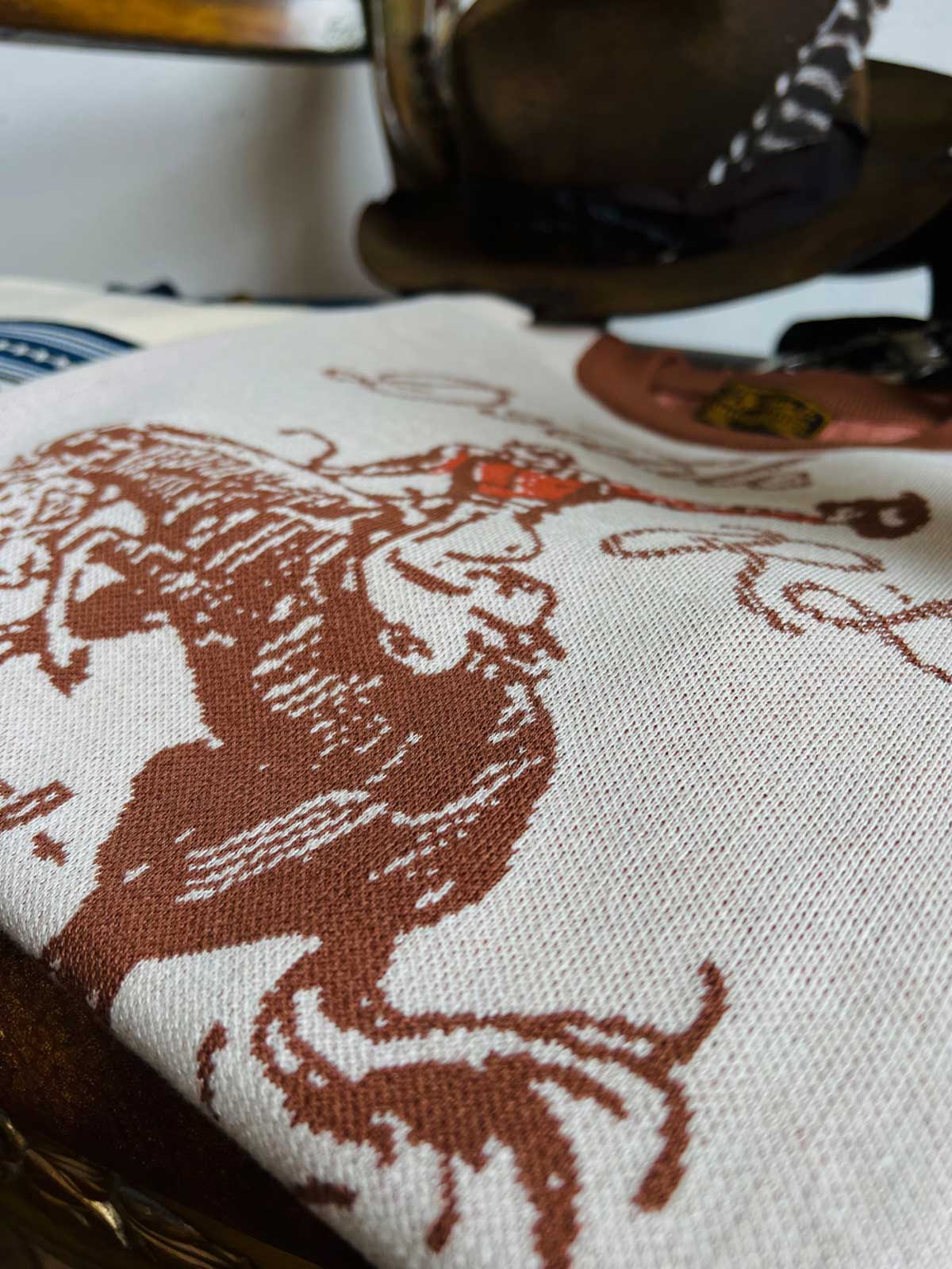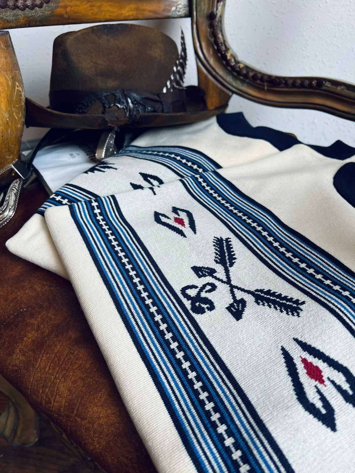 素材は高品質のニット生地を使用し、緻密なナバホとカウボーイの模様が刺繍で表現されています。この技法は、Tシャツに独特の質感と視覚的な魅力を加え、耐久性と快適性を兼ね備えています。
