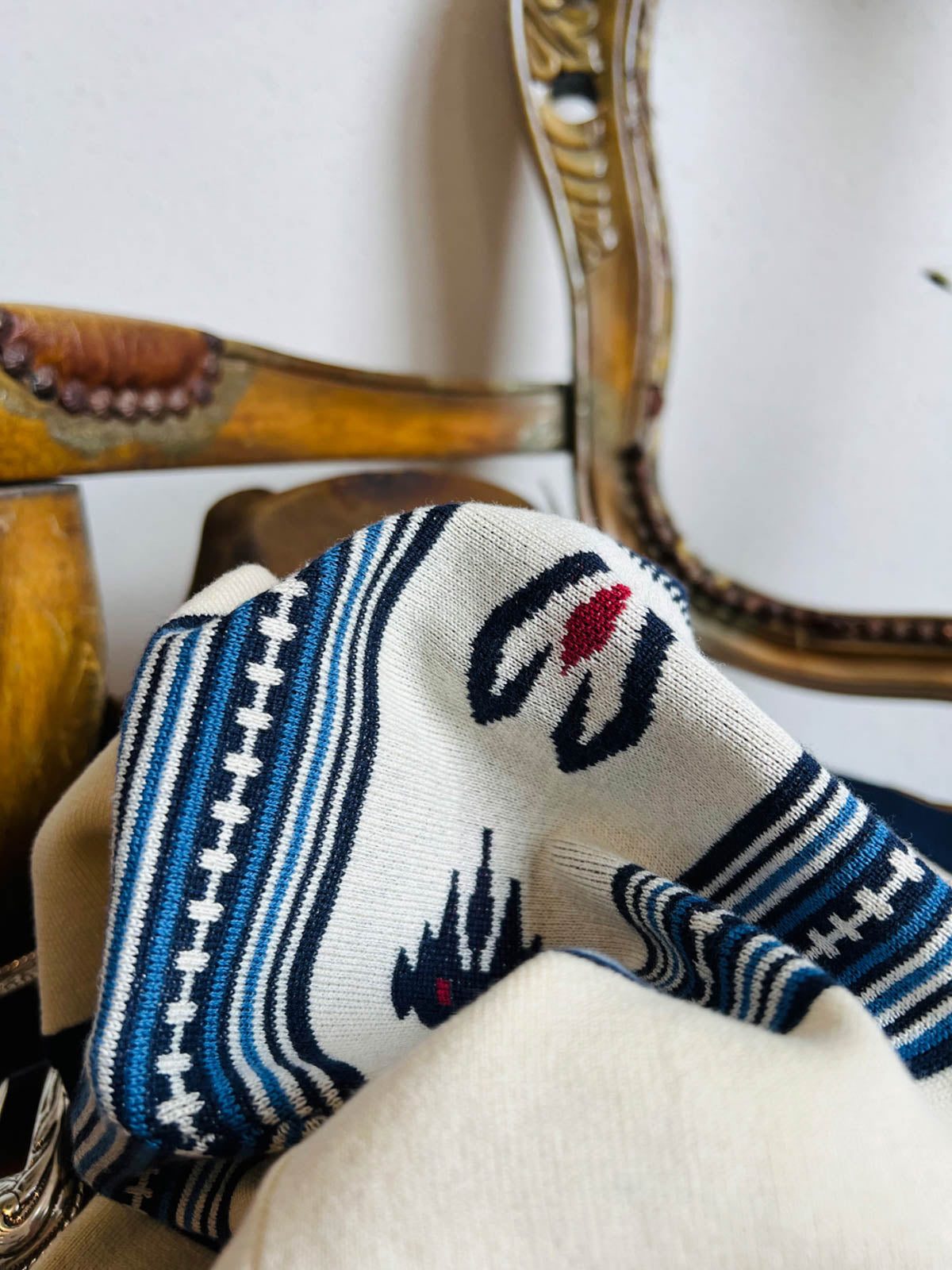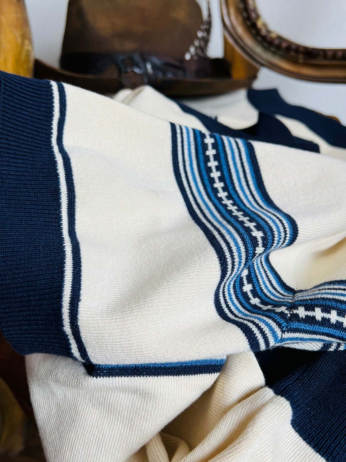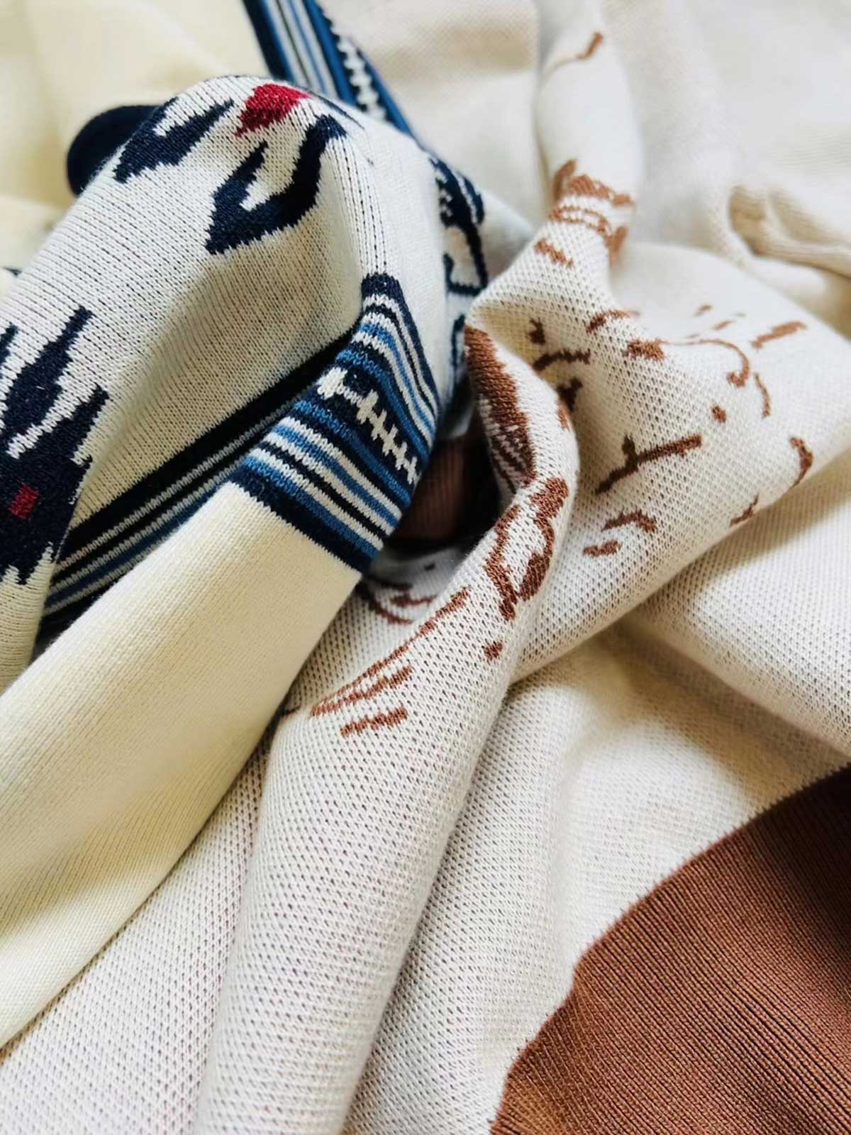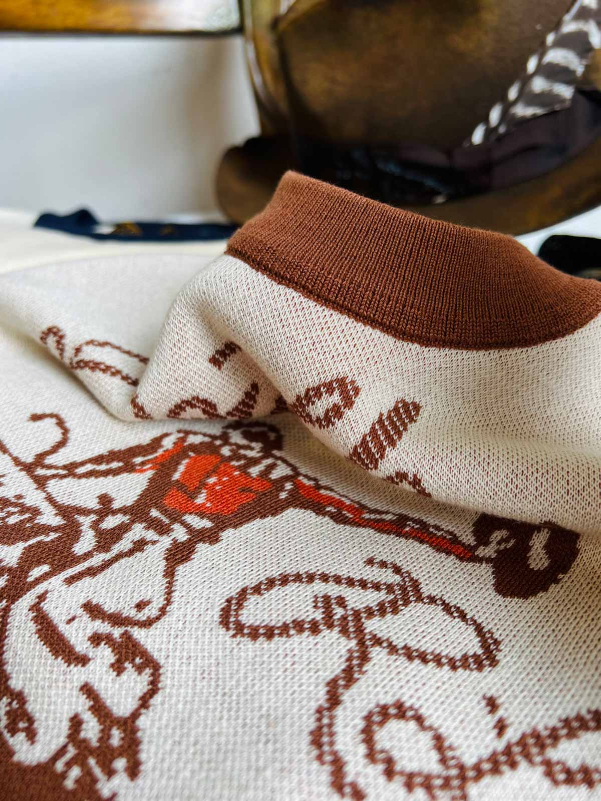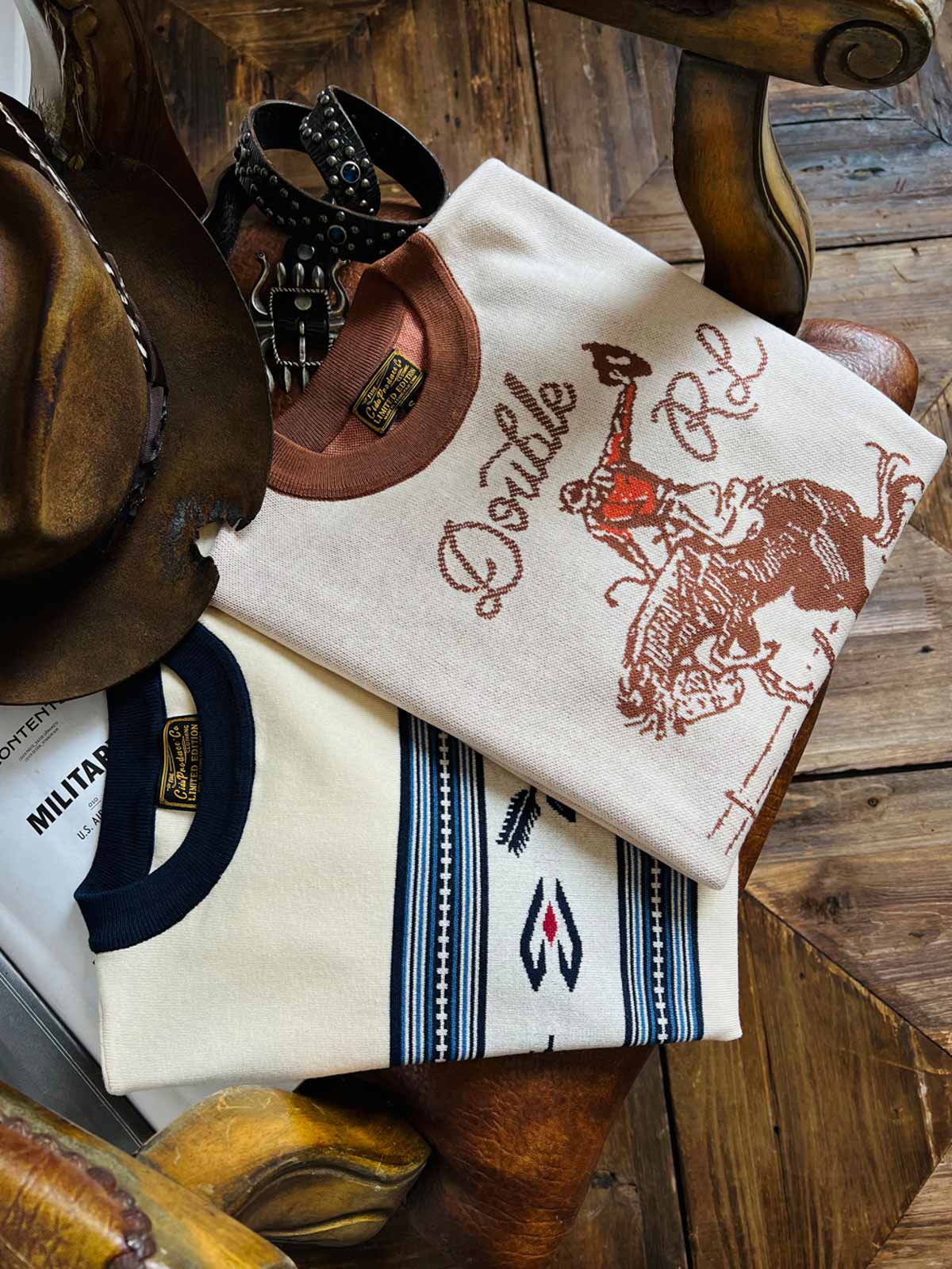 素材は高品質のニット生地を使用し、緻密なナバホとカウボーイの模様が刺繍で表現されています。この技法は、Tシャツに独特の質感と視覚的な魅力を加え、耐久性と快適性を兼ね備えています。
