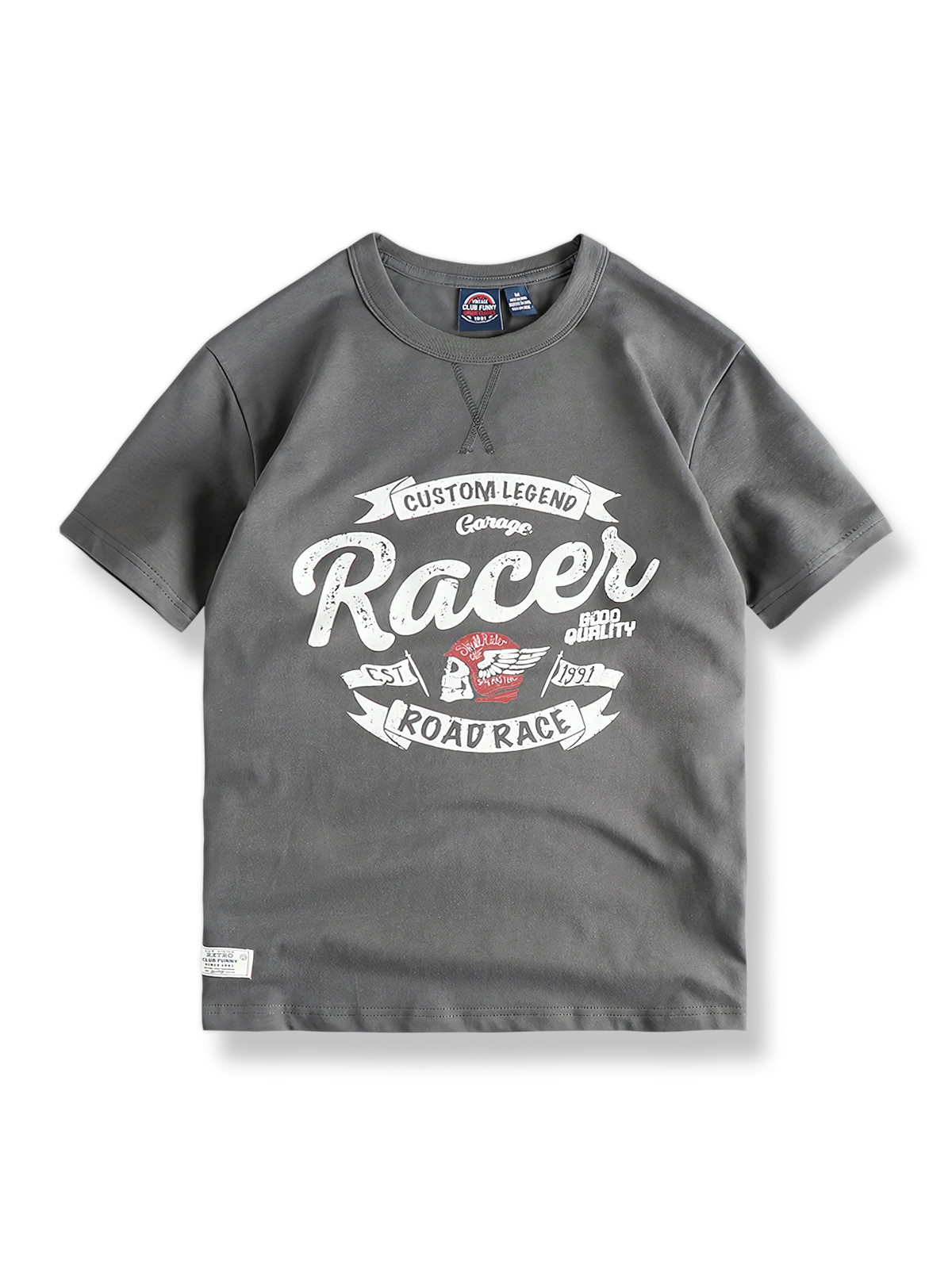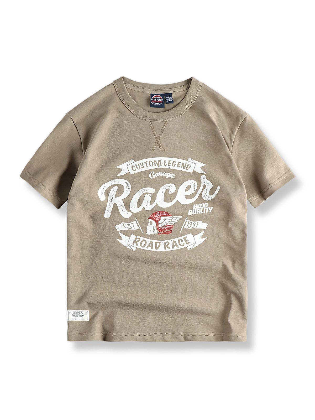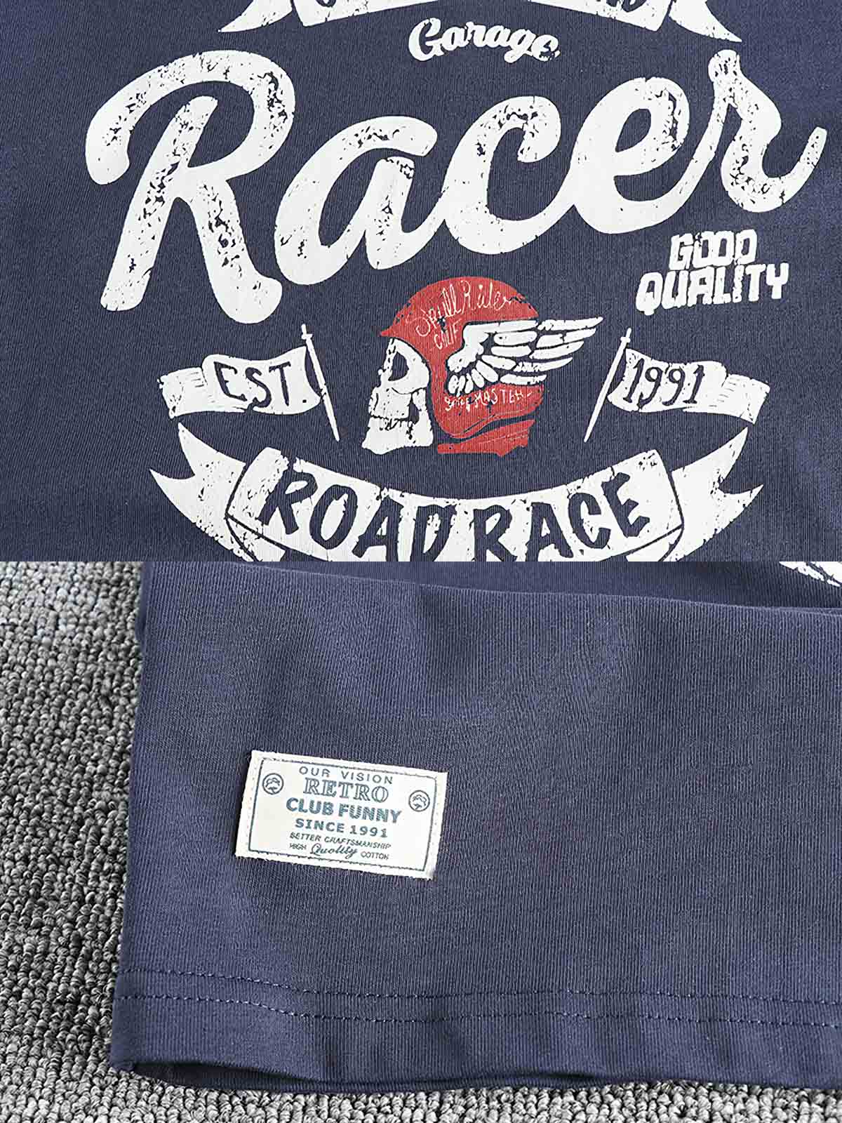 このTシャツはヴィンテージモーターレースにインスピレーションを得ており、スカルとラフなフォントデザインが自由で大胆なライフスタイルを表現しています。古いレースカルチャーへの懐かしさとスピードへの情熱を象徴するスカルとレースのトーテムが、デザインに深みを加えます。