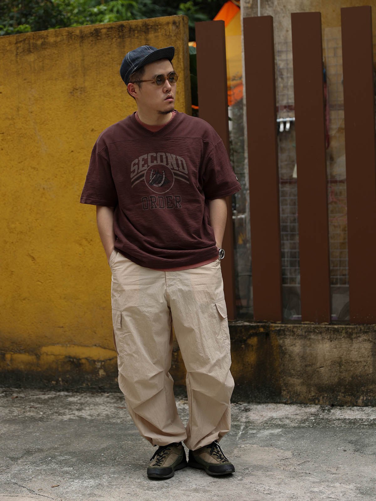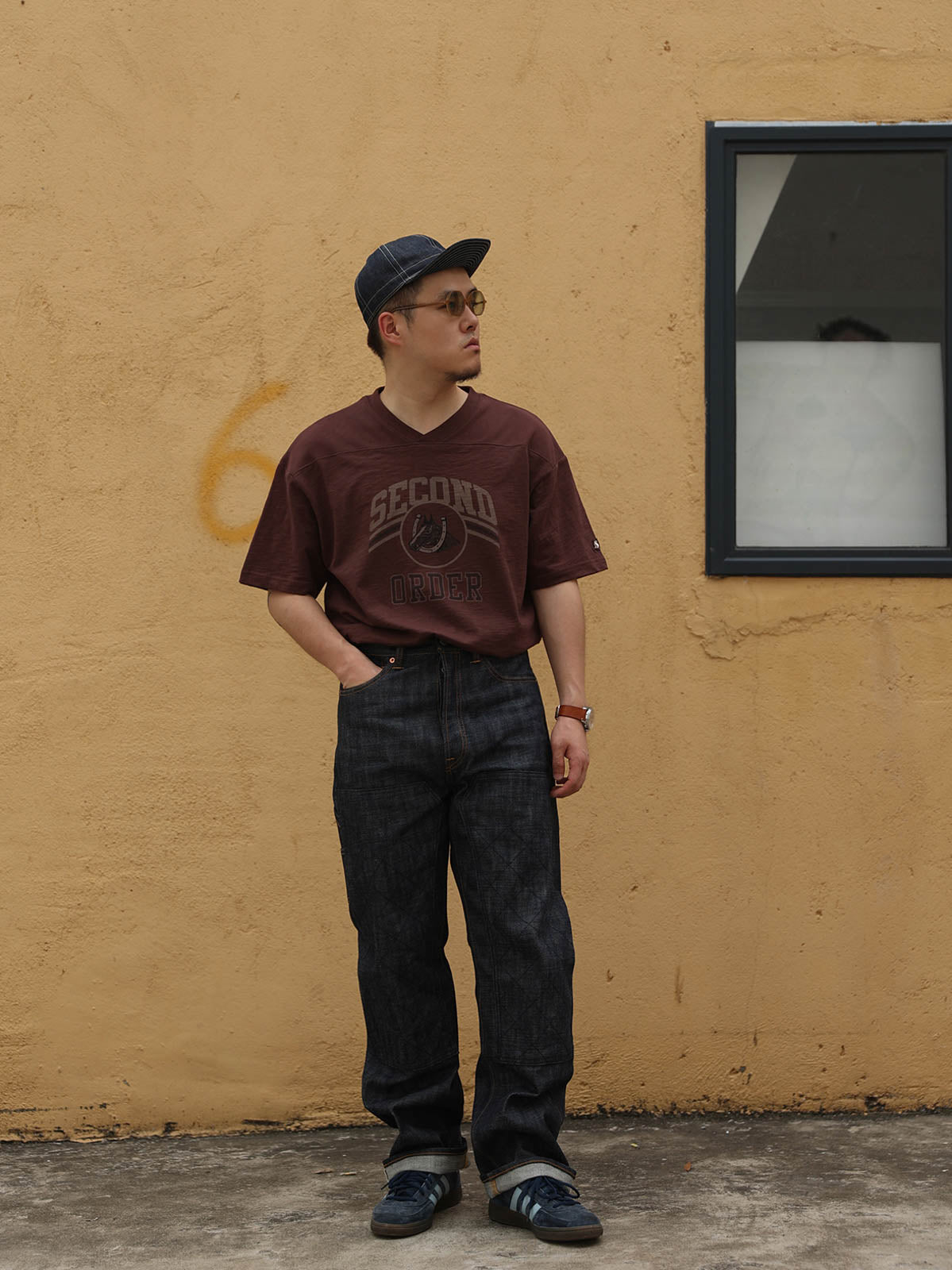 このTシャツは1980年代のアメリカンフットボールユニフォームからインスパイアされたデザインで、260グラムのスラブコットン(シーアイランドコットン)素材を使用しています。スラブの質感があり、手触りは柔らかく、通気性と吸汗性に優れ、夏にぴったりのアイテムです。全体的にややルーズなシルエットで、肩部分のパネルデザインを改良し、より快適で動きやすい設計となっています。胸にはレトロなダイレクトプリントを施し、独特のデザイン性を強調しています。カラーはブラウンとブルーの2色展開で、単独でもインナーとしても幅広いスタイリングに対応します。コーディネート提案:スポーツショーツやデニムと合わせて、ファッショナブルでレトロなスポーティカジュアルスタイルを示します。