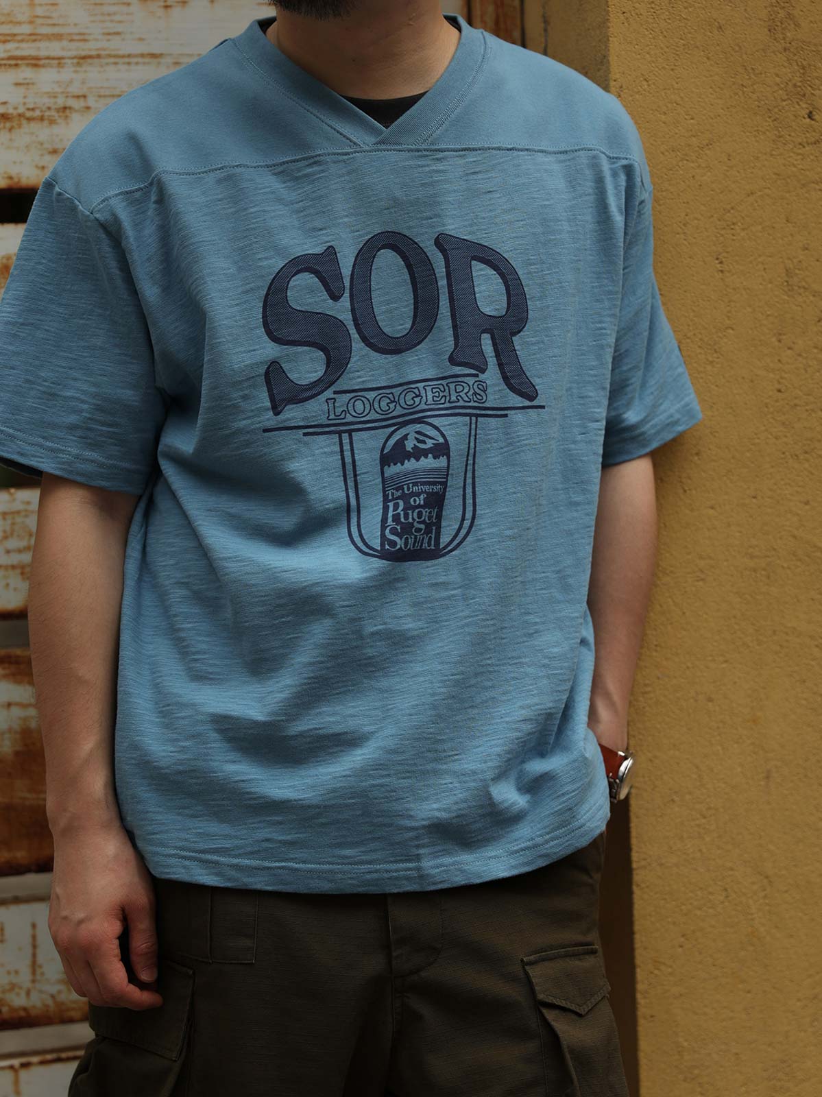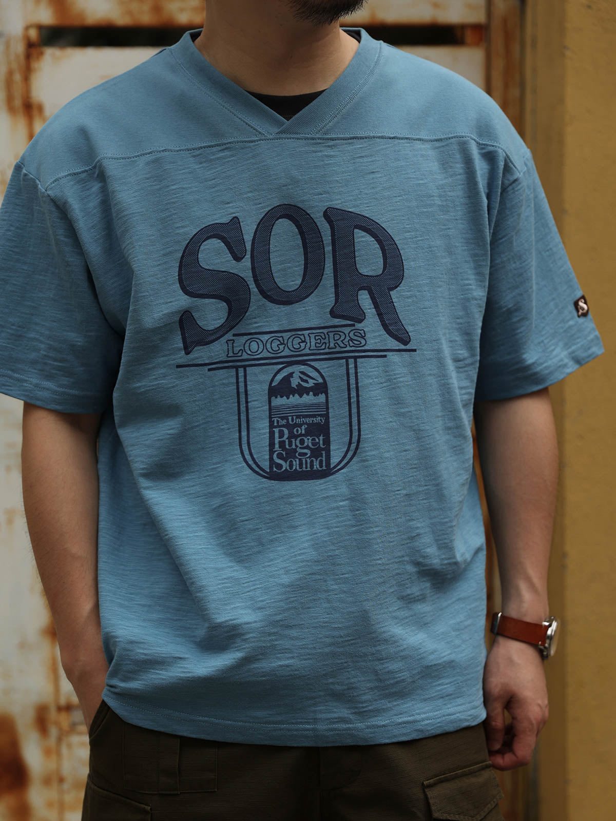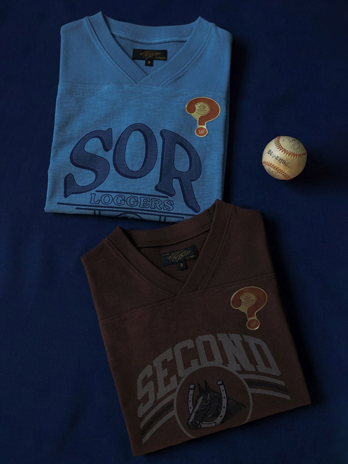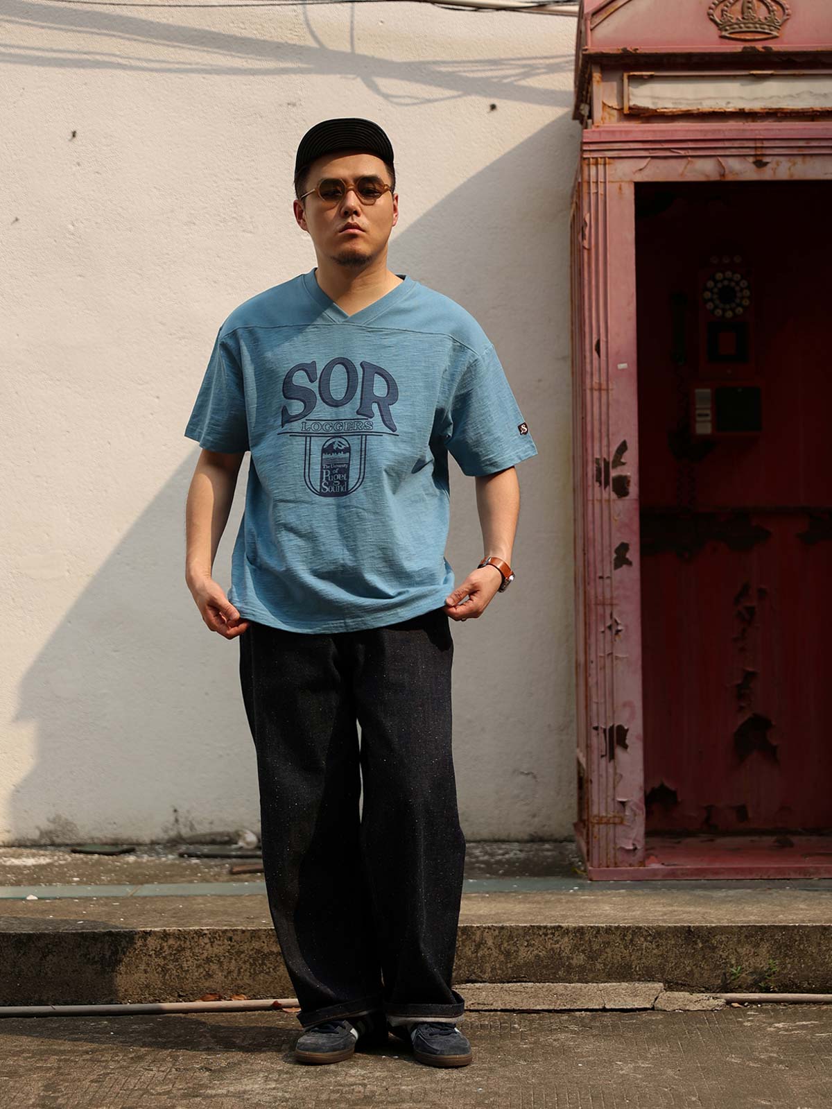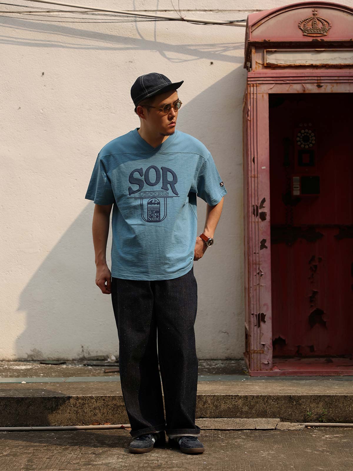 1980年代のアメリカンフットボールユニフォームにインスパイアされた、260gのスラブコットン素材を使用したレトロでスポーティなVネックTシャツ。
