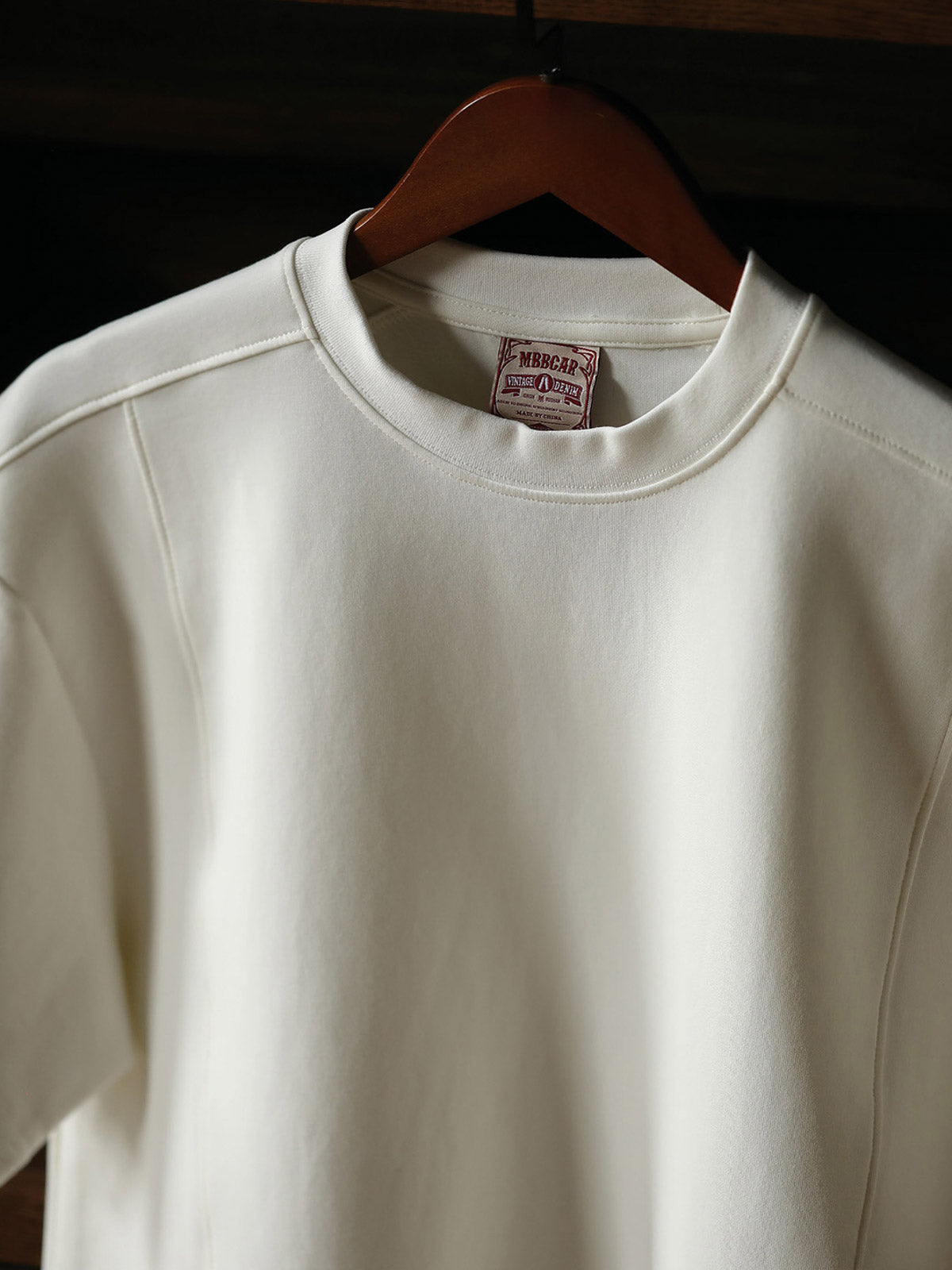 このショートスリーブTシャツは、リキッドアンモニア加工を施したエアコットン素材を使用しており、滑らかな質感と軽い伸縮性があります。バンドカラーデザインとショートワイドシルエットが組み合わさり、すっきりとした着こなしが可能です。肩と背中のアーチ型ステッチが立体感と流動感を加えています。アイボリーとヘイズブルーの2つのレトロな色調が、夏のリラックススタイルに最適です。