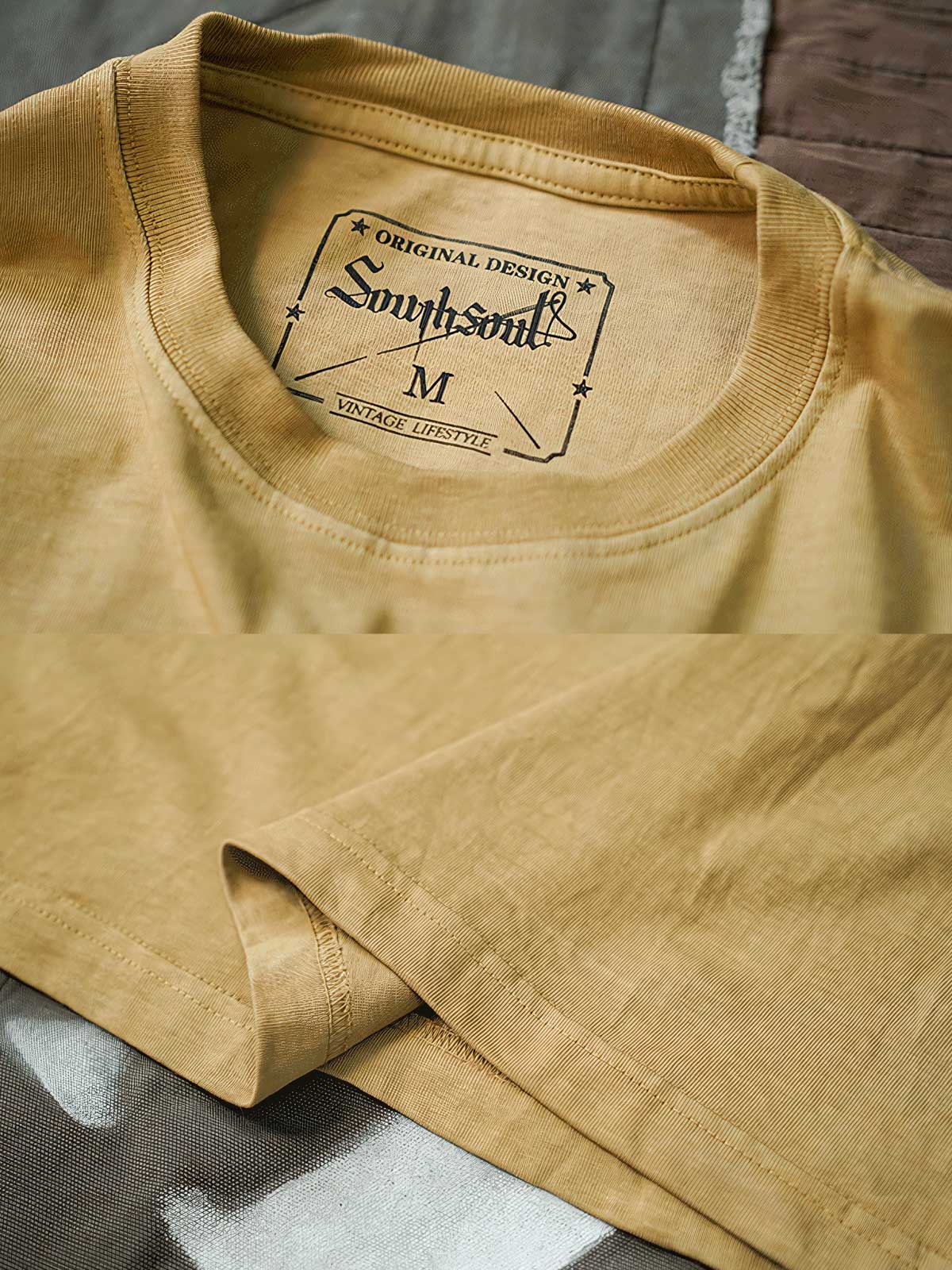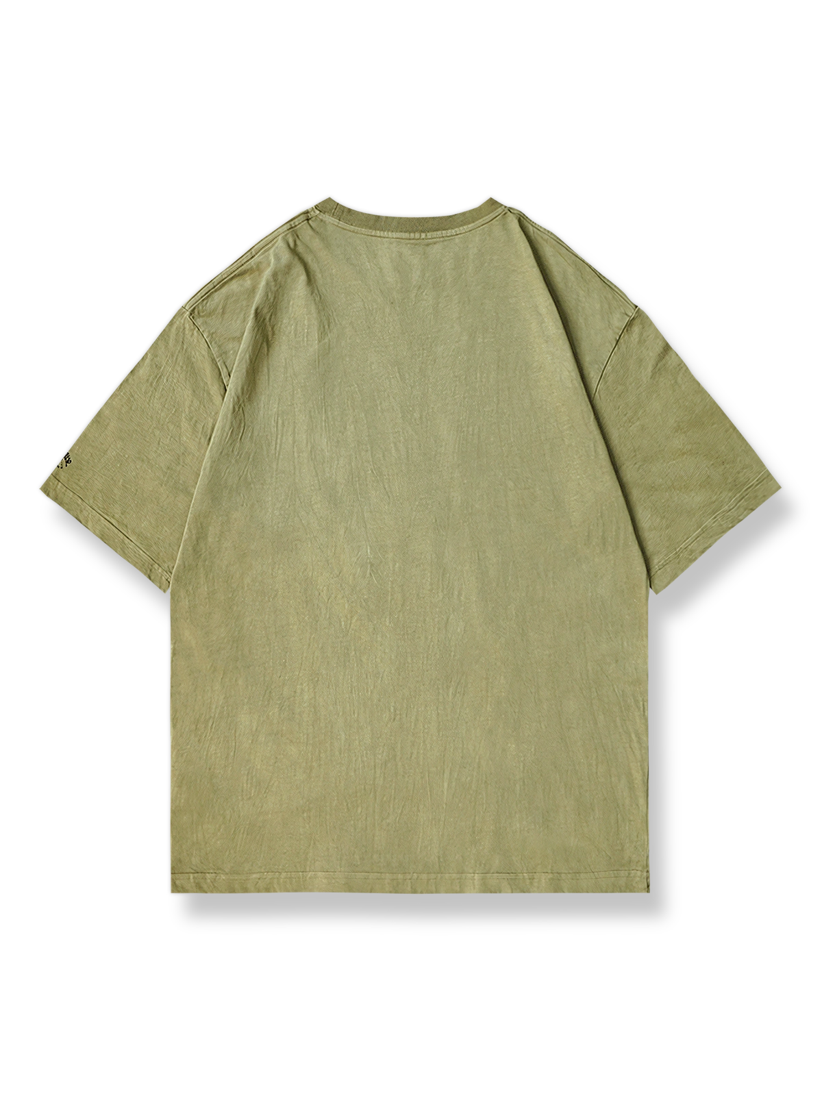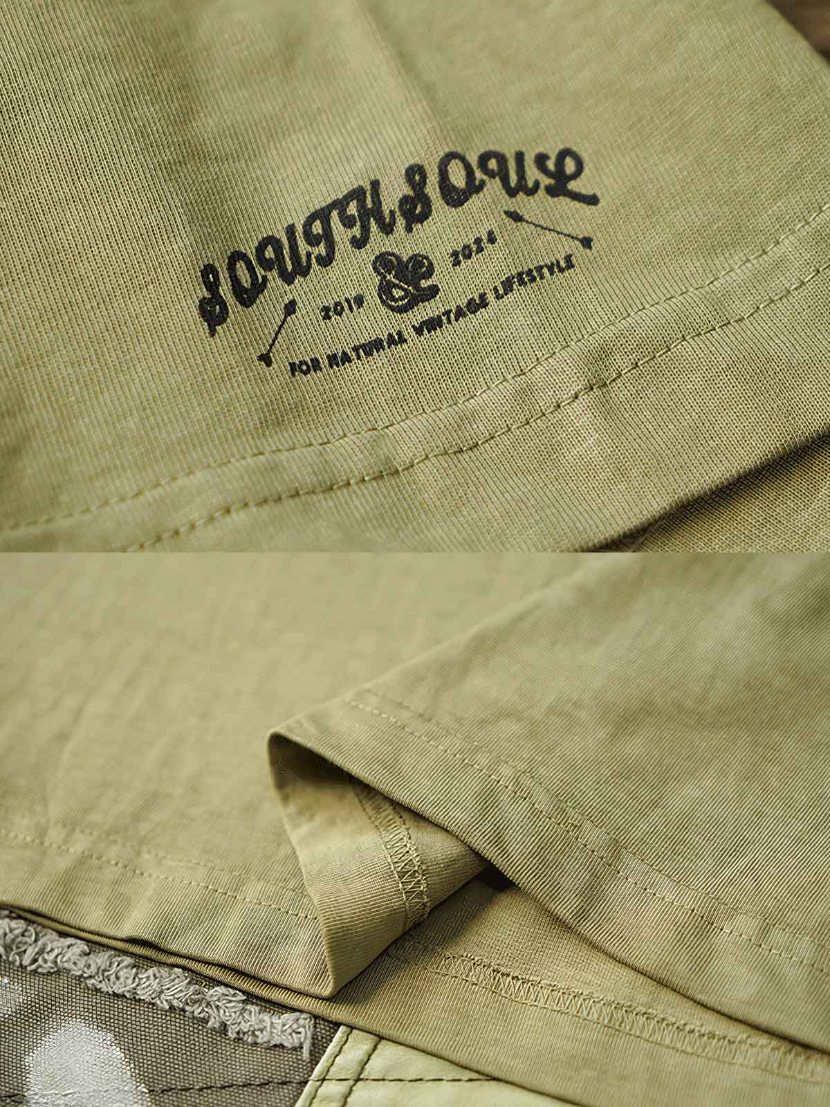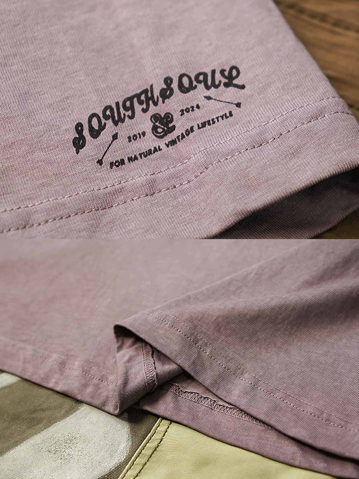 このTシャツは、260gのコットンダブルガーゼ生地を使用しており、厚みがあり耐久性と快適性を兼ね備えています。ヴィンテージ風デザインで、ハンドメイドのシルクスクリーンプリントと植物染色技術が特徴です。各Tシャツは手作業で染色されるため、独特の色と柄があり、すべてが唯一無二の作品です。天然植物染料を使用しているため、安心して着用できます。ルーズなフィット感で、日常のカジュアルスタイルやアウトドア活動に最適です。