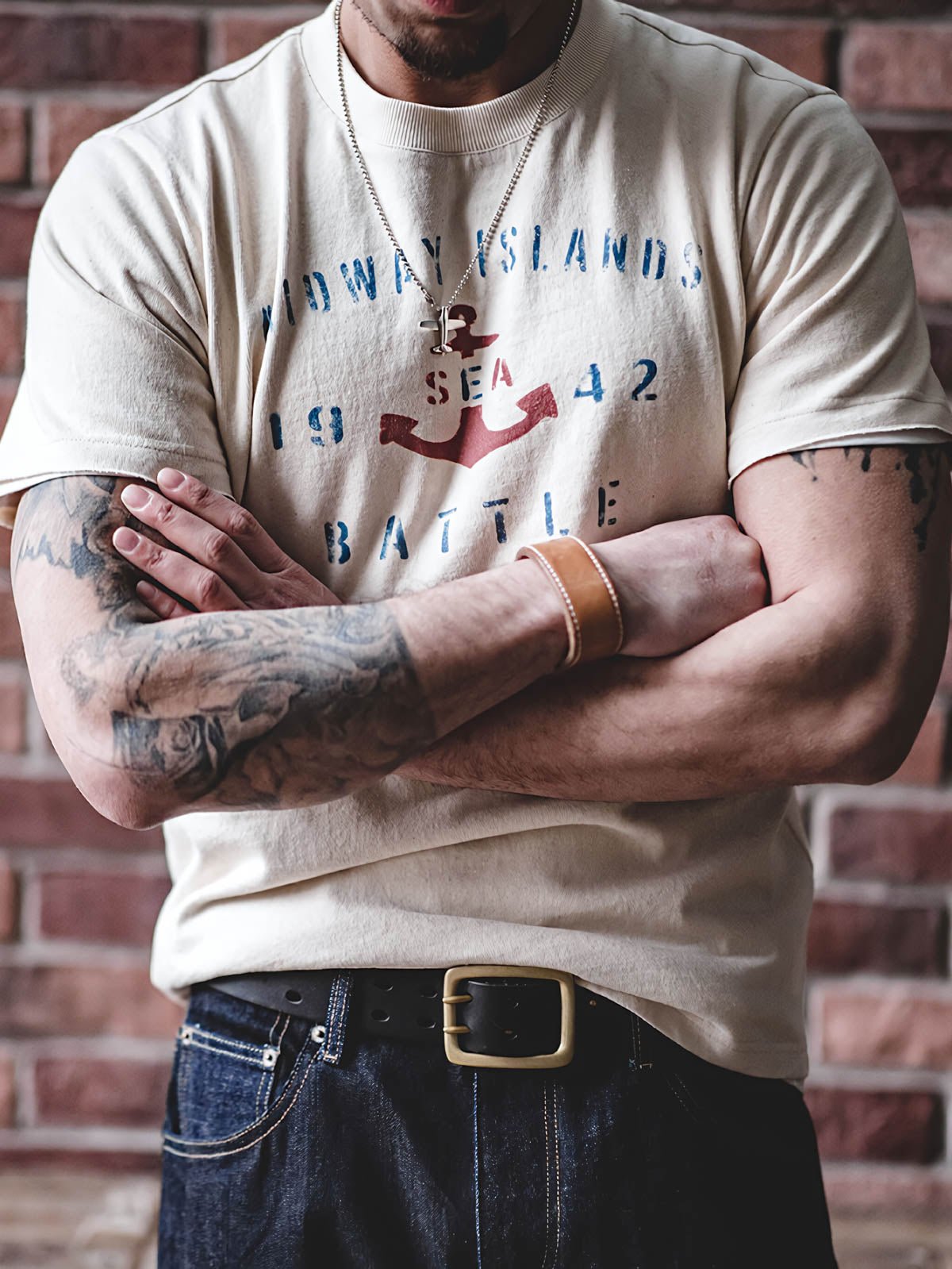 このTシャツは、航海探検のロマンスにインスピレーションを得てデザインされています。船の錨のデザインと「BATTLE」という言葉が特徴で、挑戦に直面する勇気と持続力を象徴しています。ヴィンテージ風のプリントは、広大な海を旅する探検家のイマジネーションを掻き立てる海図のような物語性を持っています。