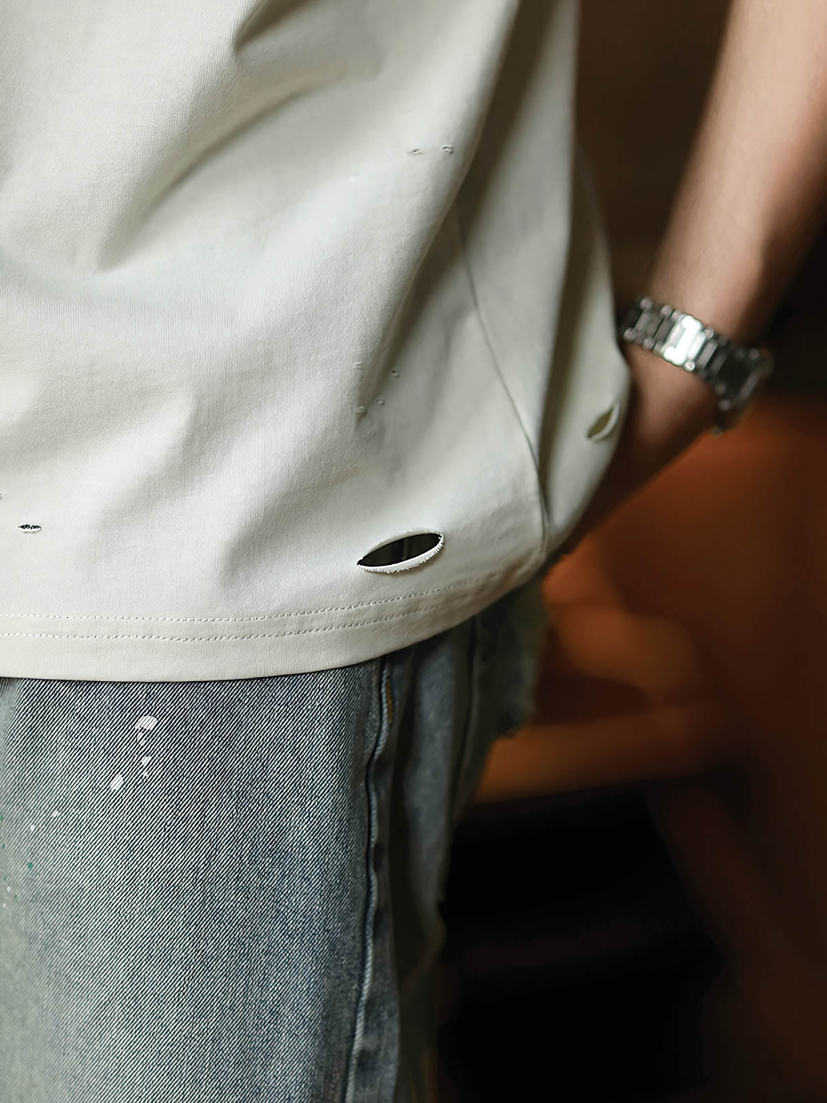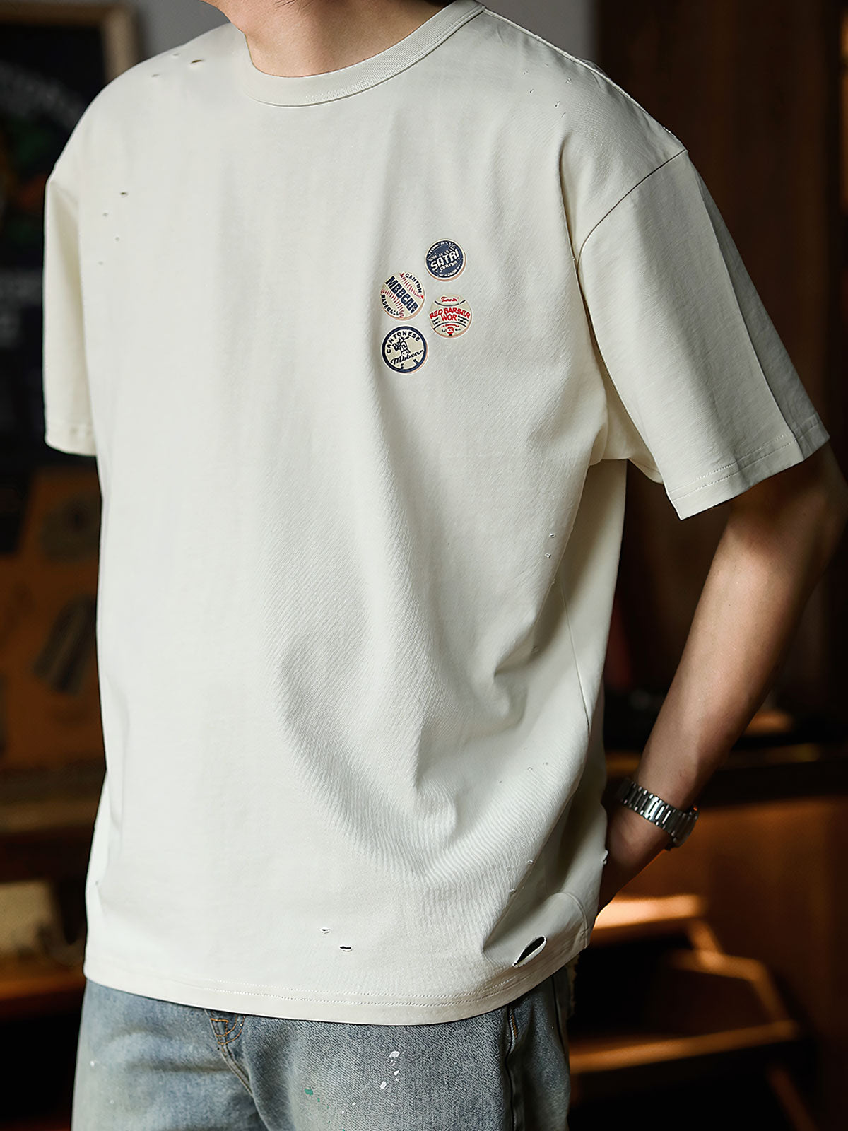 先進的なプリント技術と、手作業によるダメージ加工が施され、各々のTシャツに独特のヴィンテージ感をもたらしています。ミルクティーホワイトの色調と耐久性に優れたダブルステッチのリブが、スタイルと快適性を同時に提供します。