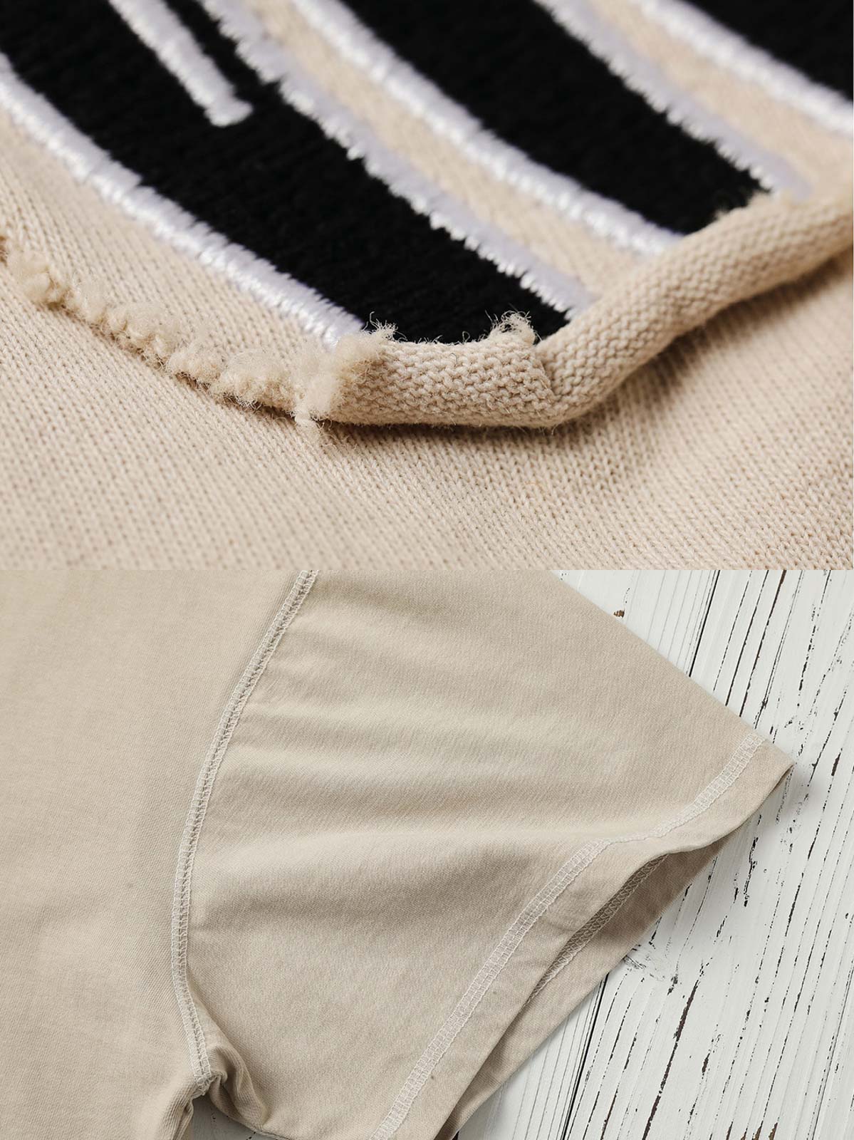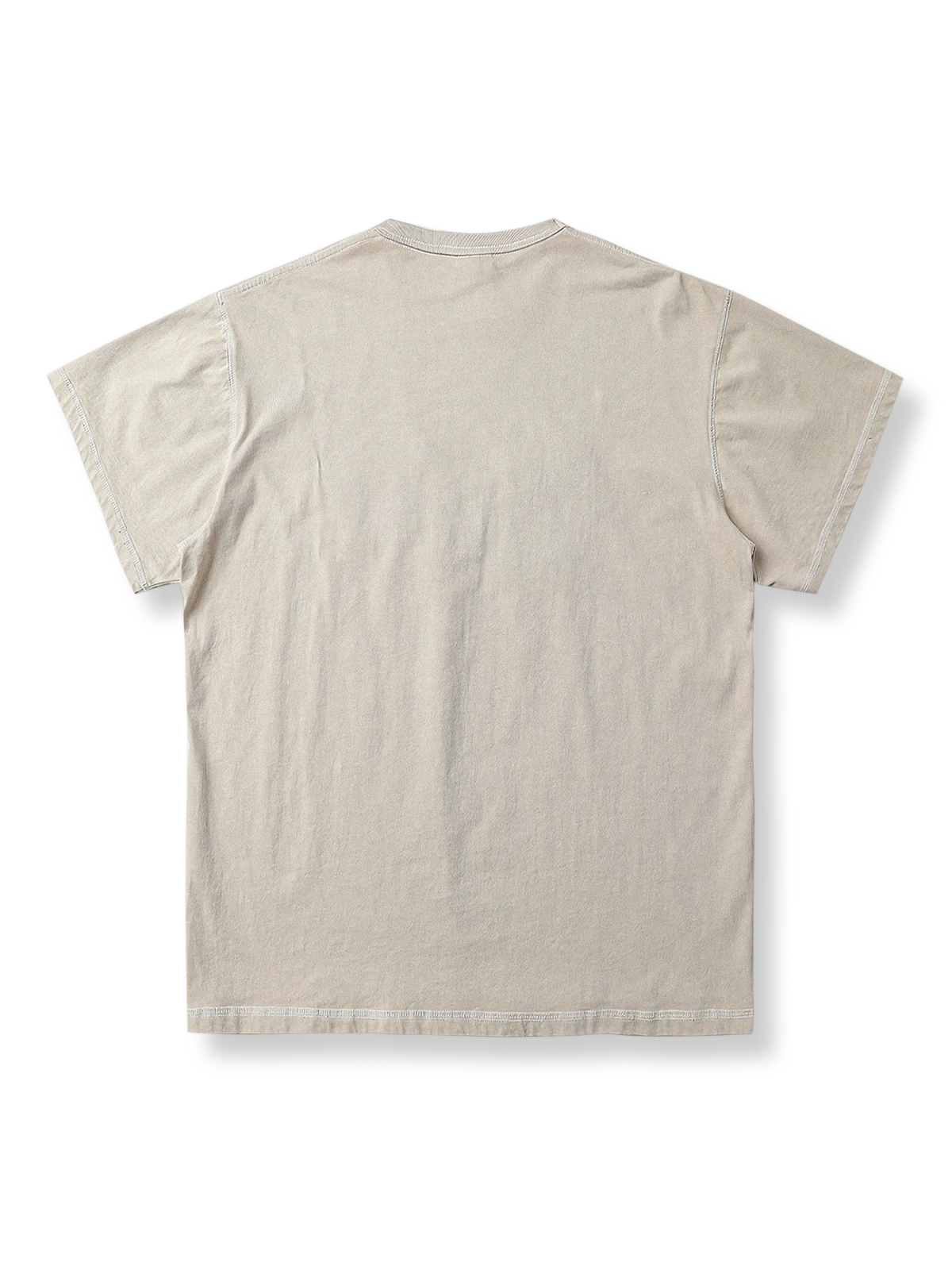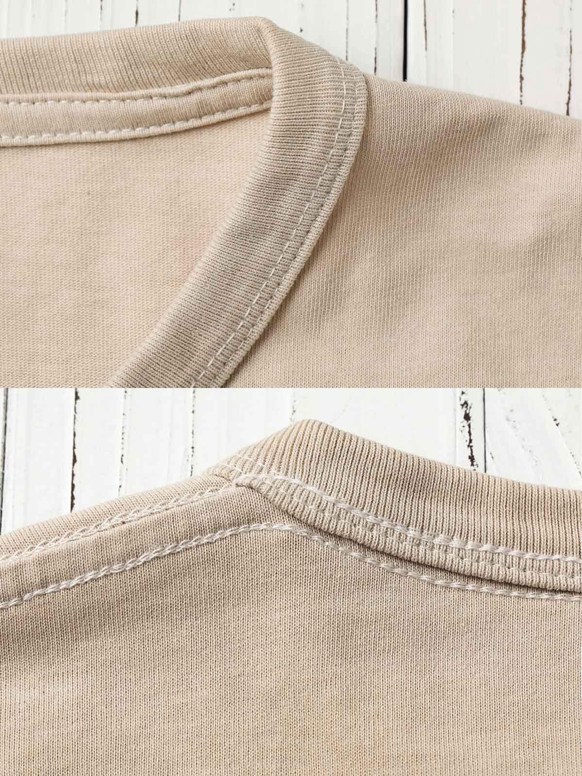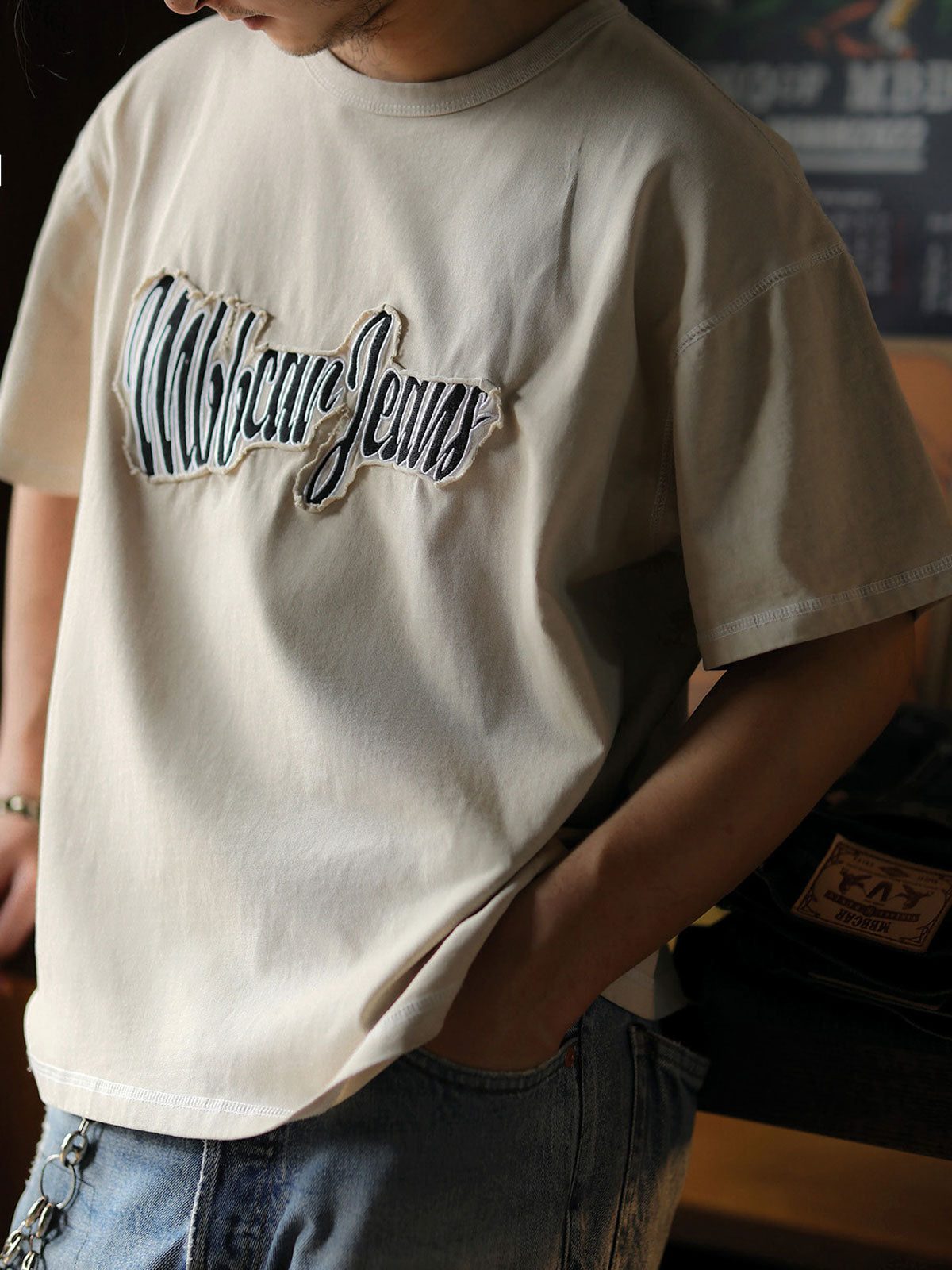 このTシャツは、260グラムの32番糸コットン素材を使用しており、ワックス染めと後染め加工が施されています。そのため、独特の軽いムラ感とヴィンテージ風の仕上がりになっています。パッチ刺繍技術により、洗濯後にパッチが自然に巻き上がり、レトロな雰囲気を強調します。目立つコントラストステッチデザインが層次感を増し、ショートワイドフィットとウエストシェイプカットが裾の広がりを防ぎます。32番糸素材は柔らかく肌に優しく、弾力と質感を兼ね備えています。260グラムの厚さが細やかな手触りと優れた通気性を提供します。リブネック加工は二重ステッチで縫製され、しっかりとして変形しにくいです。袖口と裾、アームホールにはハンドメイド感の強いカンハ刺繍技法が使われています。