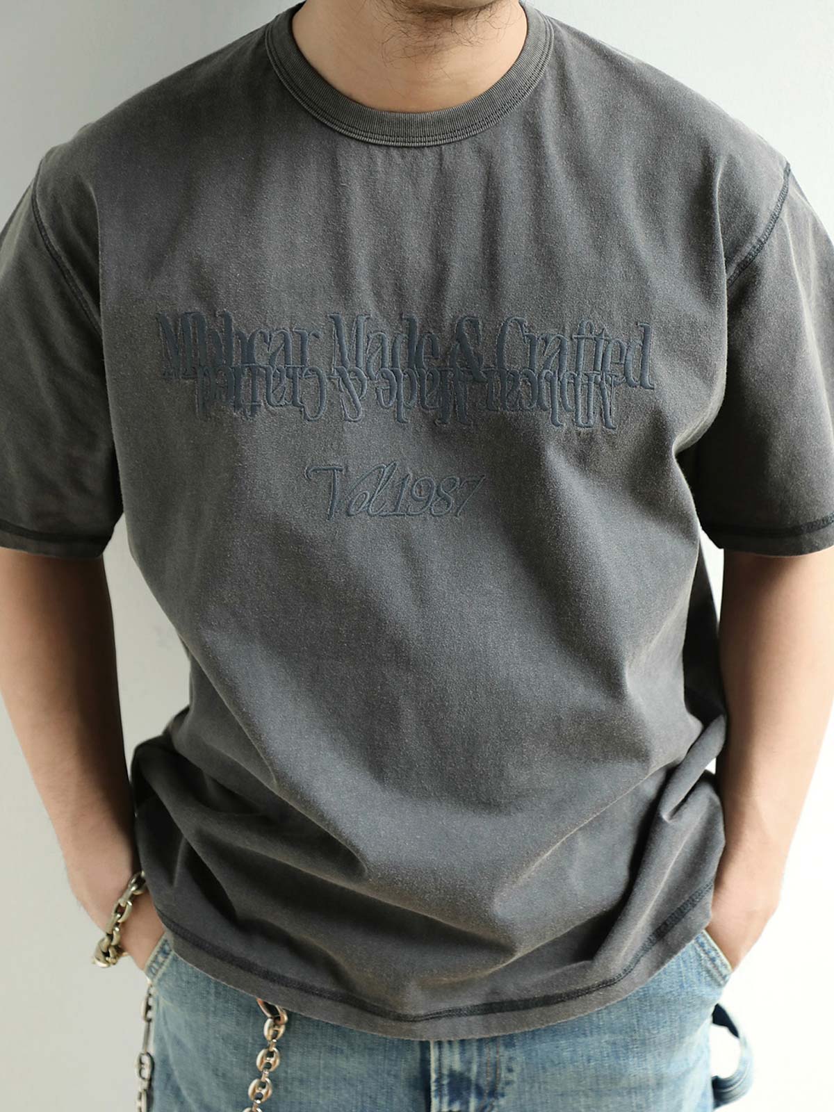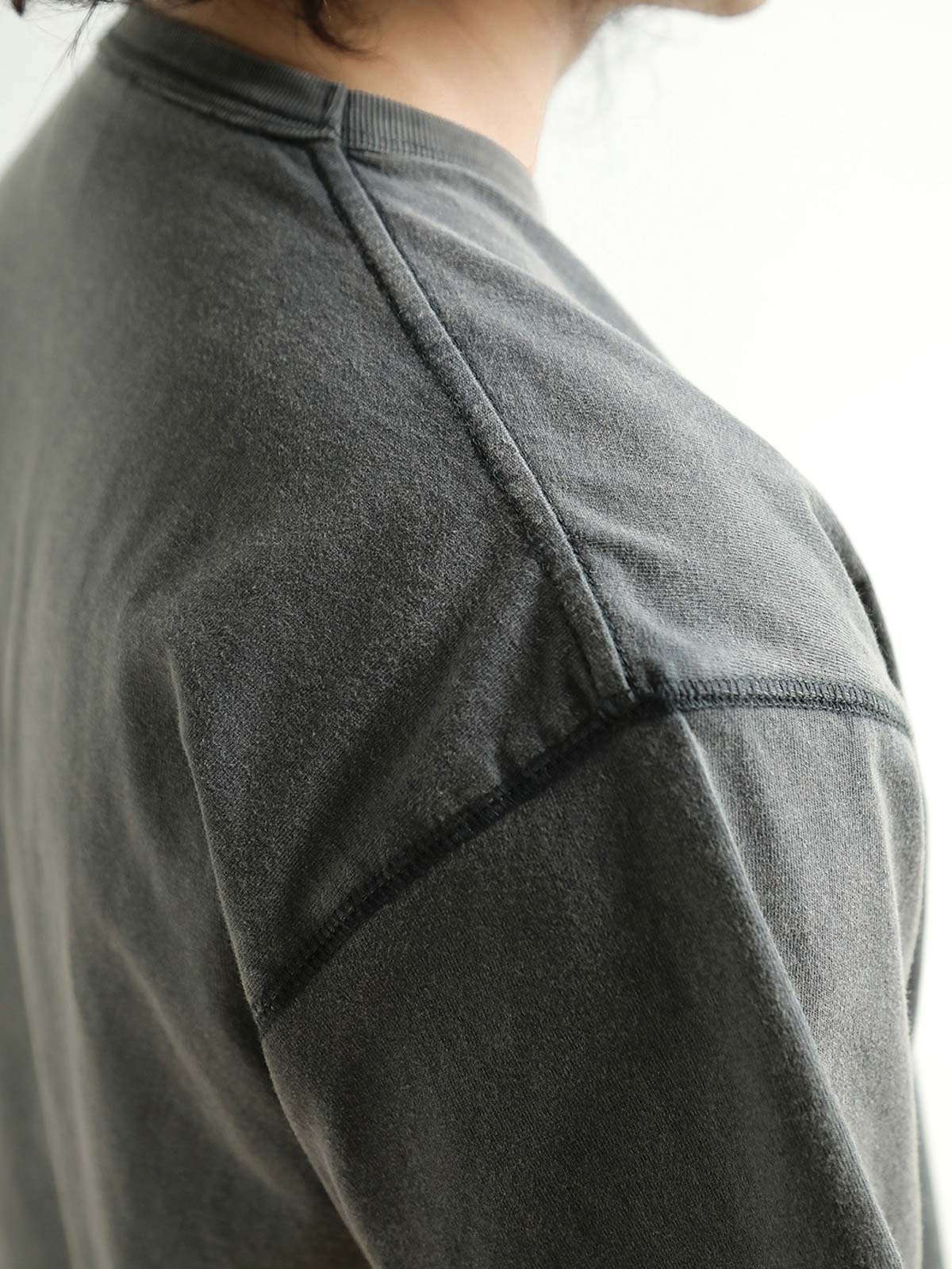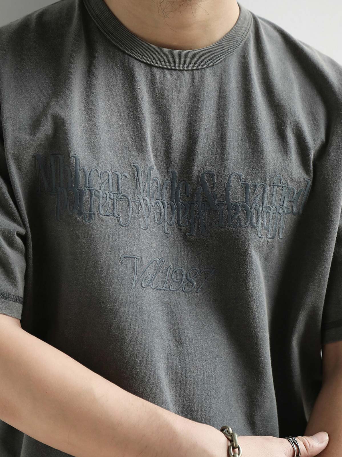 このヴィンテージ風のウォッシュドスノーフレーク半袖Tシャツは、280g/m²の高密度コットンプラットニット生地を使用し、製品はウォッシュ加工とスノーフレーク加工を施しています。生地表面にヴィンテージ風の質感があり、高い密度と強烈なテクスチャーを持っています。高密度の平刺繍のミラーイメージパターンが微かに見え、独特の質感を加えます。狭めの短いワイドフィットデザインで、ウエストを絞ったカッティングにより、裾が広がらないようになっています。リブネックデザインとダブルステッチで耐久性があり、袖口と裾にはカンハソ工法が施され、手作り感が漂います。肩と後襟のチェーンステッチで強化され、しっかりとした仕上がりになっています。