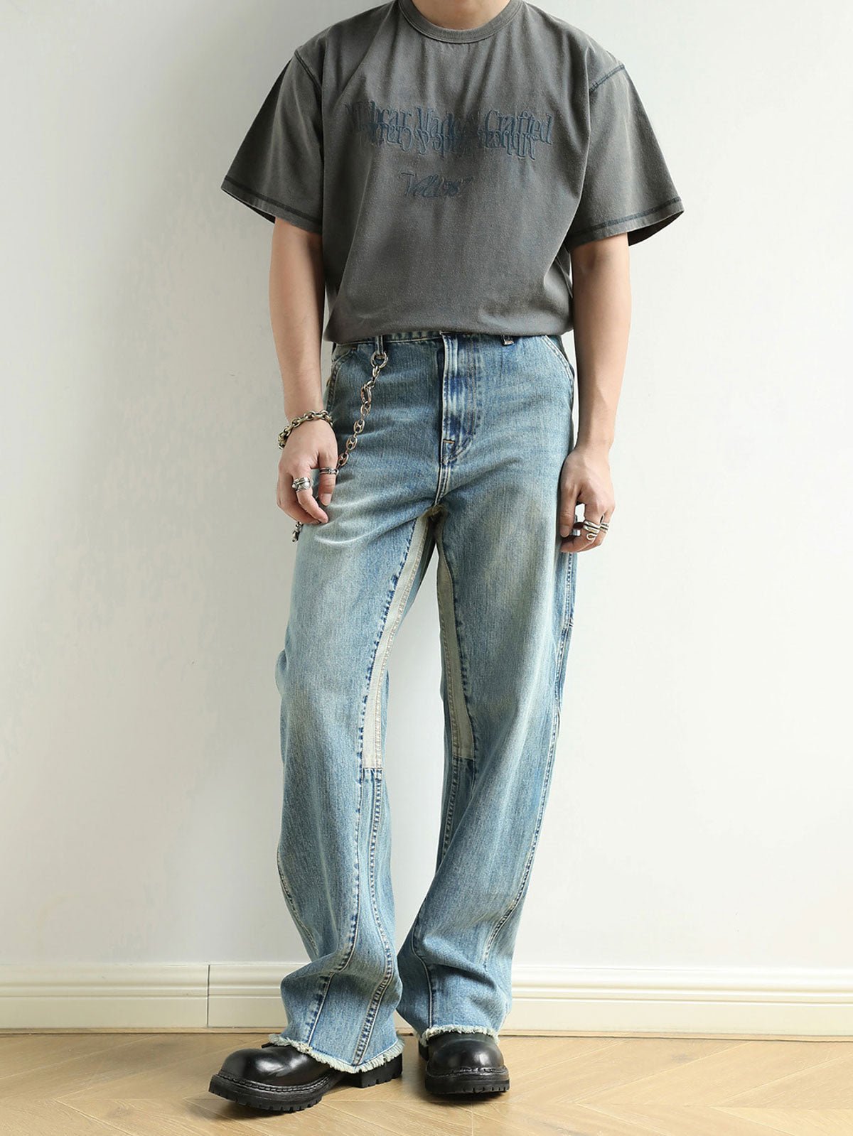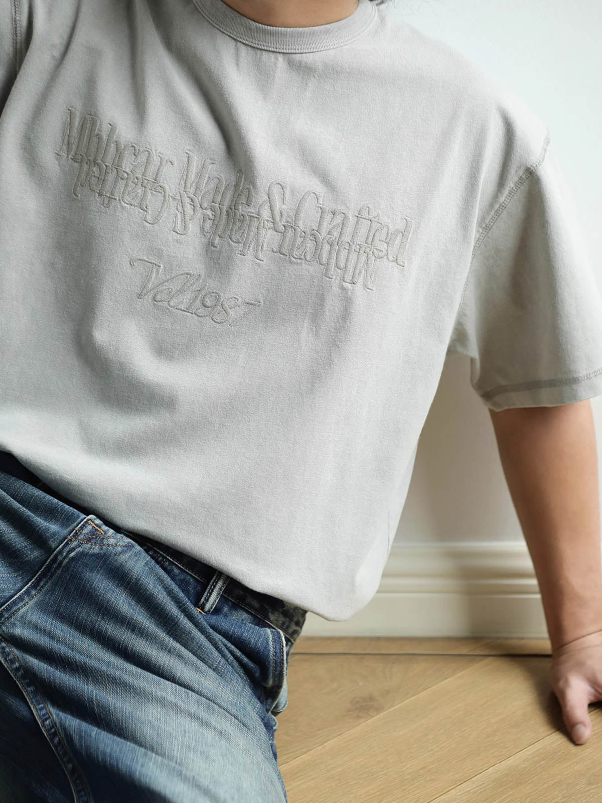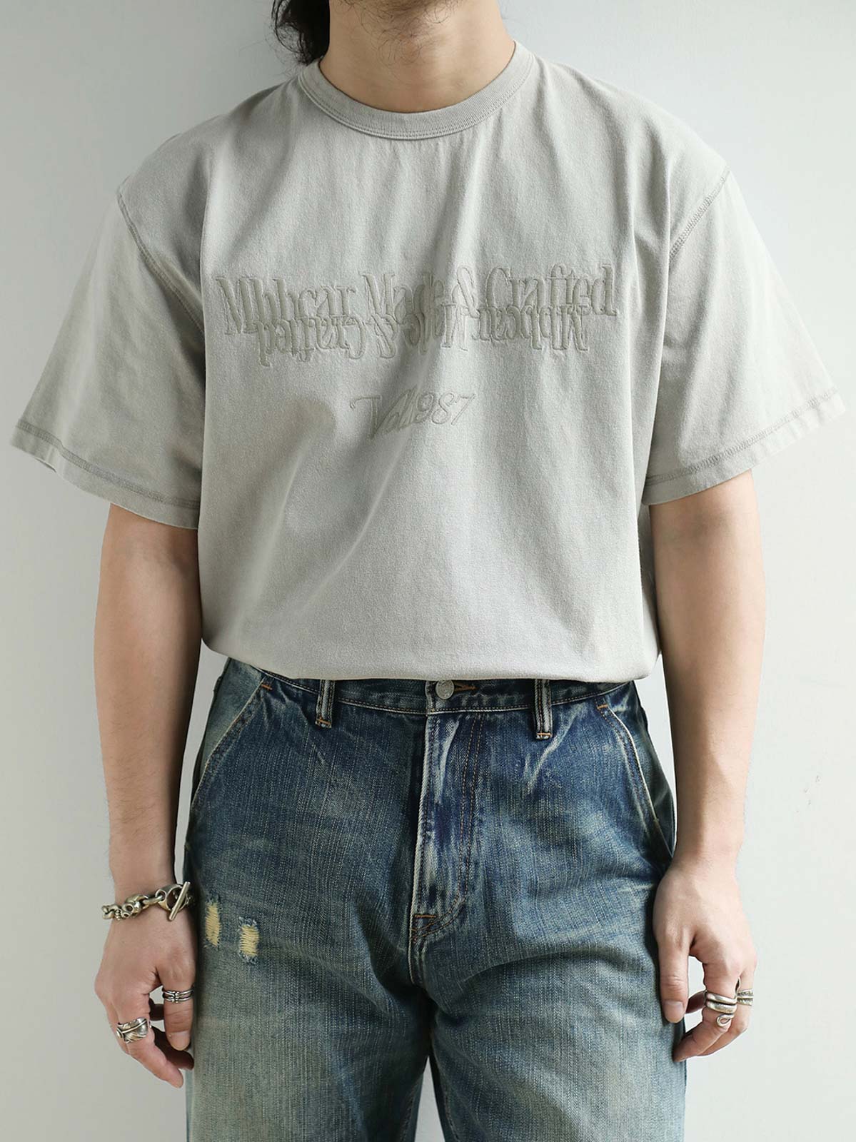 このヴィンテージ風のウォッシュドスノーフレーク半袖Tシャツは、280g/m²の高密度コットンプラットニット生地を使用し、製品はウォッシュ加工とスノーフレーク加工を施しています。生地表面にヴィンテージ風の質感があり、高い密度と強烈なテクスチャーを持っています。高密度の平刺繍のミラーイメージパターンが微かに見え、独特の質感を加えます。狭めの短いワイドフィットデザインで、ウエストを絞ったカッティングにより、裾が広がらないようになっています。リブネックデザインとダブルステッチで耐久性があり、袖口と裾にはカンハソ工法が施され、手作り感が漂います。肩と後襟のチェーンステッチで強化され、しっかりとした仕上がりになっています。