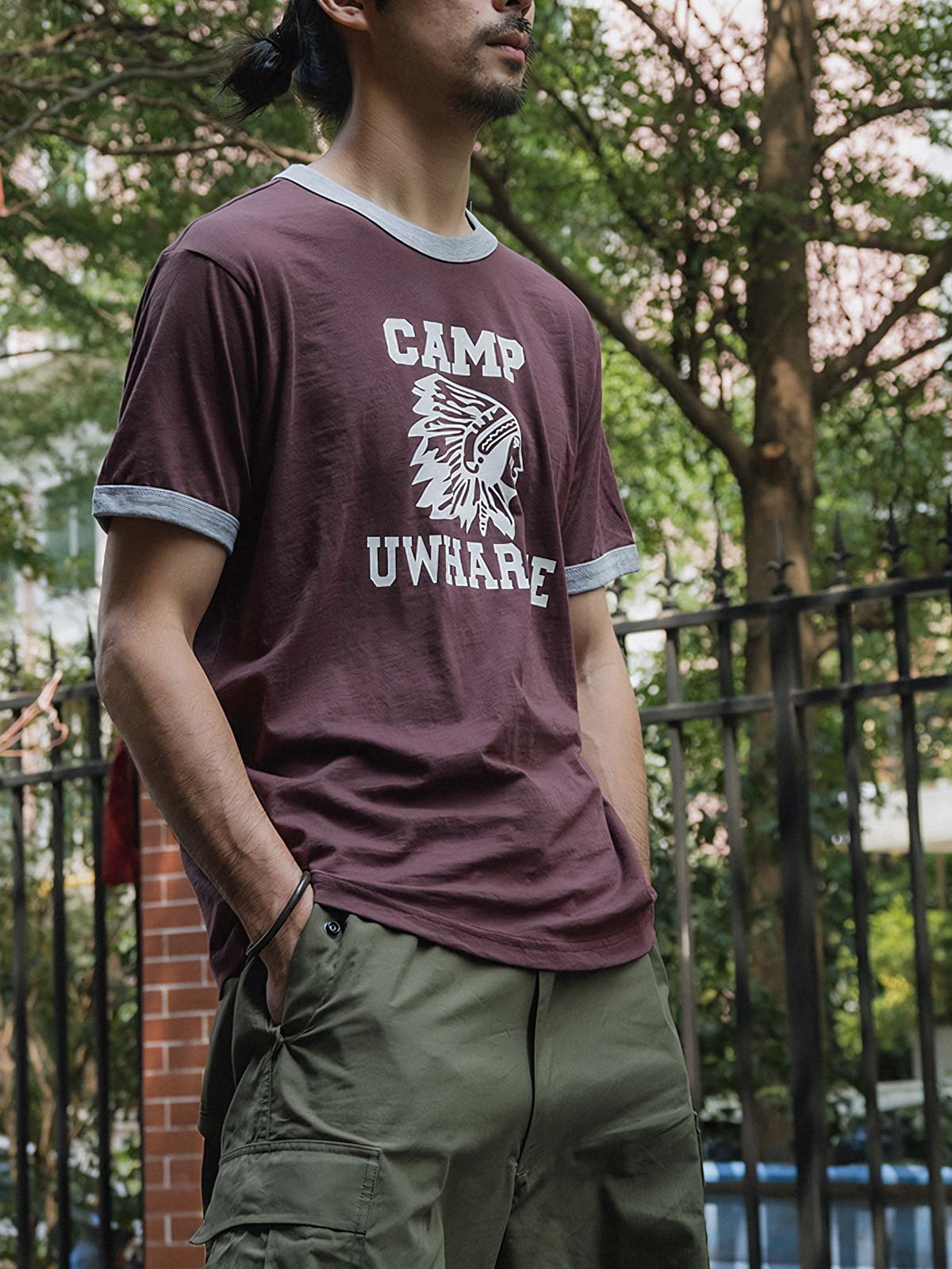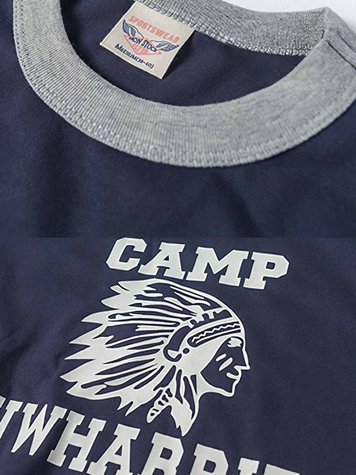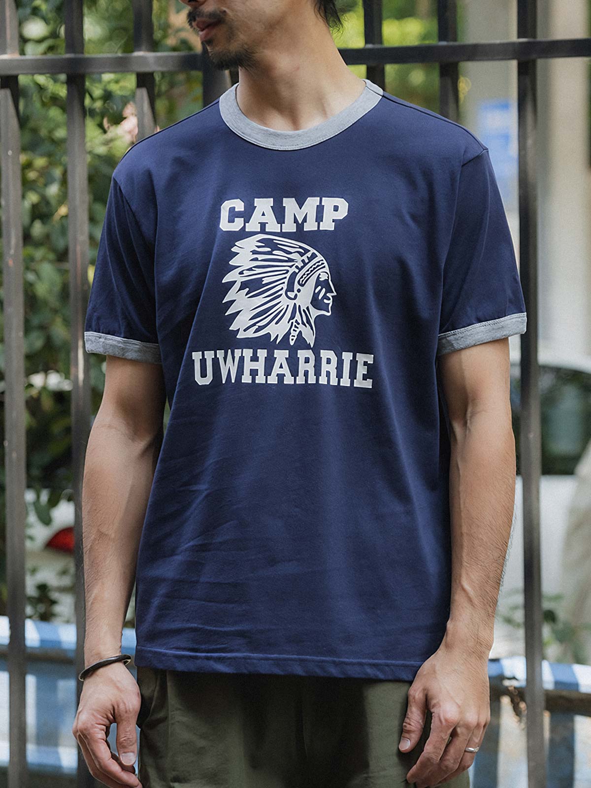 このTシャツはアメリカンスタイルのプリントが特徴で、民族風のグラフィックが目を引くデザインです。カラーブラロックのリブ付きの襟がアクセントになっており、カジュアルながらも一際立つスタイリングを演出します。
