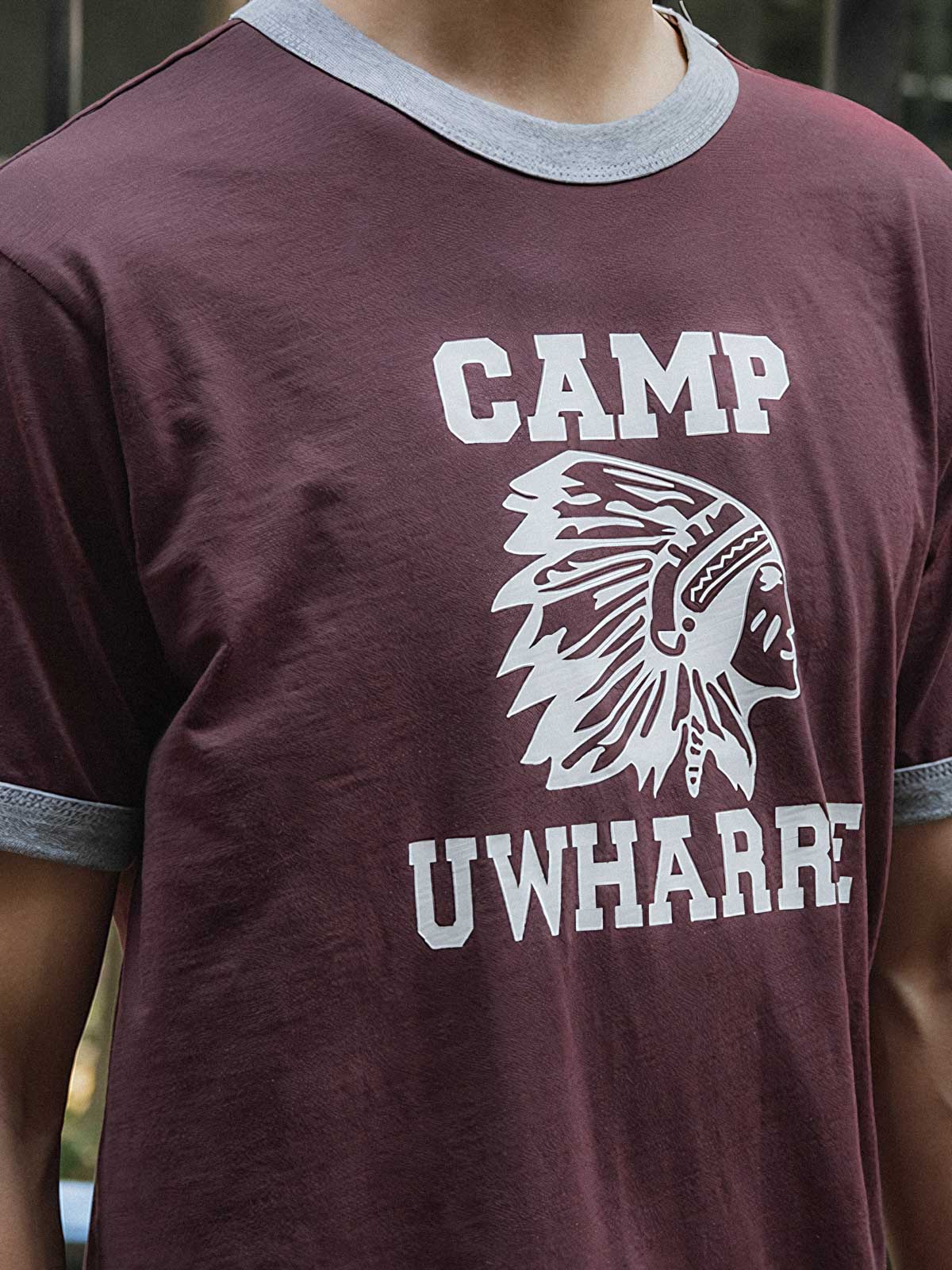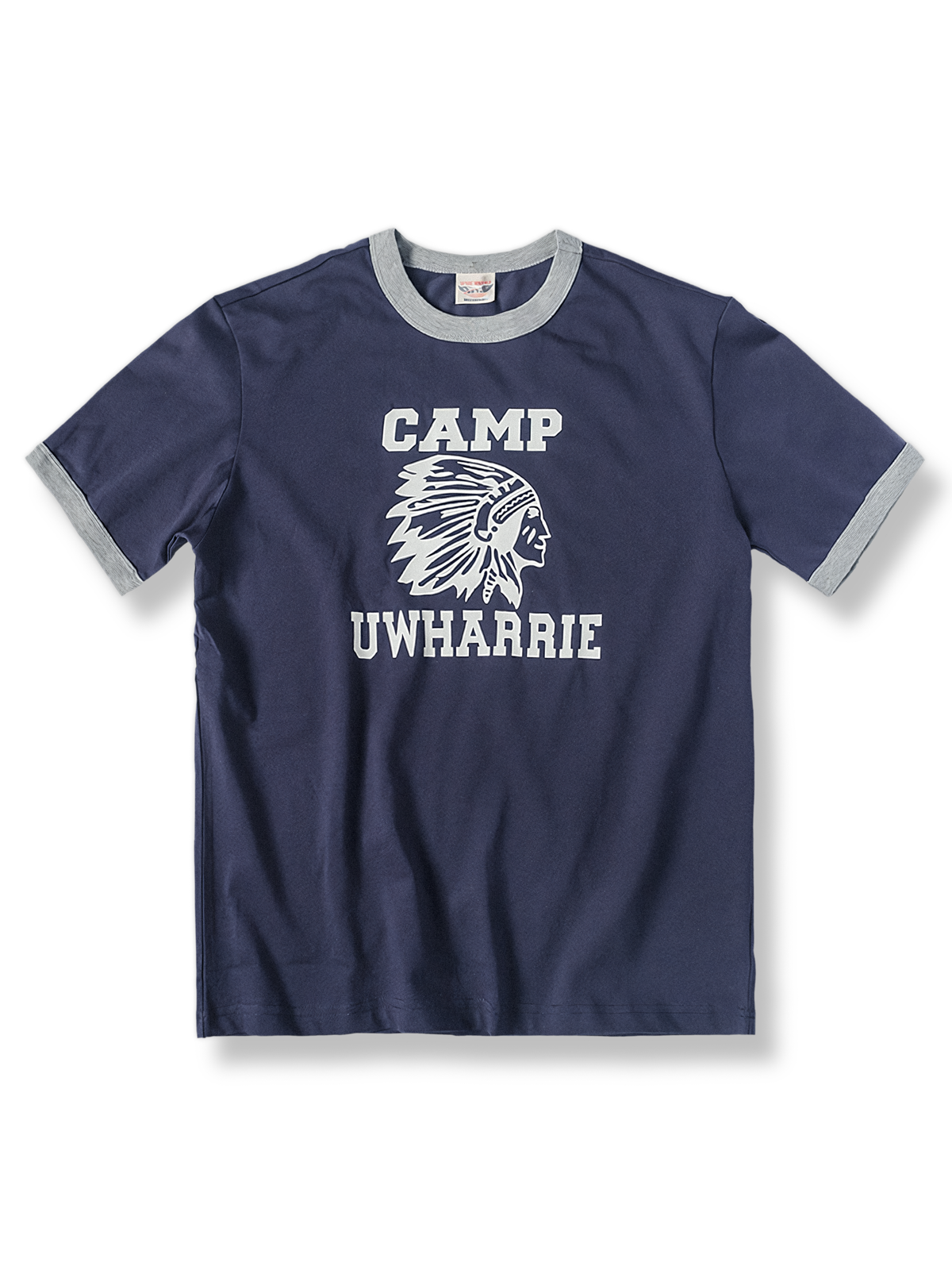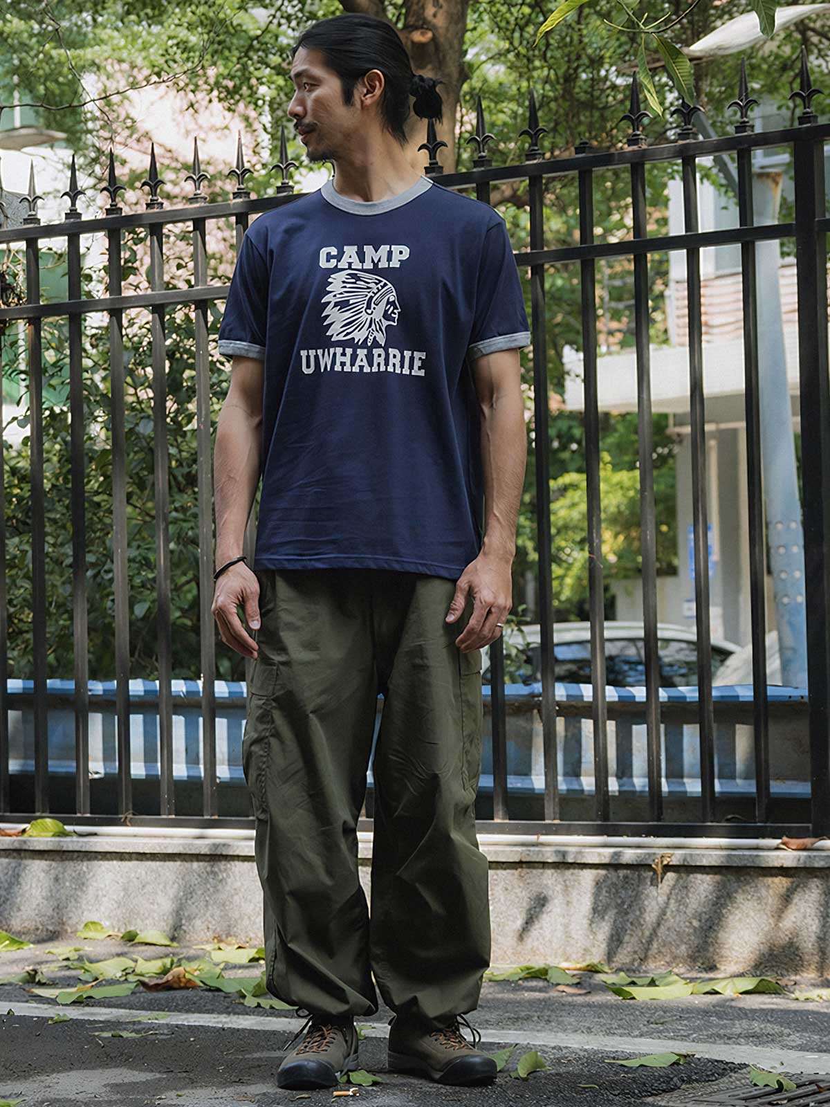 このTシャツはアメリカンスタイルのプリントが特徴で、民族風のグラフィックが目を引くデザインです。カラーブラロックのリブ付きの襟がアクセントになっており、カジュアルながらも一際立つスタイリングを演出します。