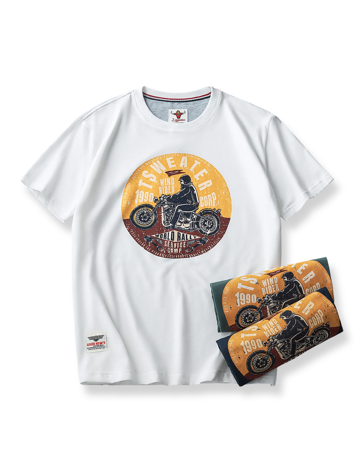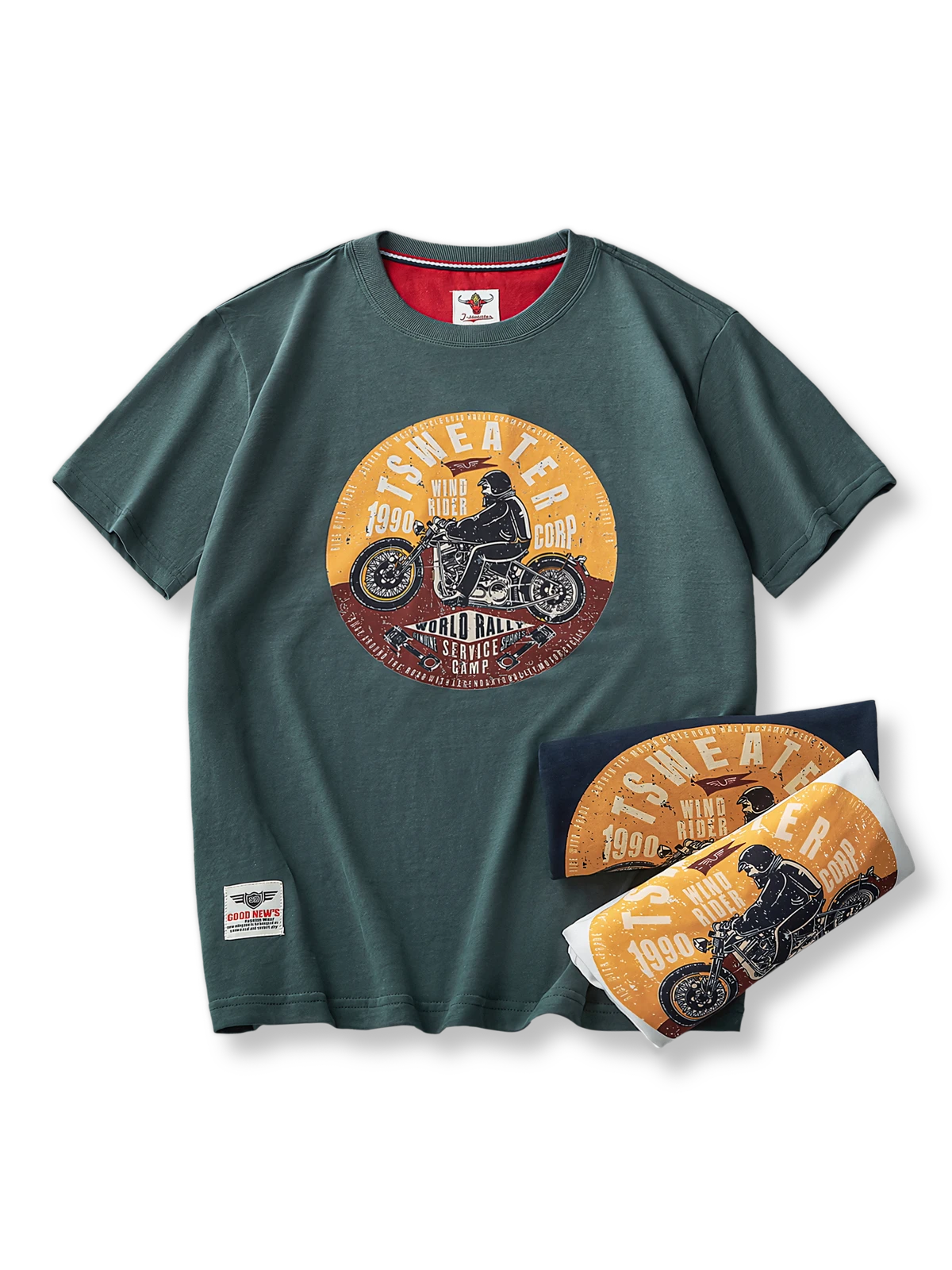 このTシャツは、ヴィンテージのバイクを描いた大胆なグラフィックが目を引く一枚です。フロントにプリントされた「1990」の年号と「SWEATER」の文字は、レトロな雰囲気を醸し出しており、愛好家の心をくすぐります。