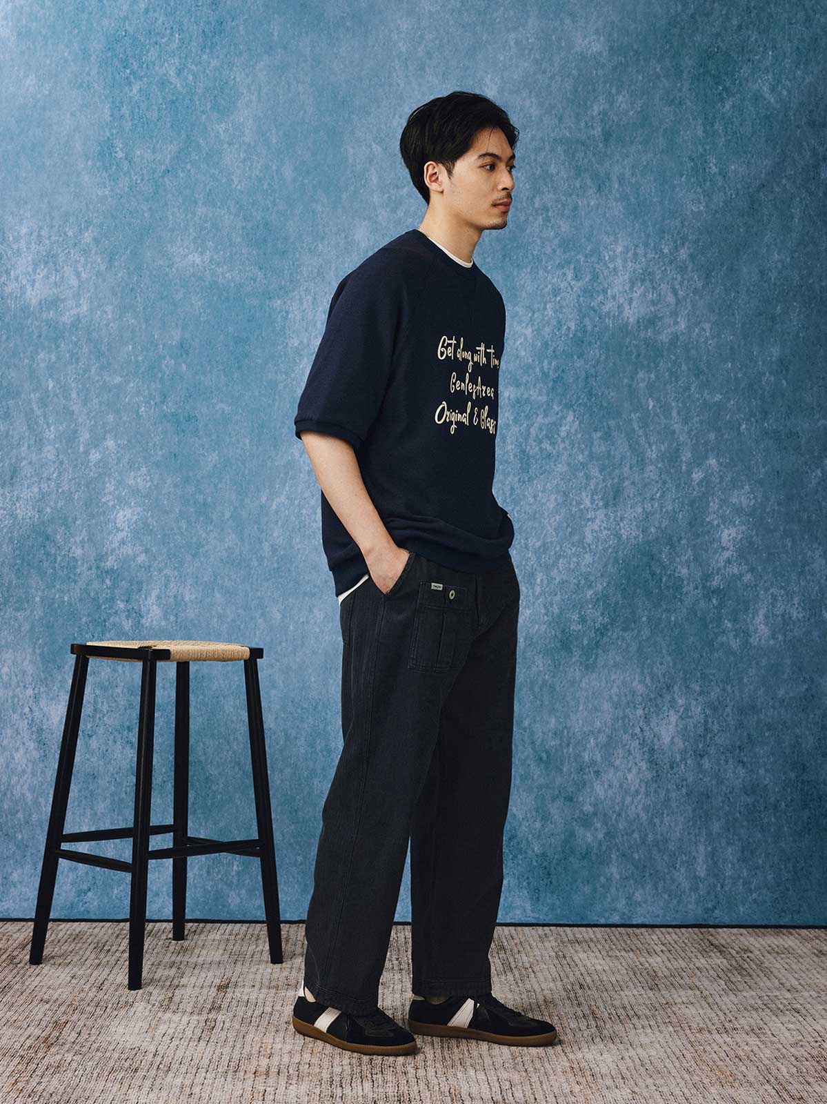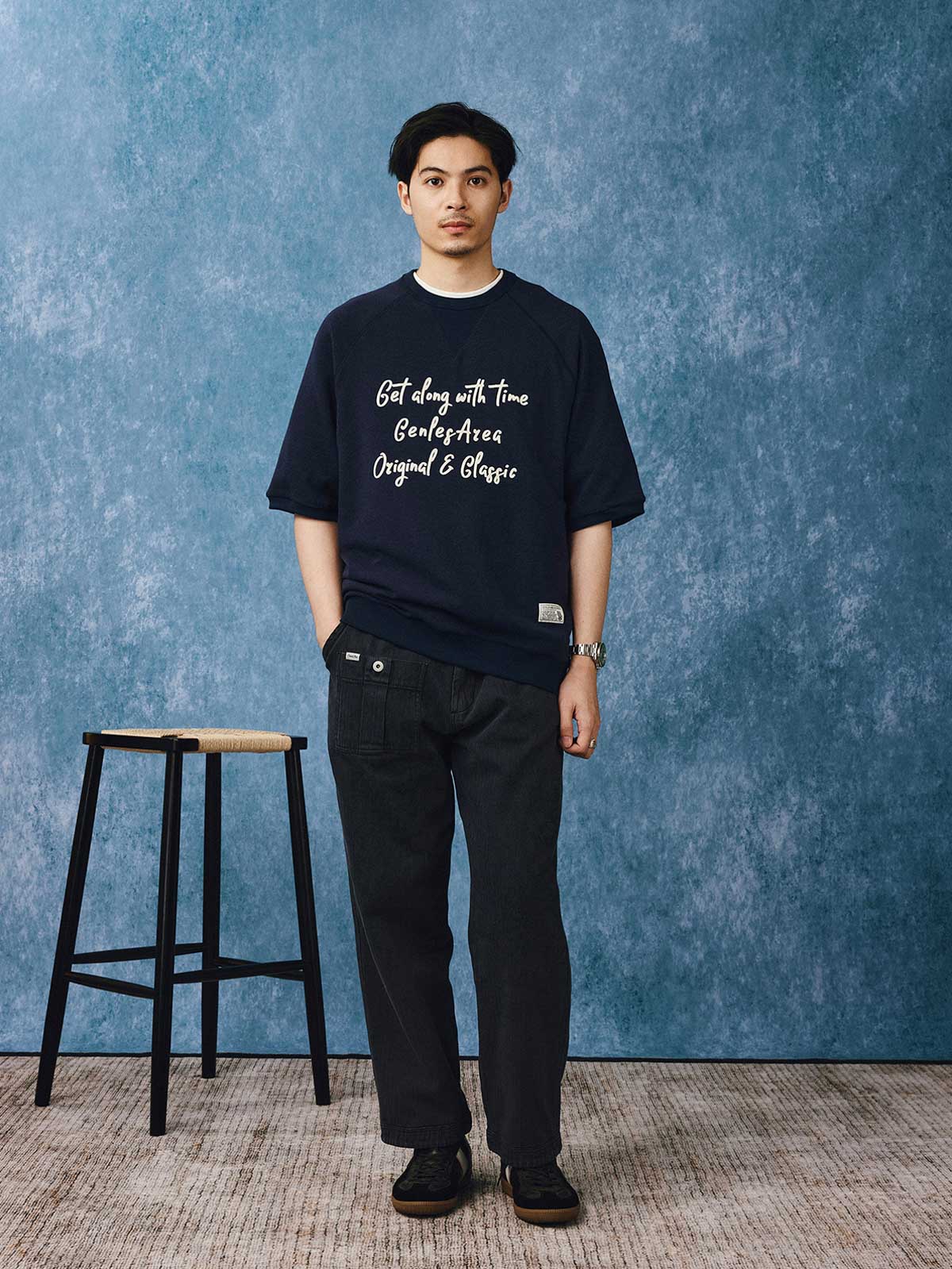 ゆったりとしたサイズ感とラグランスリーブが、快適さと動きやすさを提供します。リブが施された裾はシェイプを保ちつつ、着る人の動きを制限しません。これにより自然でリラックスしたレトロスタイルが楽しめます。