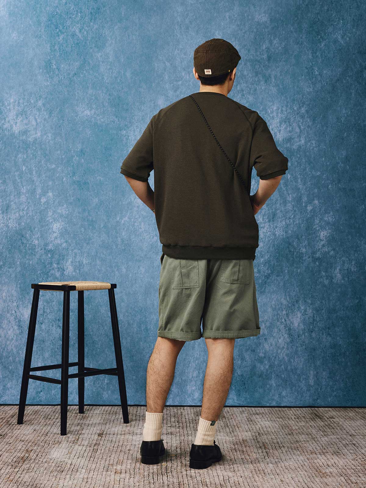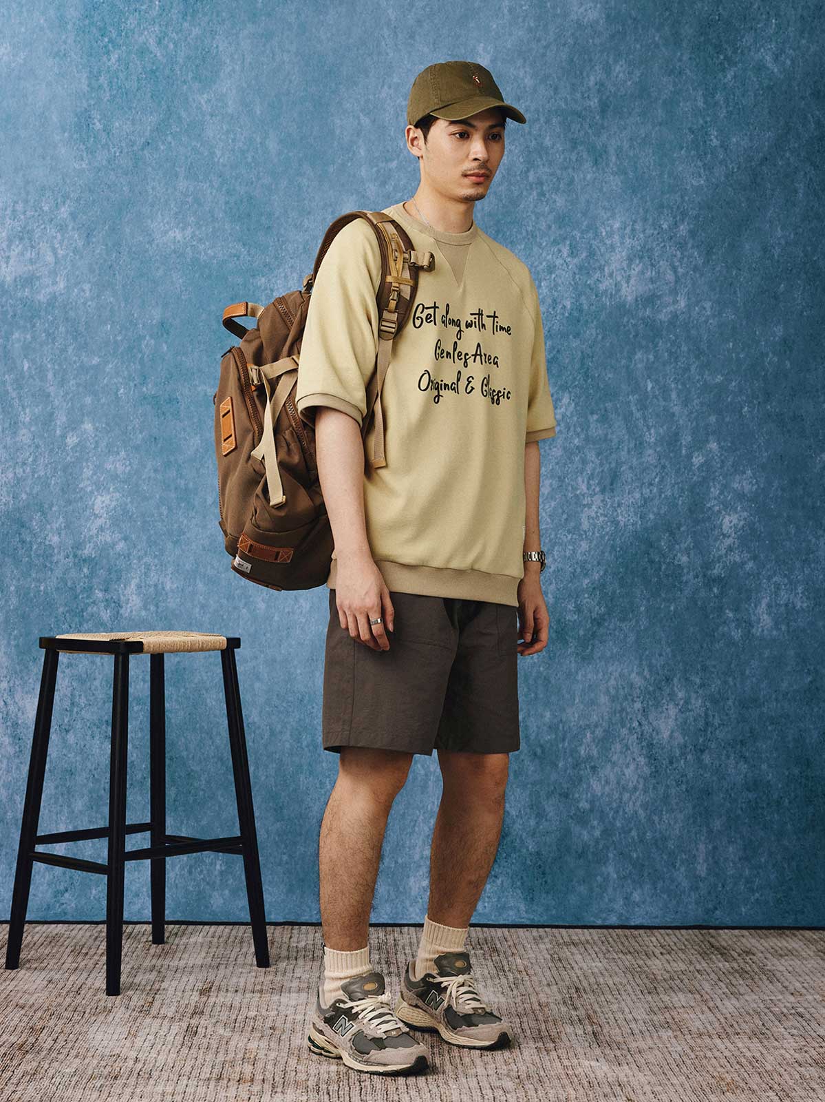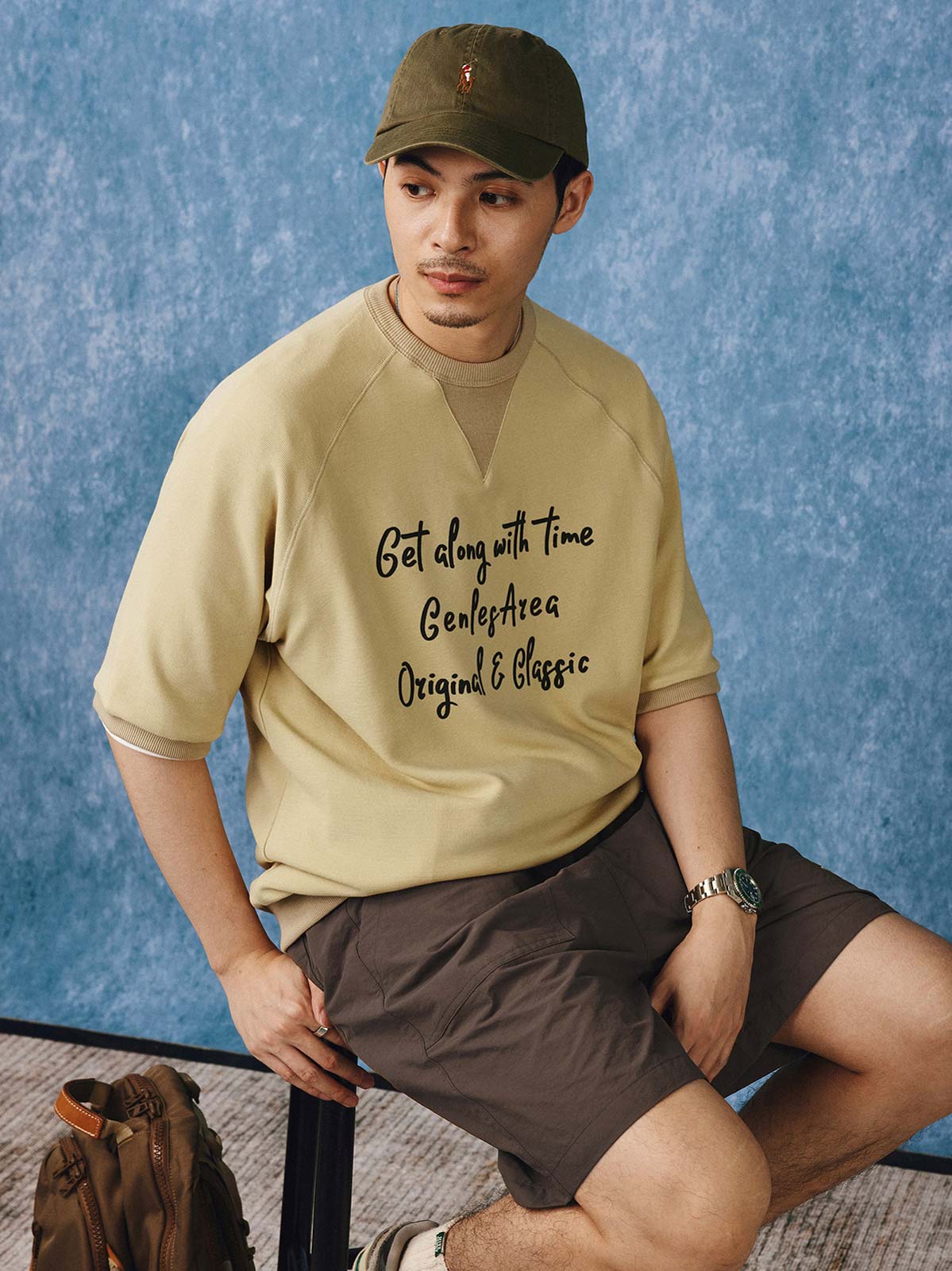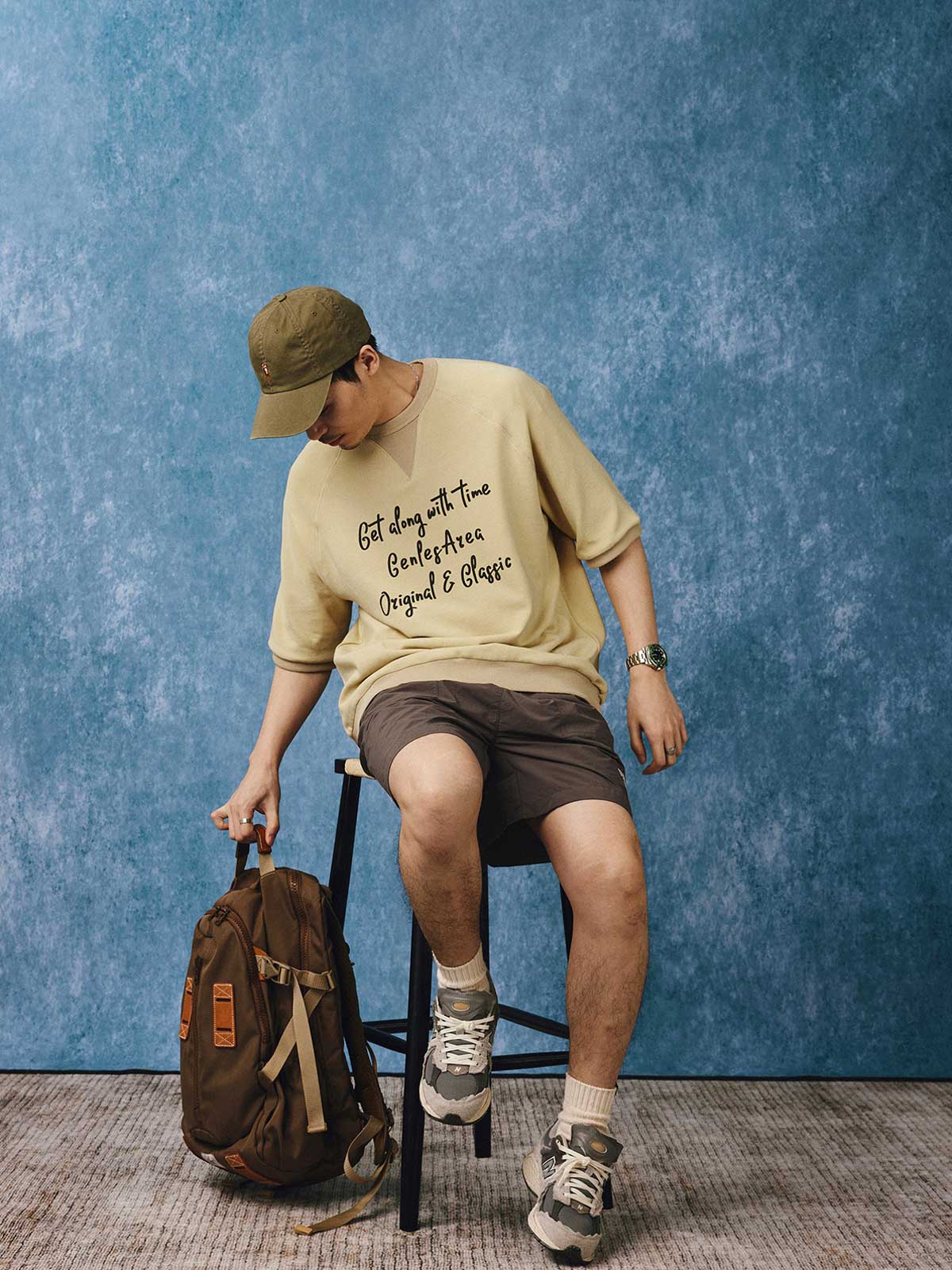 このラグランスリーブ半袖Tシャツはアメリカンレトロスタイルを現代に再現したアイテムです。270gのワッフル格子柄生地を使用し、47.7%のコットン、47.7%のレーヨン、4.6%のスパンデックスを混合して、柔らかな手触り、優れた通気性、そして適度なドレープ感を実現しています。ハスクステッチ技術と三角形の補強が施されたネックラインが、レトロな工芸と現代的な革新を融合させています。