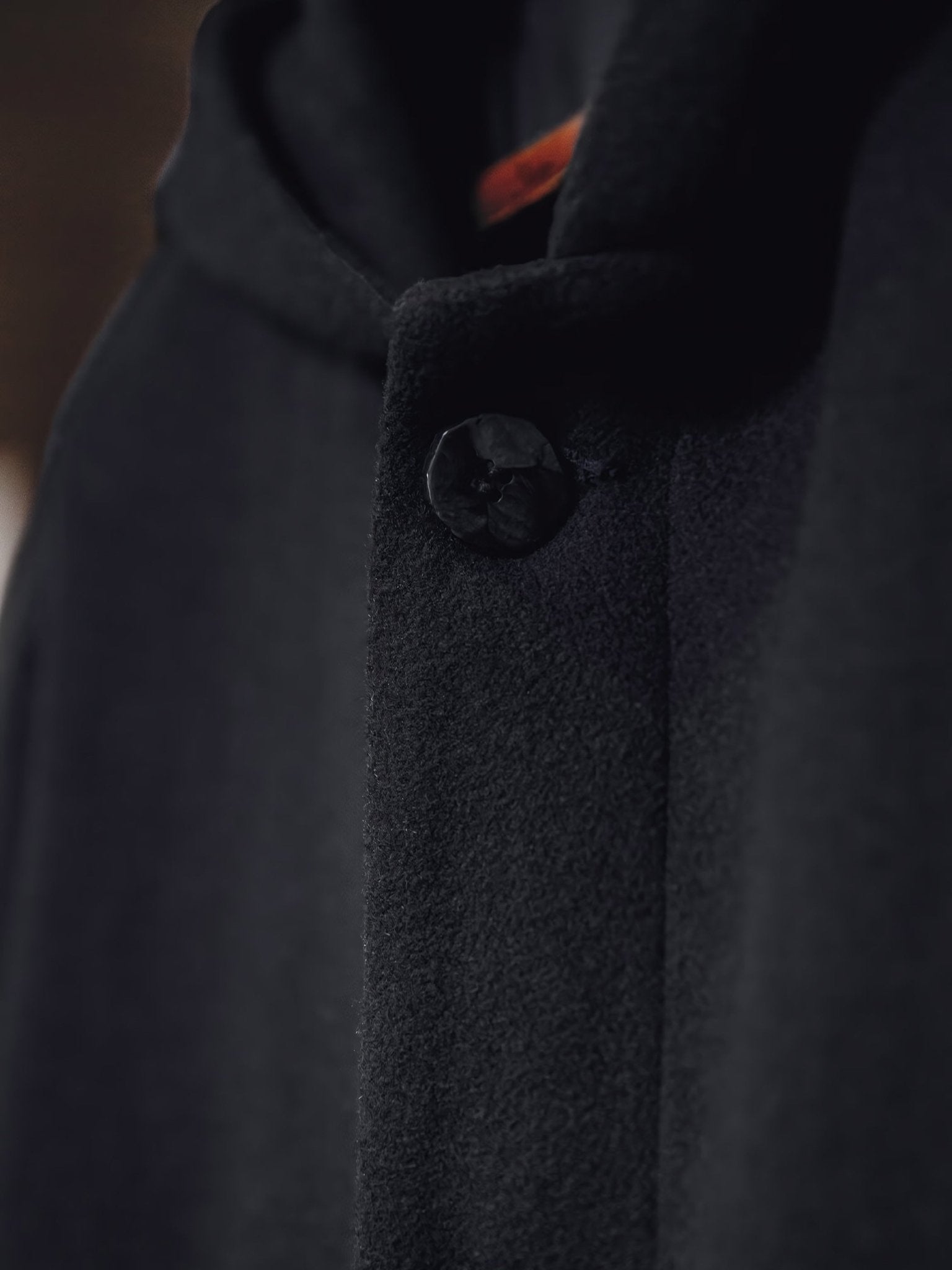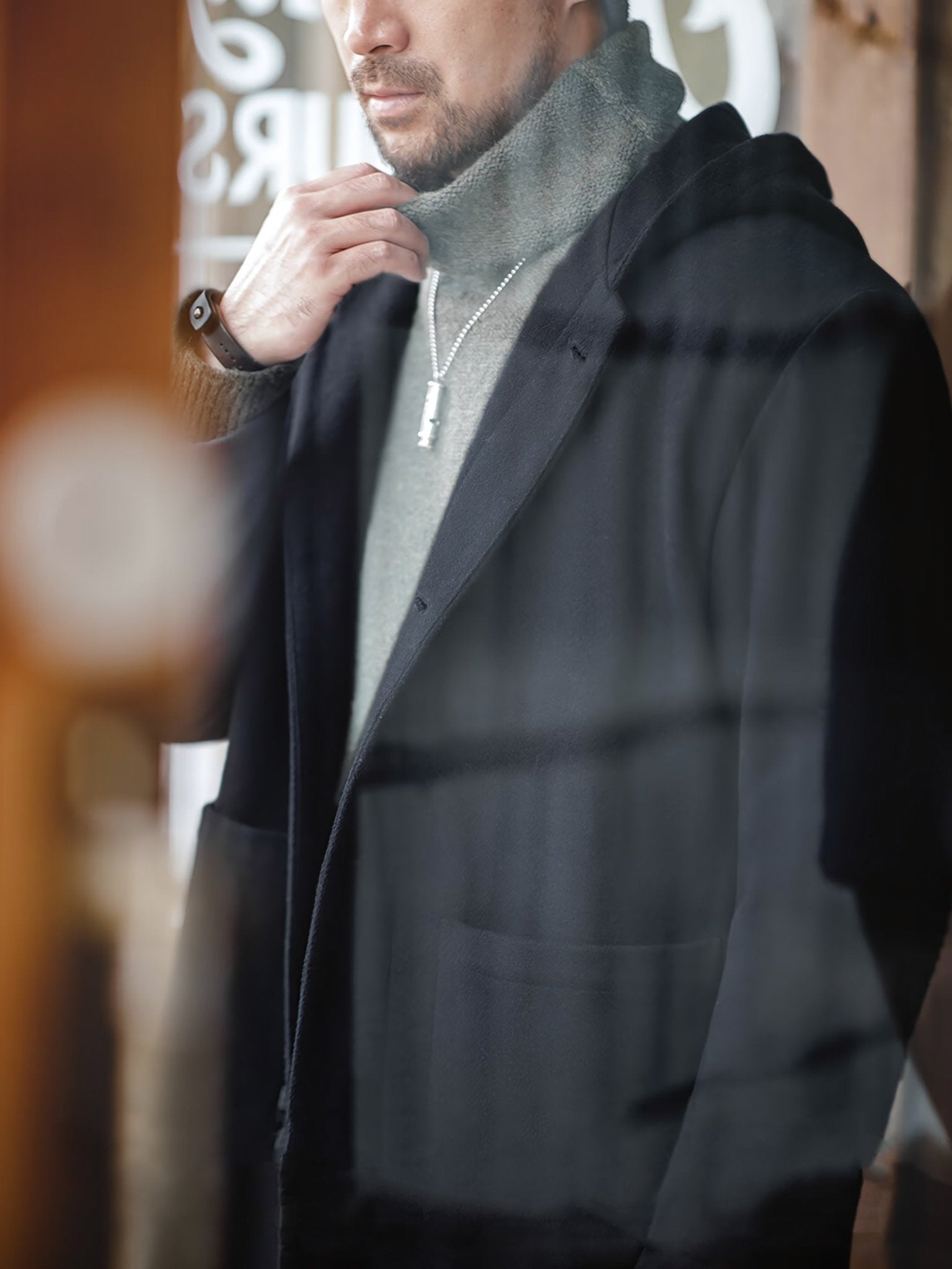 シンプルながらも細部にこだわったディテールが光ります。前面は4つのボタンで留め、均等に配置された前立てがスマートで印象的。2つの大容量ポケットが機能的に配置されています。