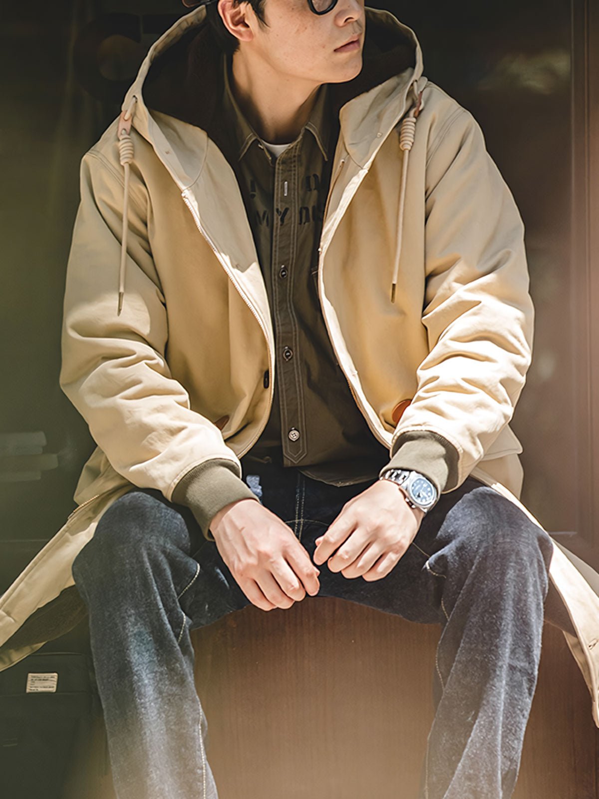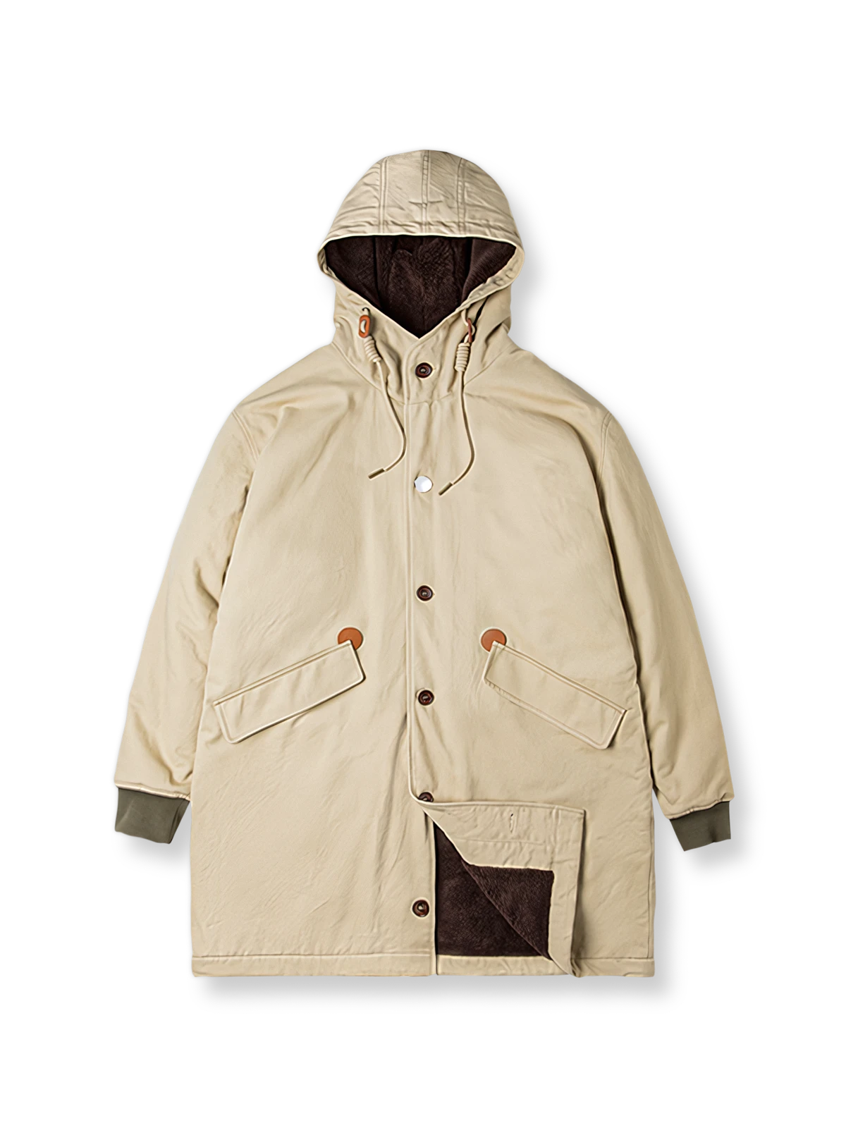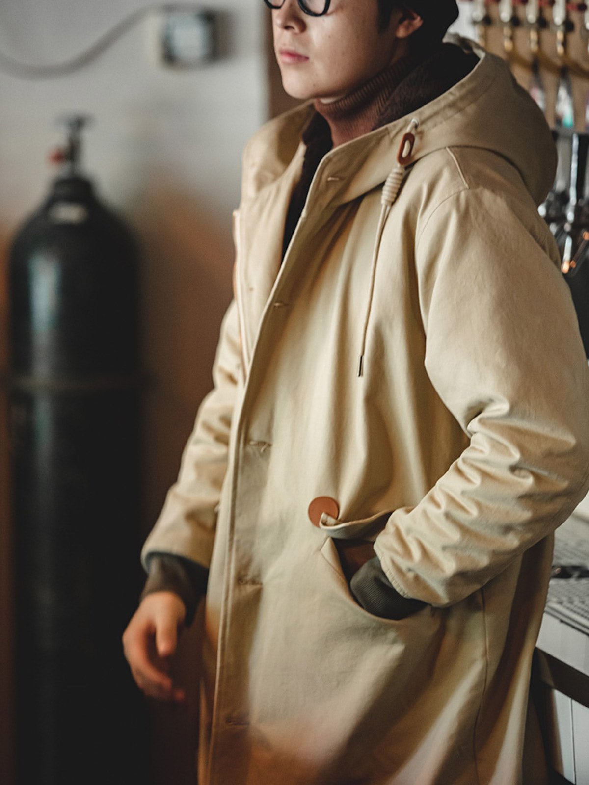 このコートは、冷たい環境での米海軍の作業ニーズから着想を得ています。機能性と耐久性に重点を置いた軍用仕様を基にしており、20世紀中期の軍用アウターに一般的でした。このアイテムは、クラシックなデッキコートをベースに現代的なデザイン要素を取り入れ、日常着用に適したスタイルにしながらも、一定のミリタリースタイルを保持しています。