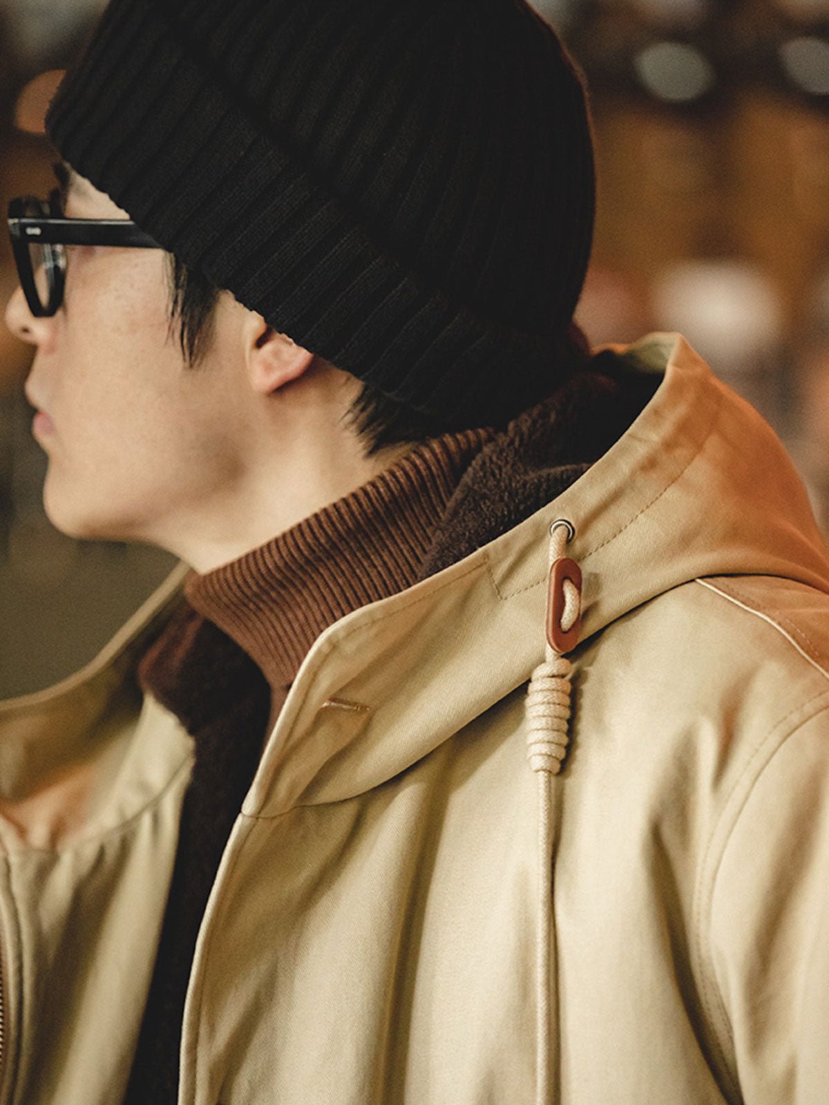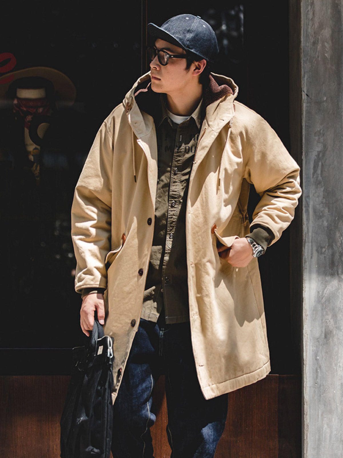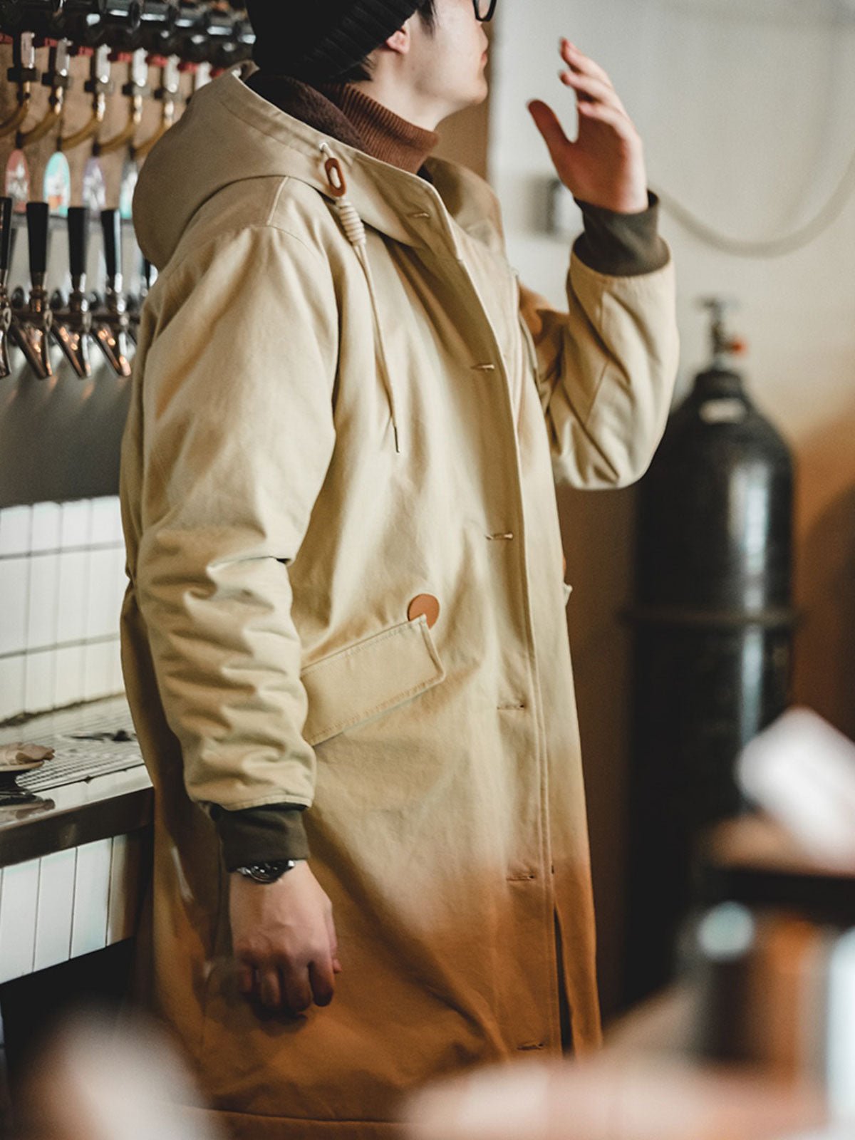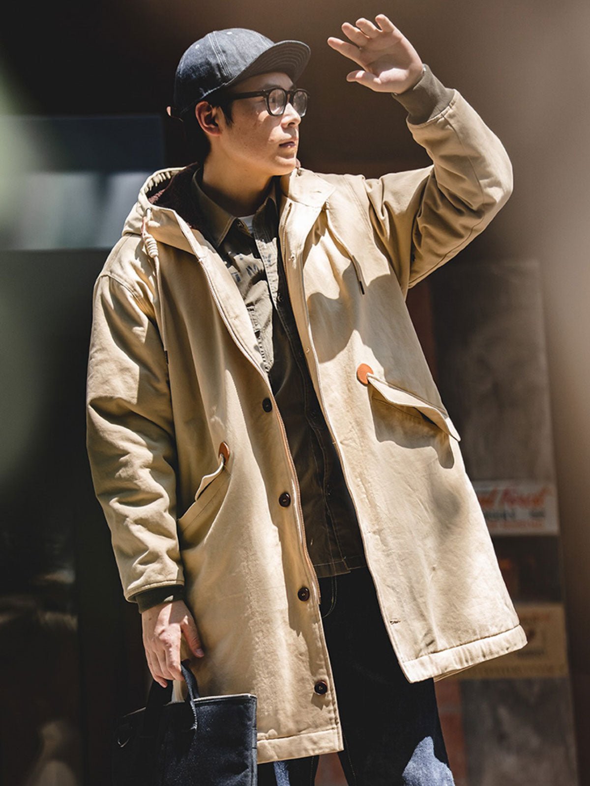 このコートは100%純綿のツイルキャンバス素材を使用し、400g/m²の重量を持っており、耐久性と耐摩耗性を保証します。裏地は高重量の小粒ベルベットを使用しており、この細かい素材は熱を効果的に保持し、優れた保温性を提供します。また、コートの裾に加えられたカバーは、保温性を高めるだけでなく、全体の構造の安定性も向上させています。