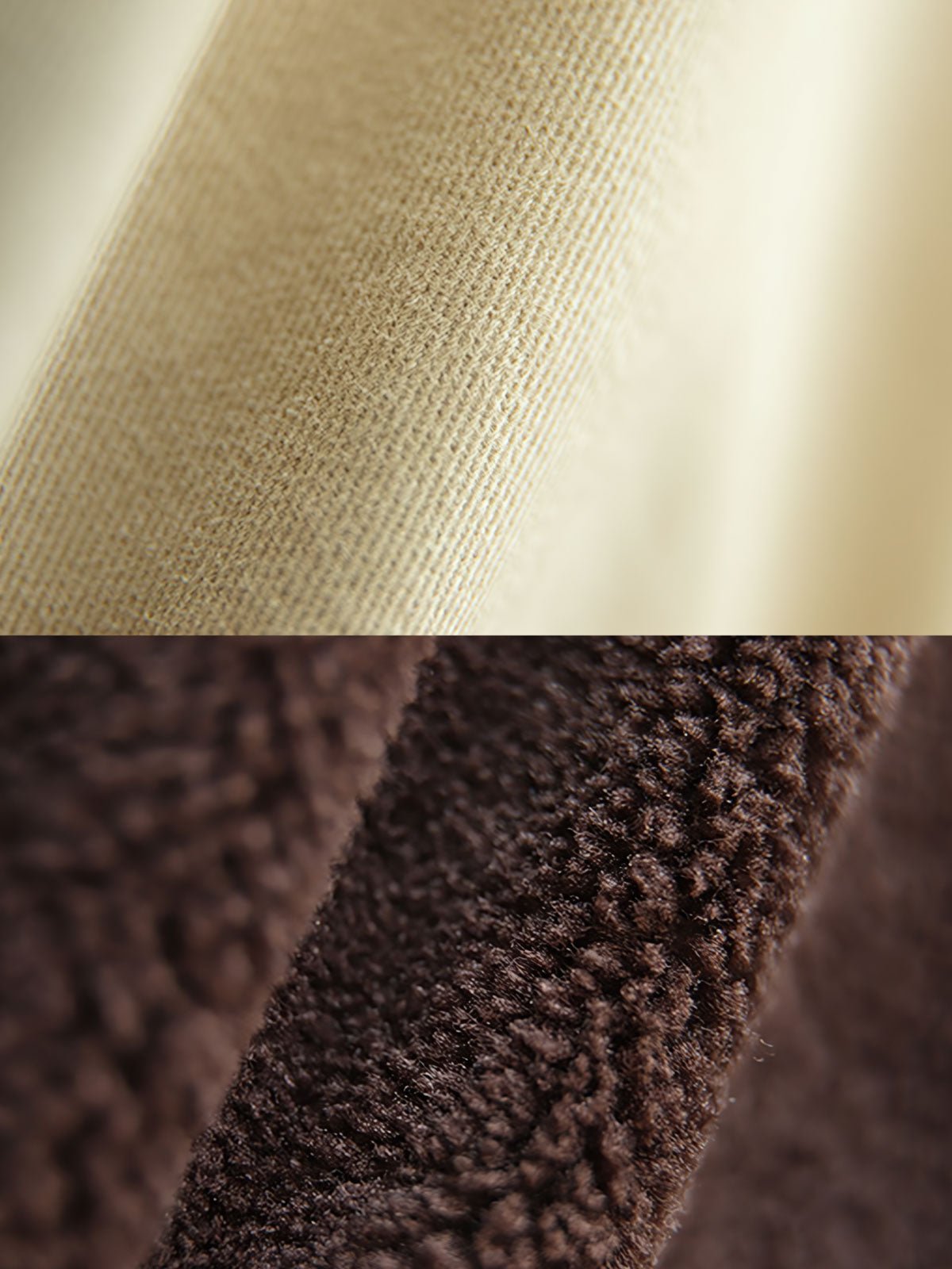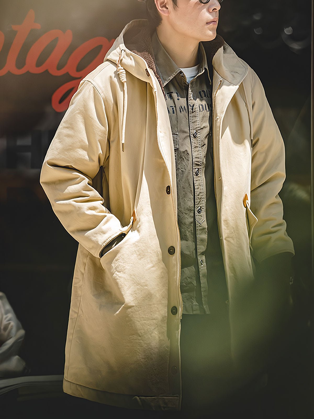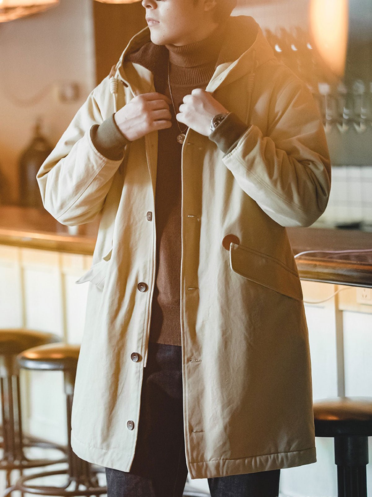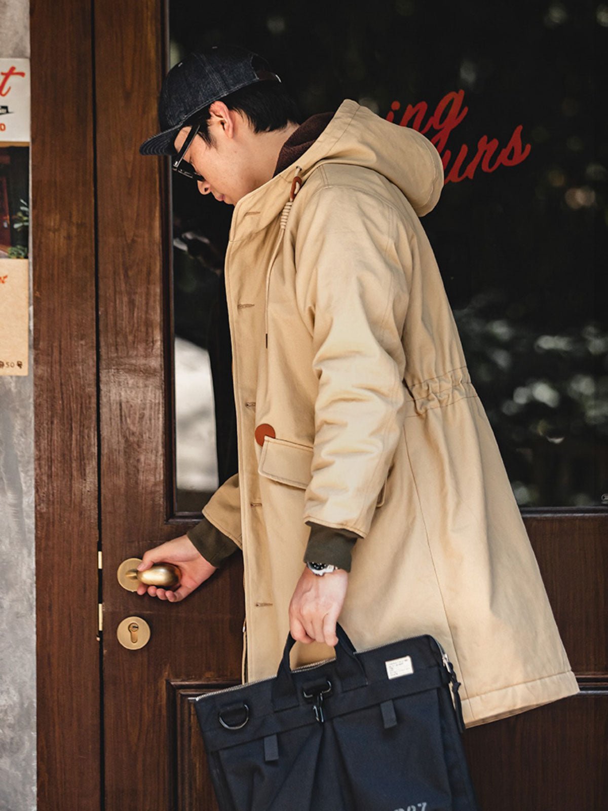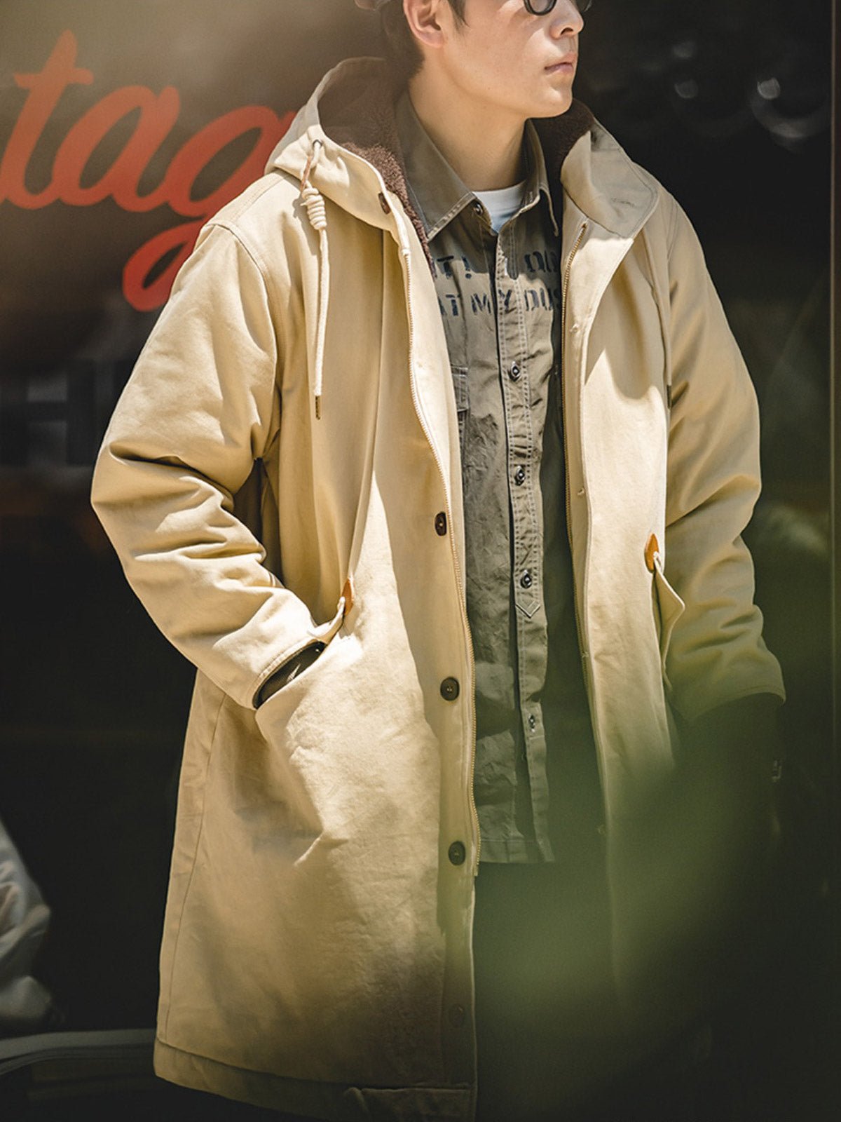 このコートは100%純綿のツイルキャンバス素材を使用し、400g/m²の重量を持っており、耐久性と耐摩耗性を保証します。裏地は高重量の小粒ベルベットを使用しており、この細かい素材は熱を効果的に保持し、優れた保温性を提供します。また、コートの裾に加えられたカバーは、保温性を高めるだけでなく、全体の構造の安定性も向上させています。
