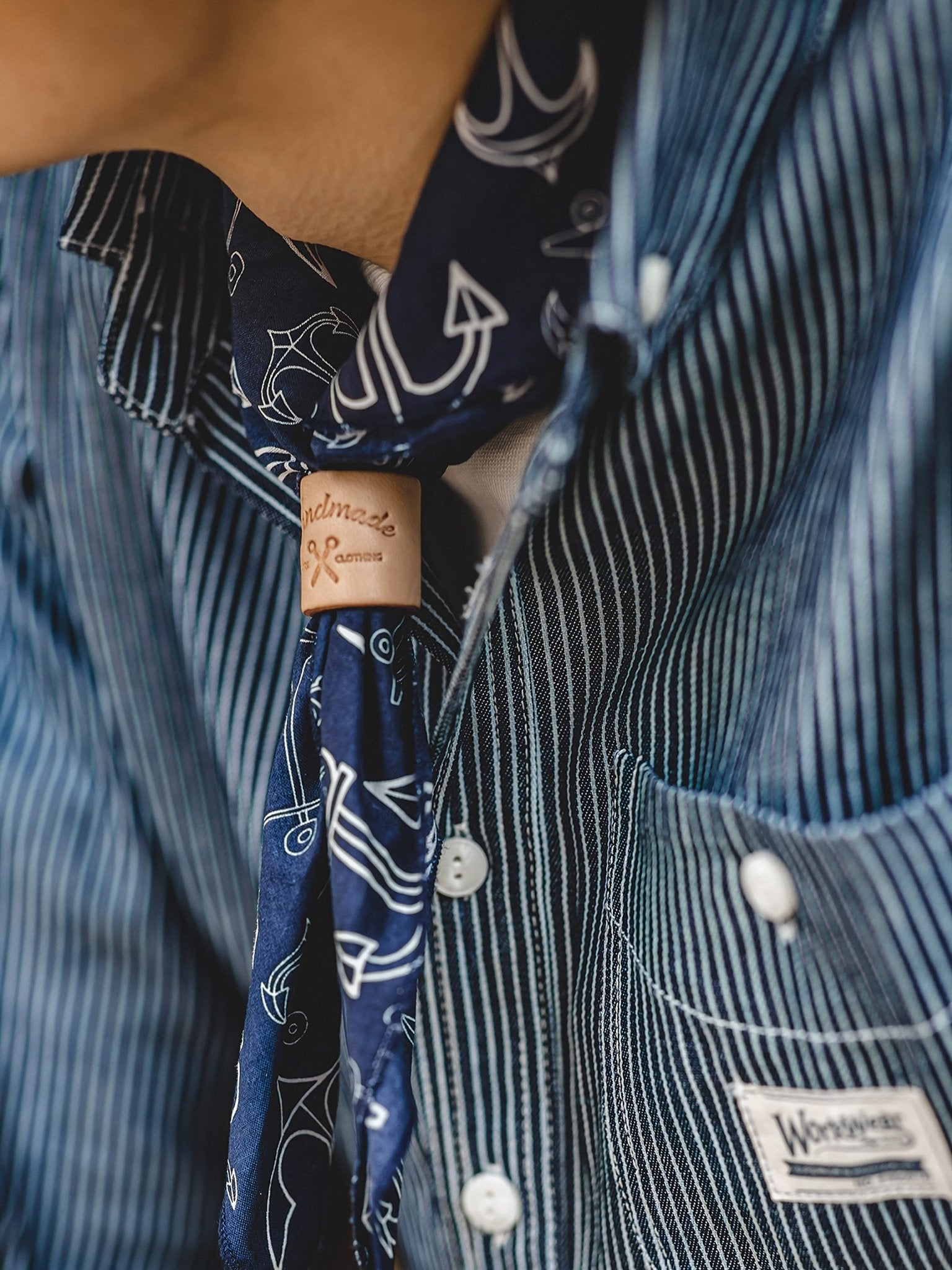 • インディゴカラーのコットン100%スカーフは、デニムのバックポケットから覗かせる王道スタイルに加え、バッグのアクセントや首元のスカーフとしても活躍します。多彩な使い方が楽しめる万能アイテムです。