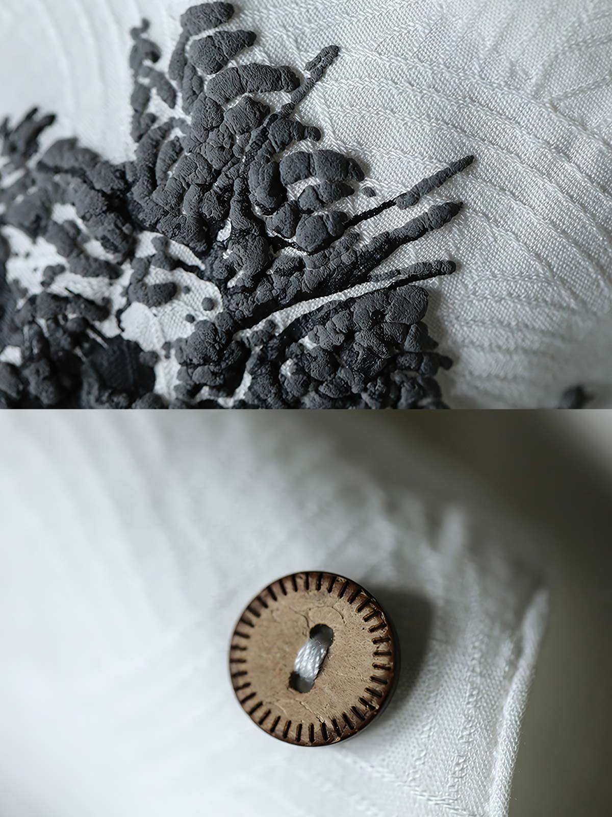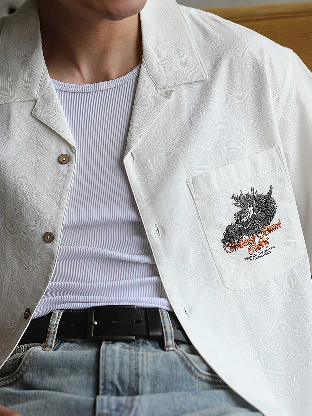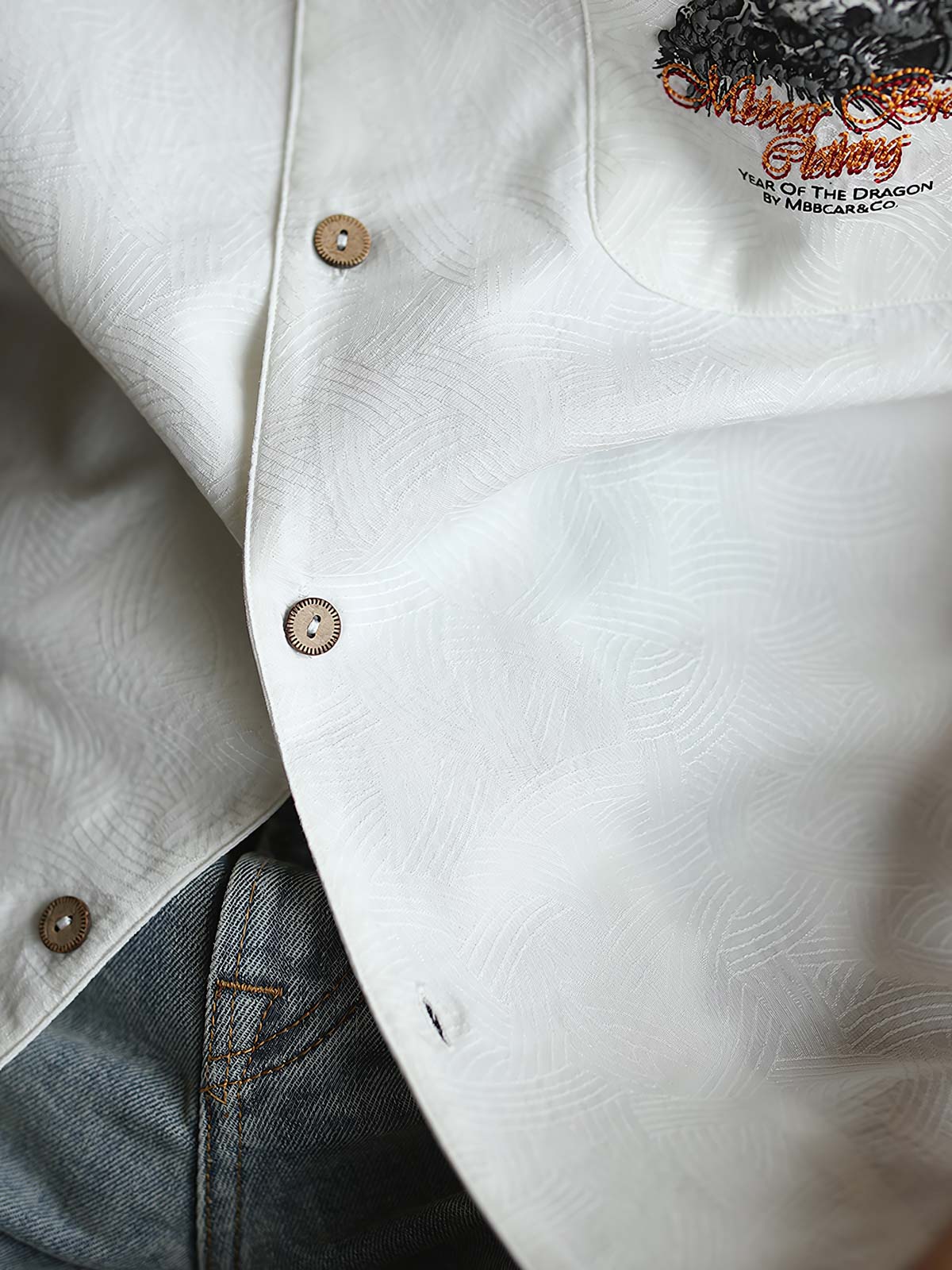 テンセルとコットンの混紡素材を採用し、コットンの柔らかな触り心地と優れた通気性を保持しつつ、テンセルの滑らかさと環境に配慮した特性を活かしています。ジャカード織りの技術で繊細な幾何学模様を表現し、さらにレイヤー感を加えています。ドラゴンの模様は立体的な発泡プリント刺繍技術で精緻に再現され、職人の技が際立っています。