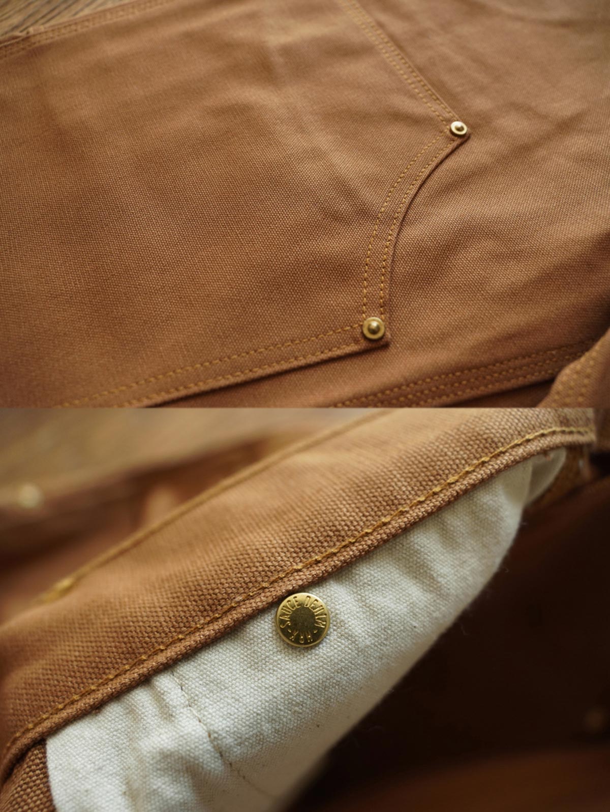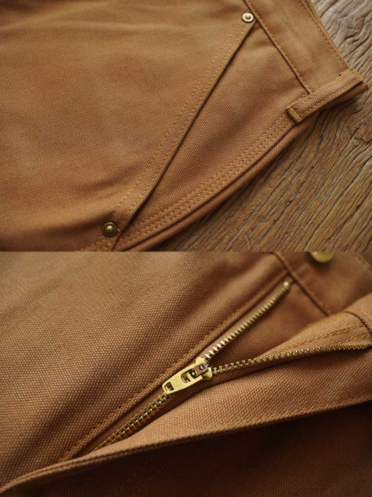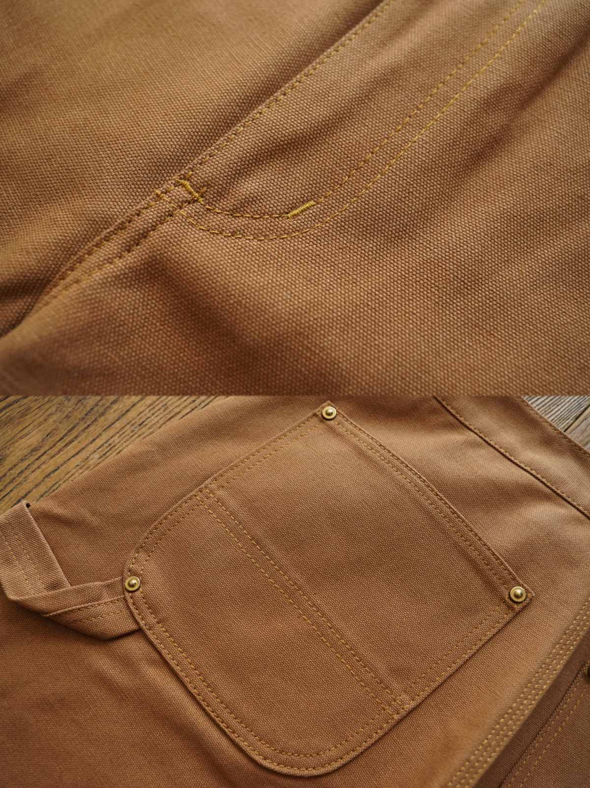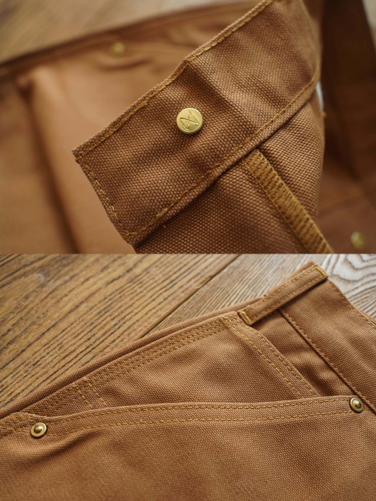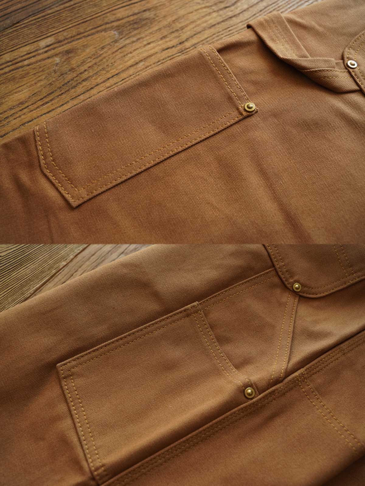 このキャンバスログワークパンツは、高密度の重厚なキャンバス素材を使用しており、厚みがありしっかりとした形状を保ちます。クラシックなワイドストレートのシルエットで、日常のカジュアルなシーンに最適です。ずぼんは全ての黄銅製チャックが 専用的な五金とYKKジッパーを備え、細部まで丁寧に仕上げられています。厚手の生地を使用しているため、大量のチェーンステッチを使用した製作プロセスは非常に厳密です。ヴィンテージタンニングレザーパッチは、ミンクオイルや馬油を塗ることで色を変えることができ、レトロな雰囲気を増します。全体的なデザインは実用性とヴィンテージスタイルを兼ね備えており、高品質のワークパンツとして理想的な選択です。
