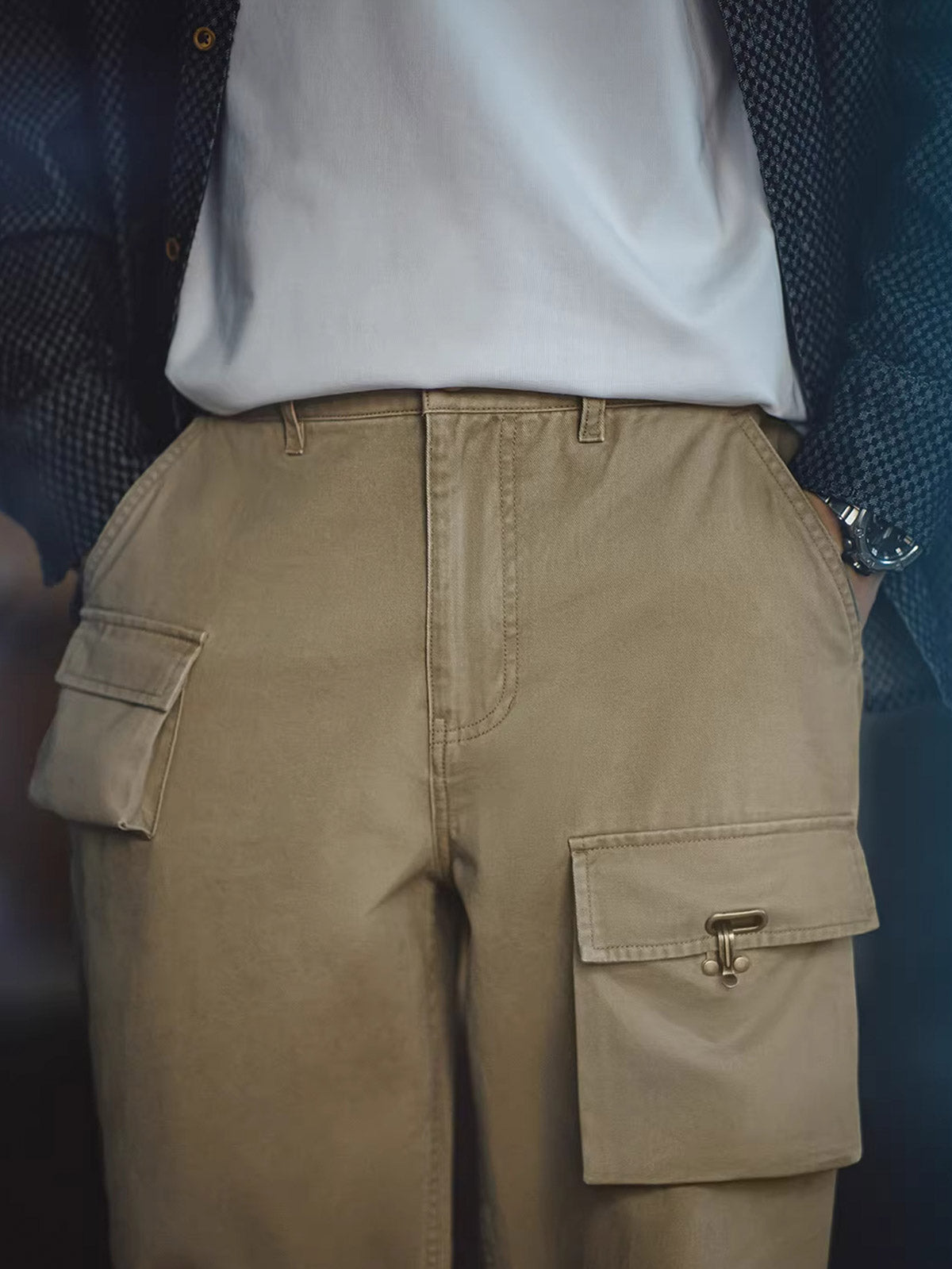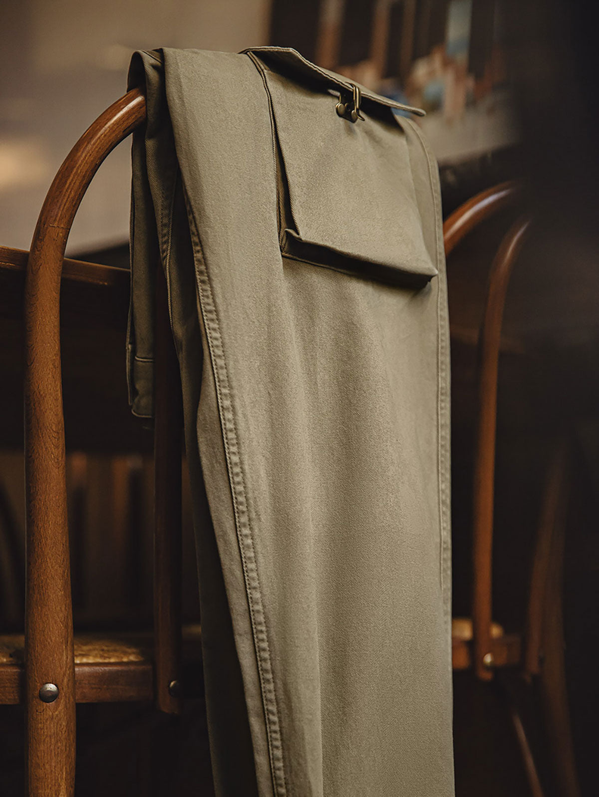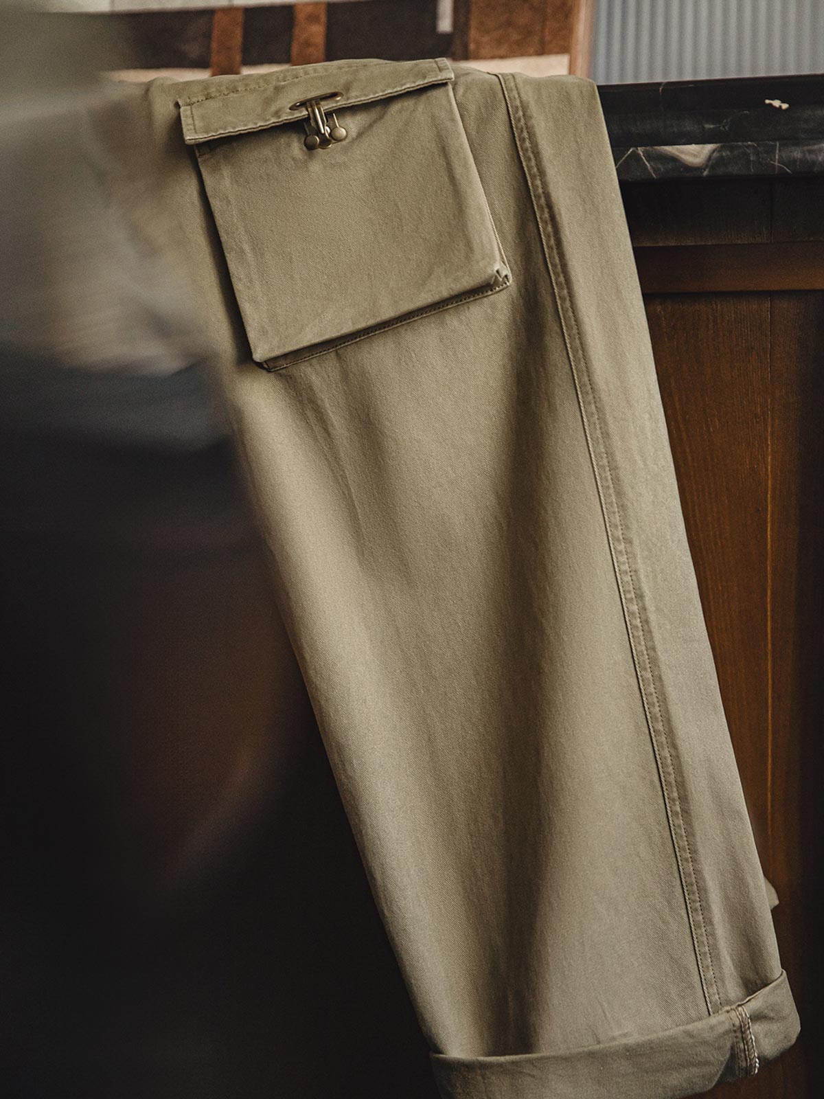 このカジュアルパンツは、P37イギリス軍パンツのクラシックなデザインを受け継ぎ、ヴィンテージテイストを重視したアイテムです。左脚の大きなフラップポケットとヴィンテージ風エアプレーンバックルが、ミリタリースタイルと実用性を際立たせます。ミドルウエストで脚のラインを美しく見せるストレートシルエットは、快適な着用感を提供し、さまざまな体型に対応します。ピュアコットン素材を採用し、通気性と耐久性に優れた仕上がりで、アクティブな日常シーンやアウトドアスタイルにも最適です。ハードなカッティングと細部にこだわったディテールが、ワークジャケットやストリートウェアとの相性を高め、簡単にヴィンテージミリタリースタイルを完成させます。