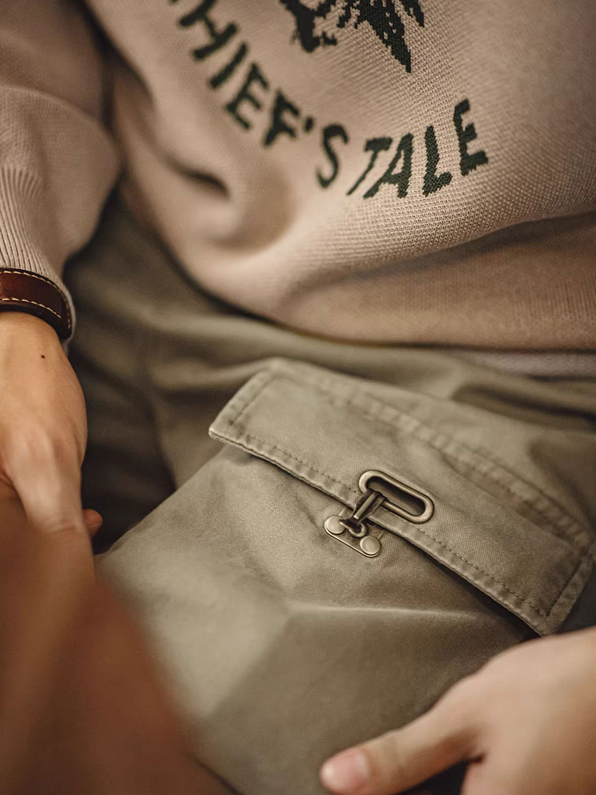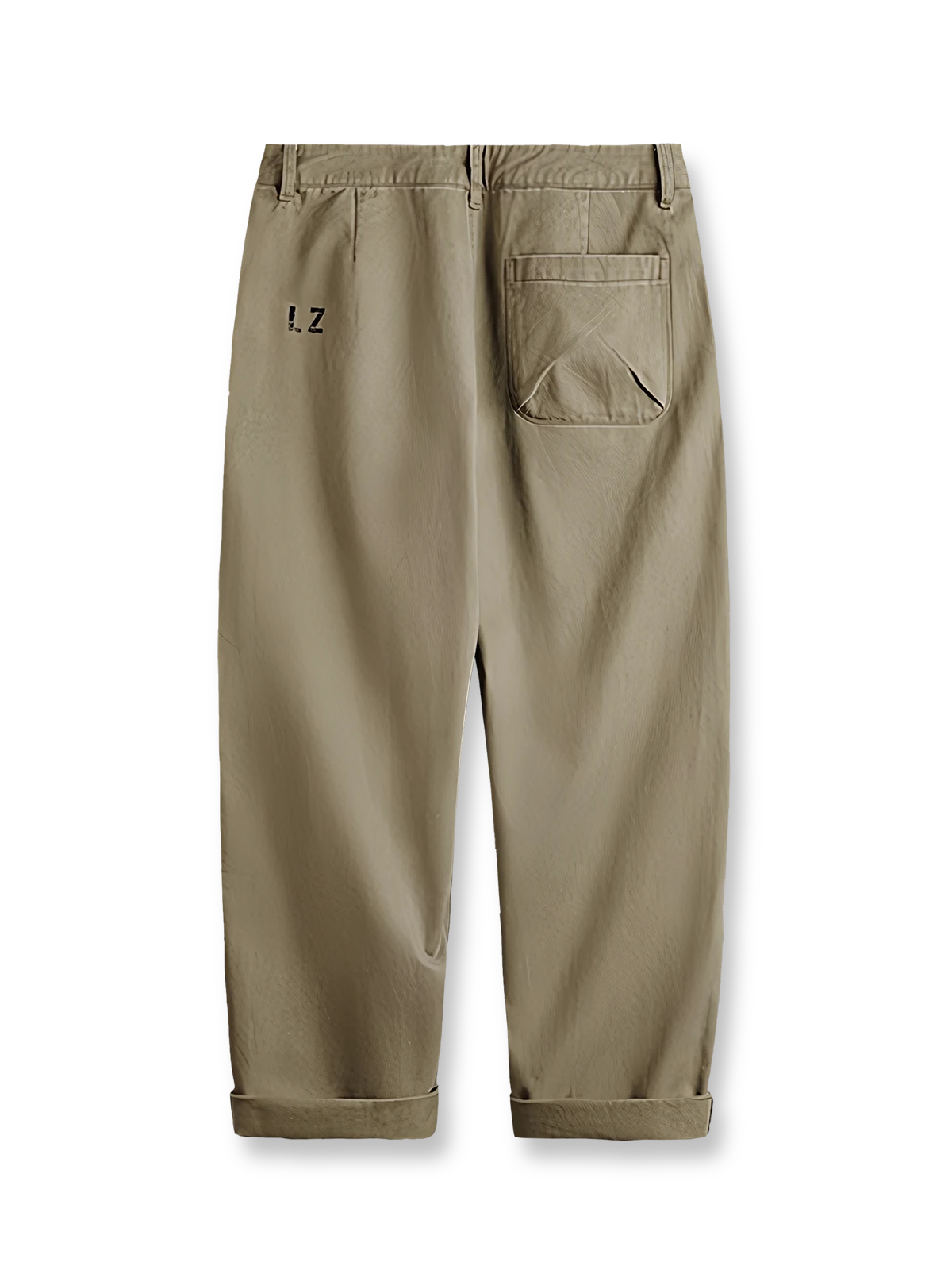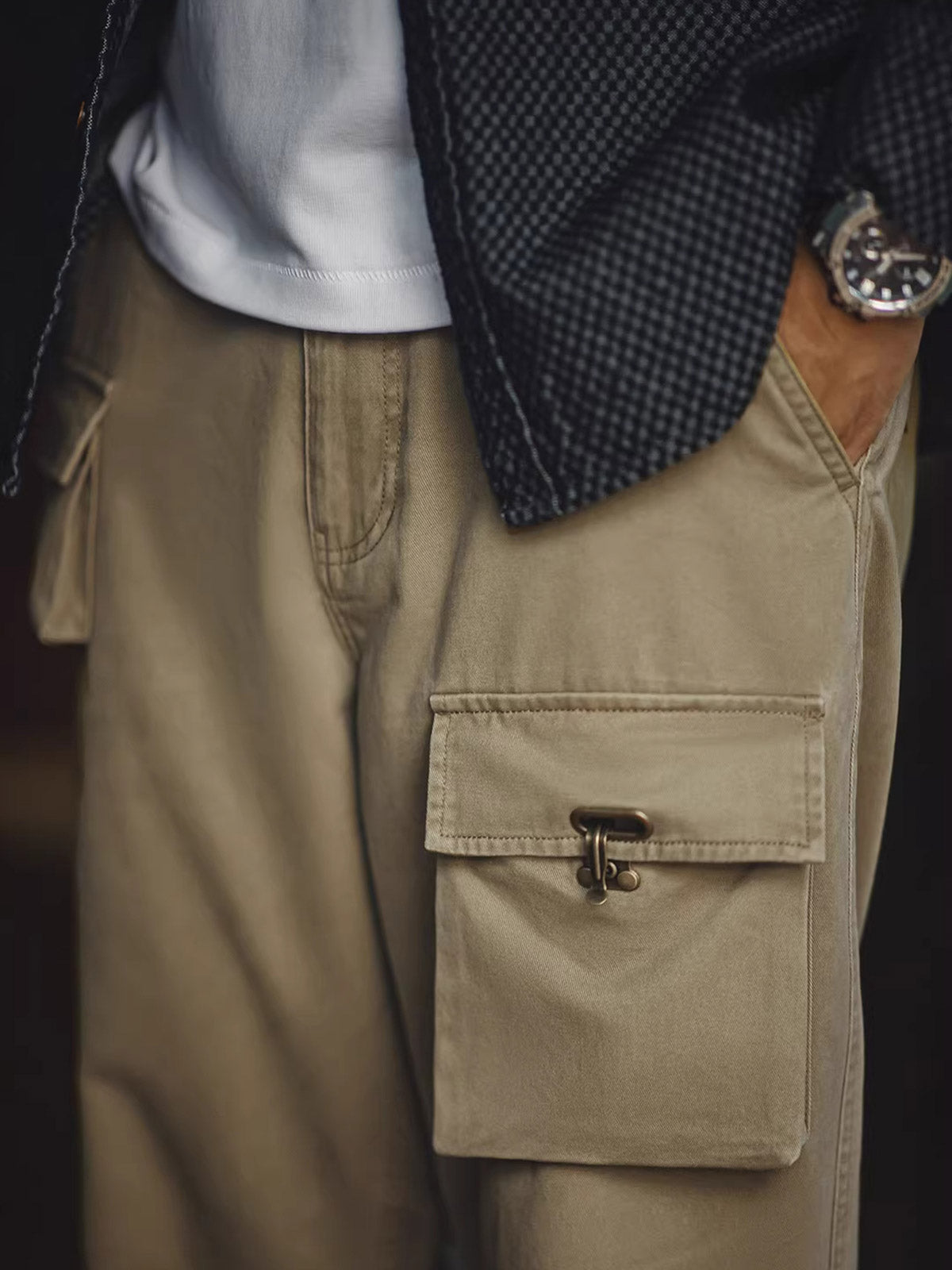 このカジュアルパンツは、P37イギリス軍パンツのクラシックなデザインを受け継ぎ、ヴィンテージテイストを重視したアイテムです。左脚の大きなフラップポケットとヴィンテージ風エアプレーンバックルが、ミリタリースタイルと実用性を際立たせます。ミドルウエストで脚のラインを美しく見せるストレートシルエットは、快適な着用感を提供し、さまざまな体型に対応します。ピュアコットン素材を採用し、通気性と耐久性に優れた仕上がりで、アクティブな日常シーンやアウトドアスタイルにも最適です。ハードなカッティングと細部にこだわったディテールが、ワークジャケットやストリートウェアとの相性を高め、簡単にヴィンテージミリタリースタイルを完成させます。
