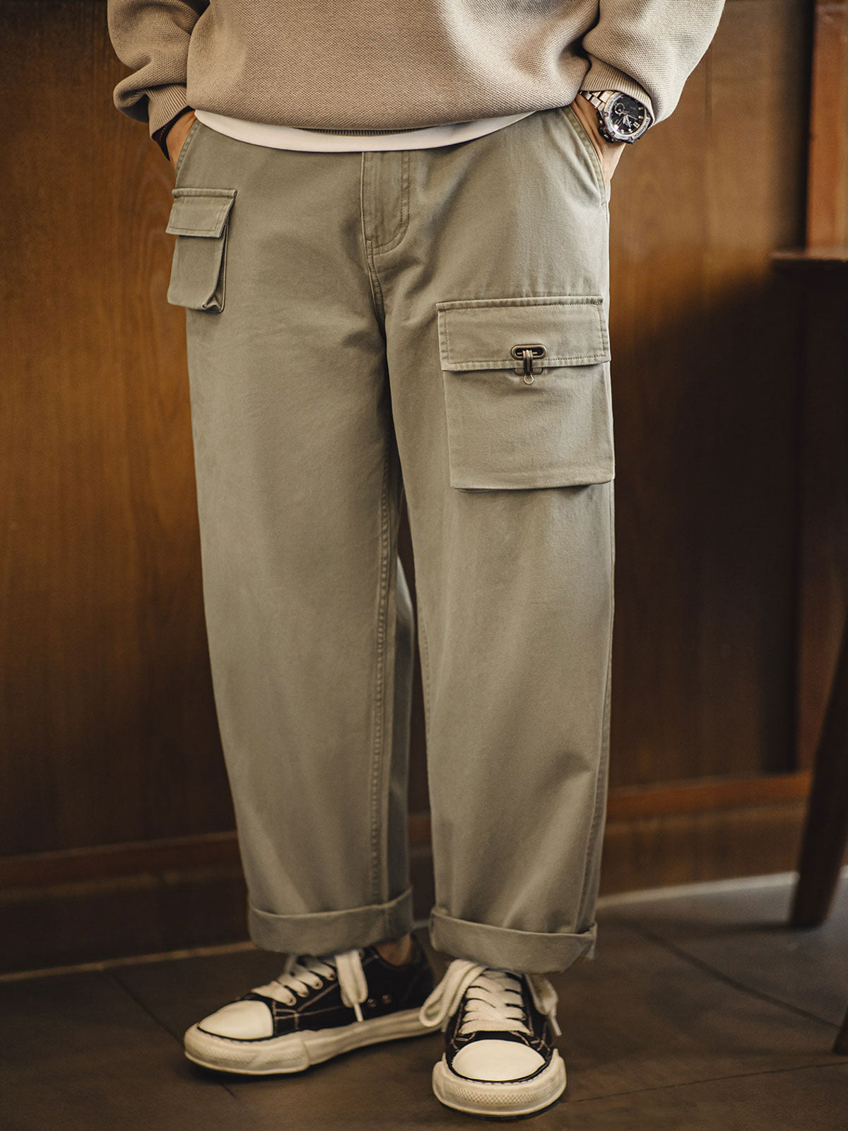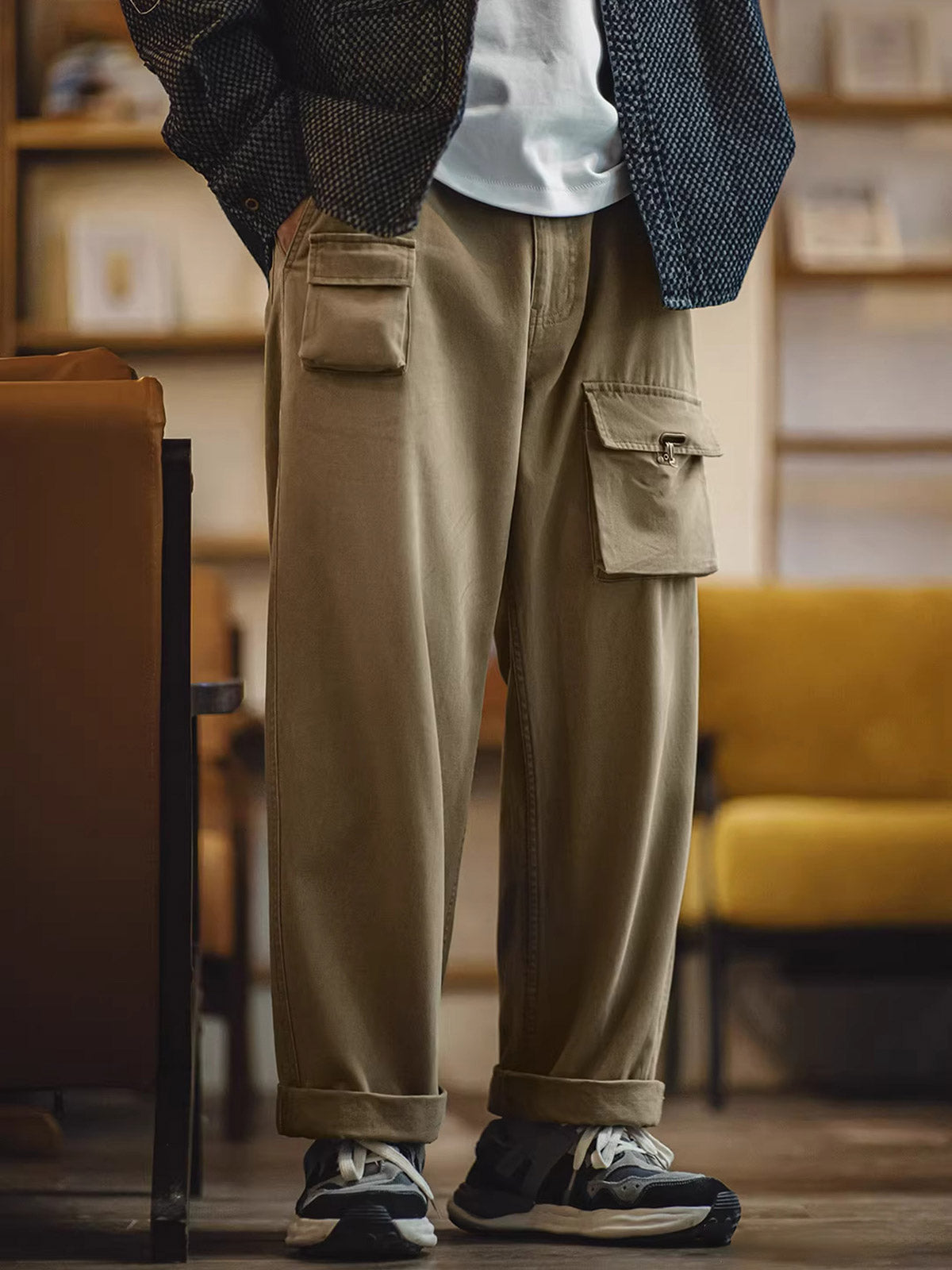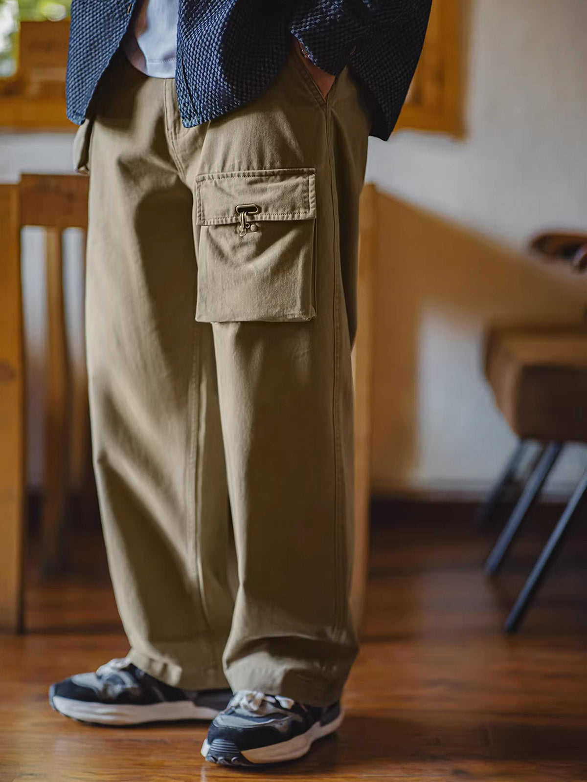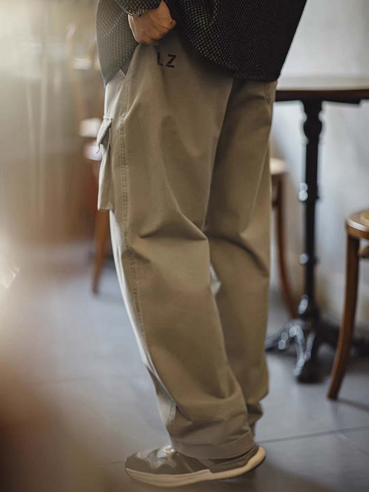 P37イギリス軍パンツをインスパイアした多ポケットデザインのワイドストレートミリタリーパンツ。