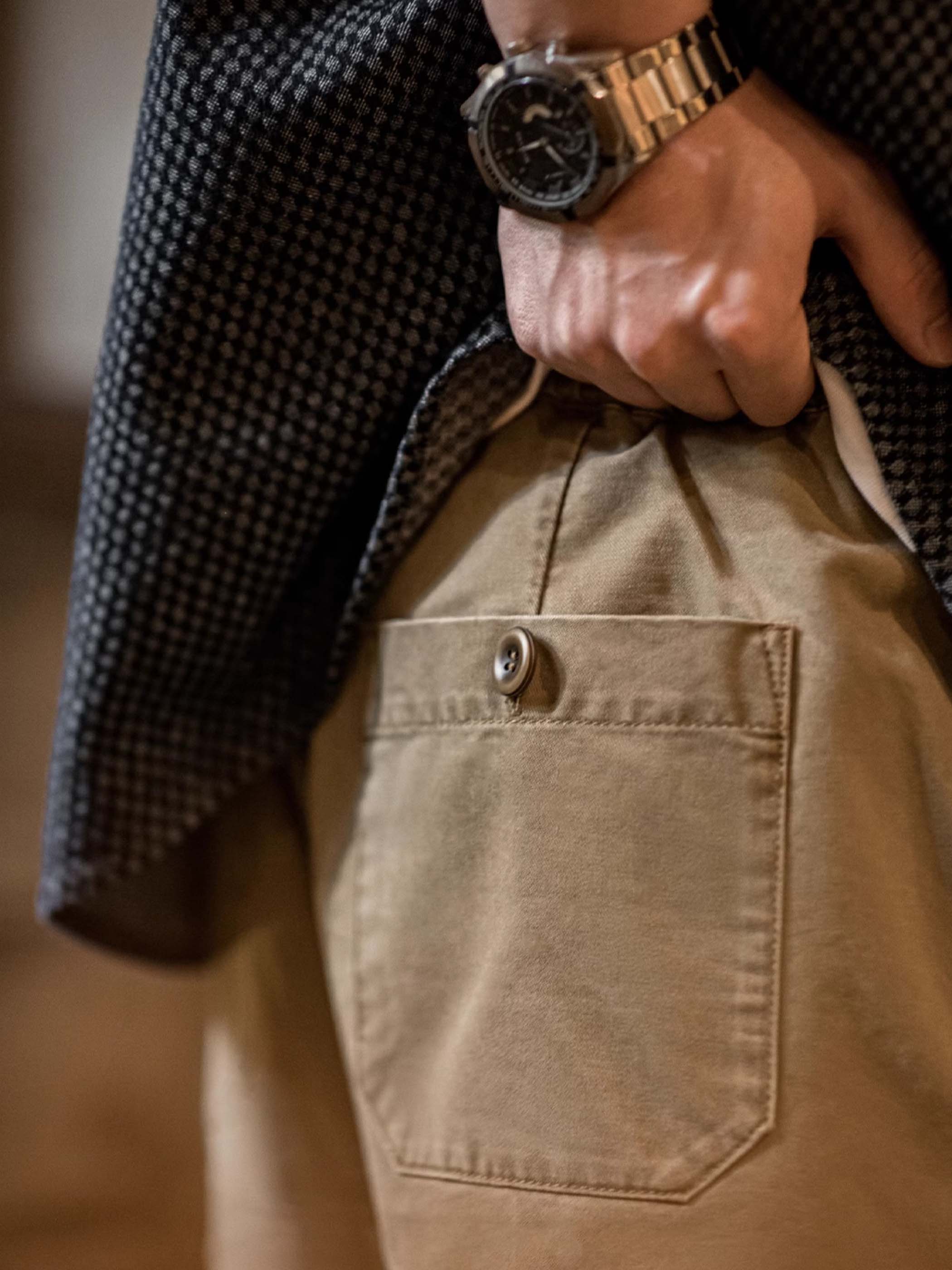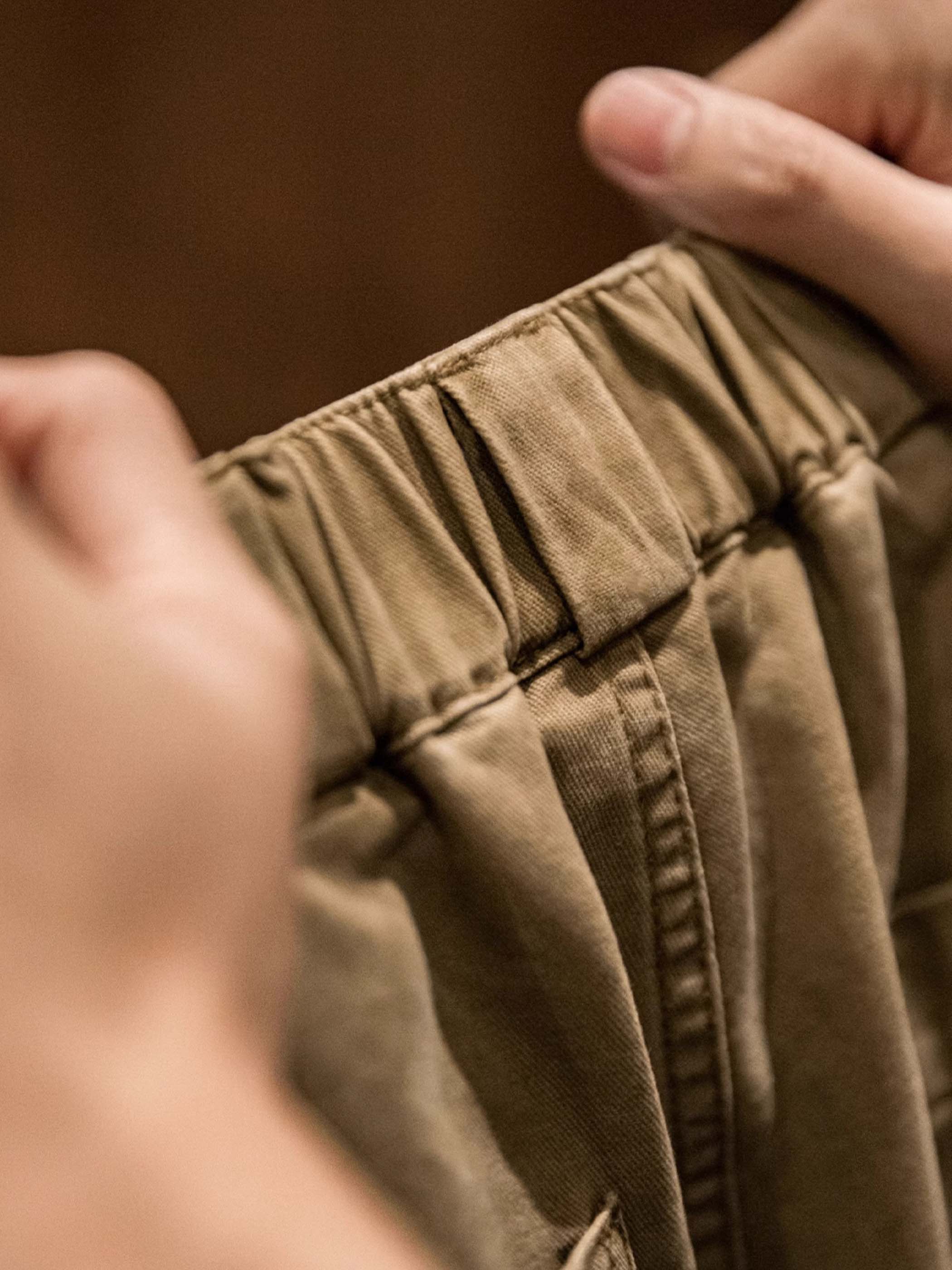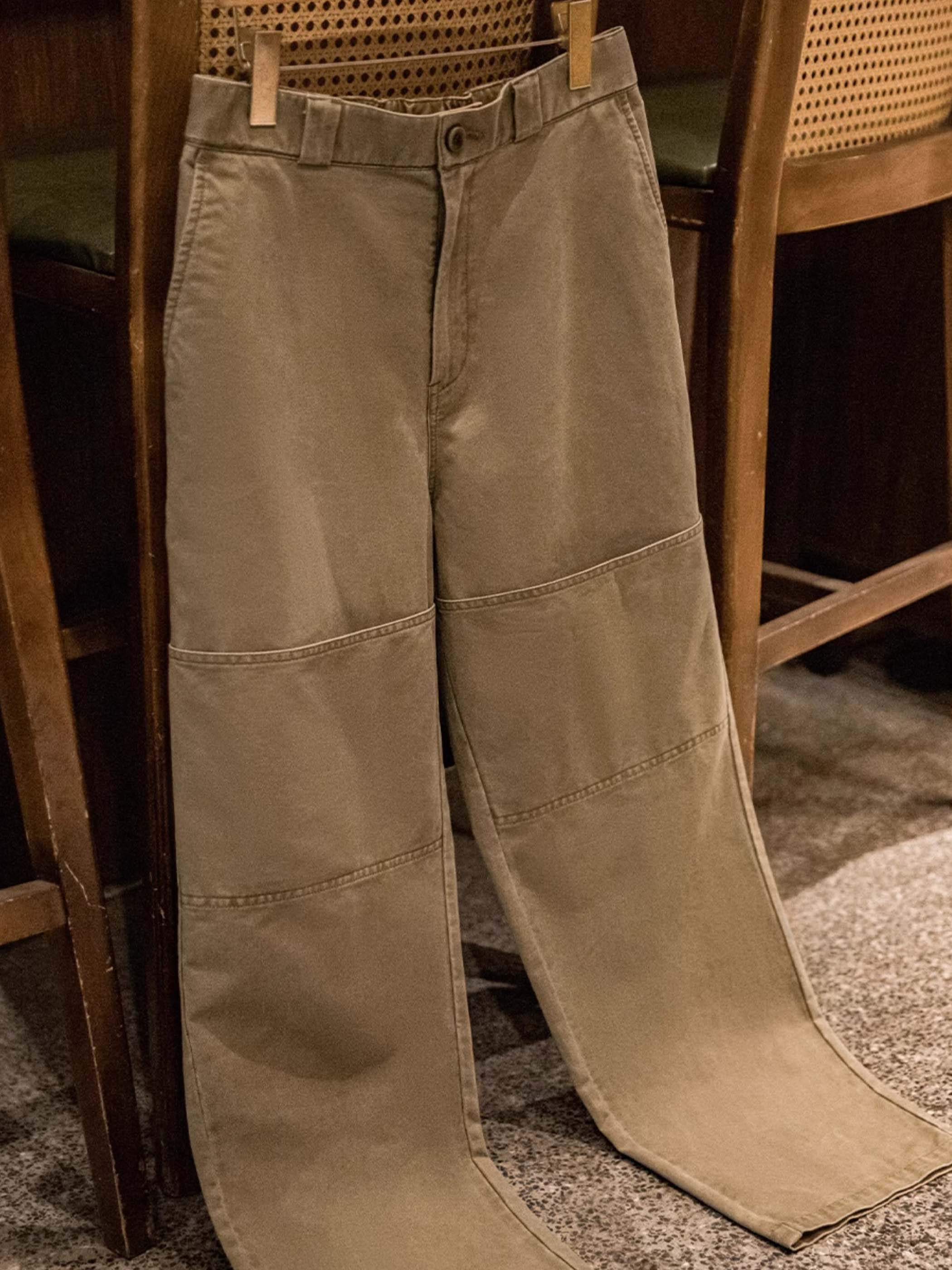 カラーバリエーションは、クラシックなカーキを基調とした落ち着いたトーンで、ヴィンテージシャツ、Tシャツ、ワークジャケットなど、さまざまなスタイルにマッチ。デイリーカジュアルからアウトドア、作業用ウェアとしても活躍する万能な一本です。