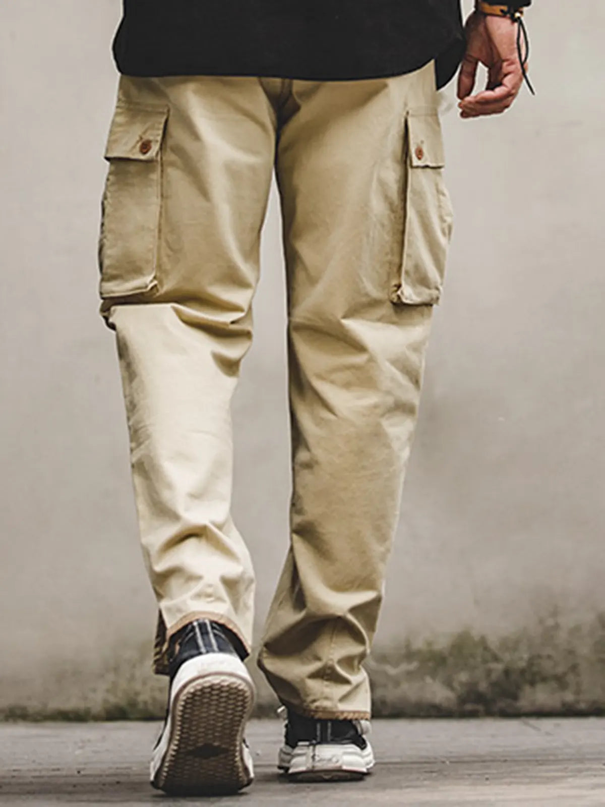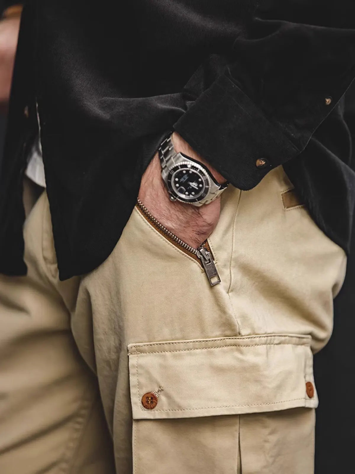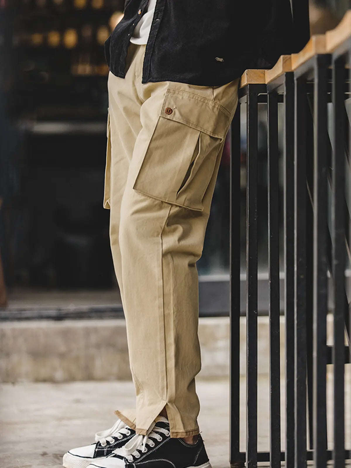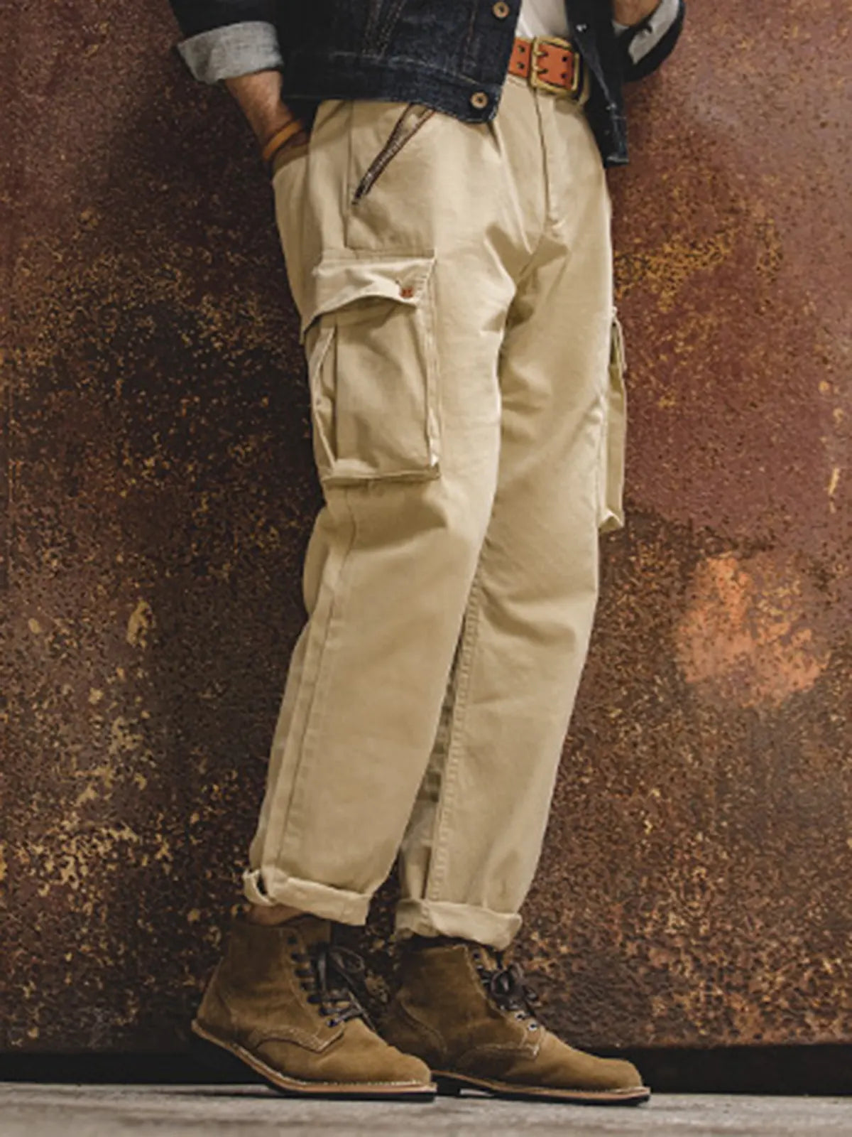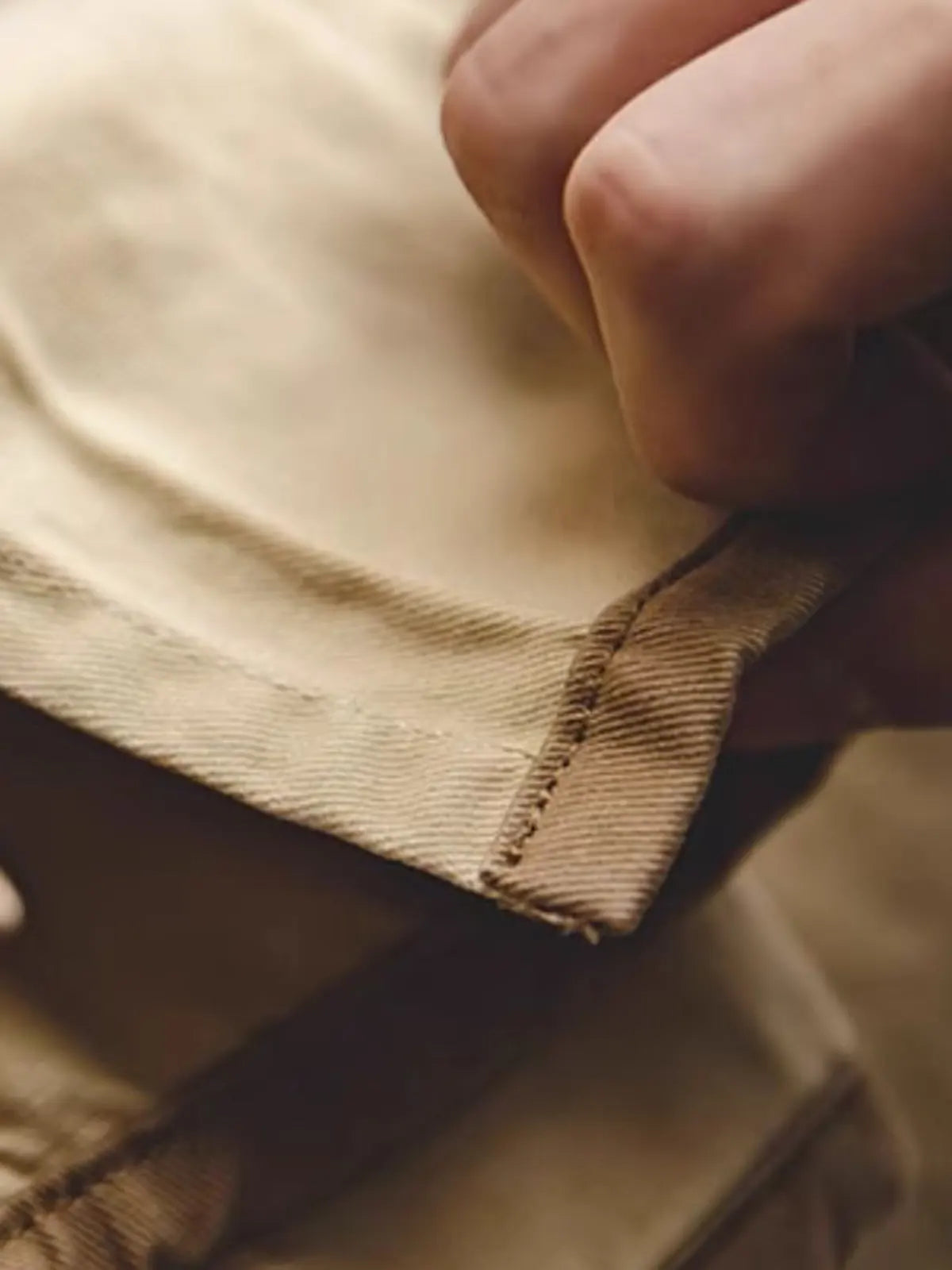 本パンツは、1940年代に山岳地帯で活動する軍隊のためにデザインされたパンツを参考に、ジップ式の斜めスラッシュポケットや大きめの立体風琴サイドポケットが特徴的。300g/m²のコットン100%生地を採用し、しっかりとしたハリと通気性を両立しています。裾はやや開きがあり、改良されたテーパードシルエットが脚をきれいに見せる効果を発揮。ミリタリーアイテム特有の無骨さを保ちつつ、日常コーデにも取り入れやすいデザインに仕上げています。