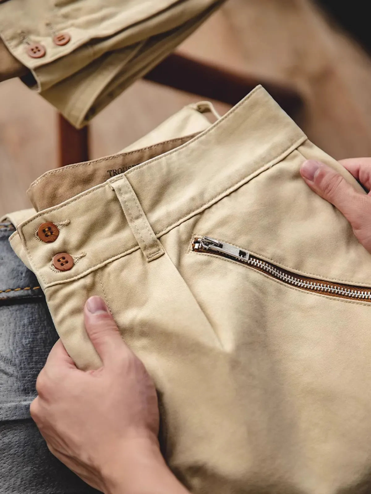 このパンツは、1940年代の山岳軍パンツをベースに、斜めジップポケットや立体風琴ポケット、脚口の開きなど独特のディテールでミリタリーテイストを洗練されたモダンスタイルに仕上げた一本です。