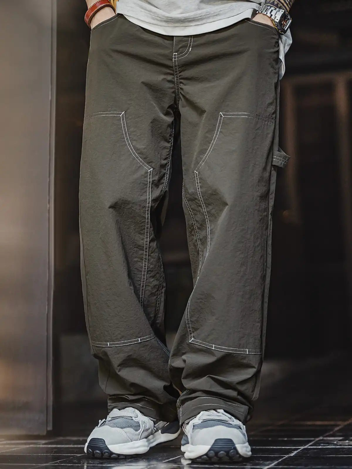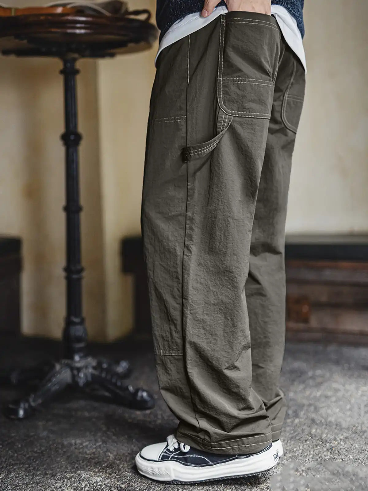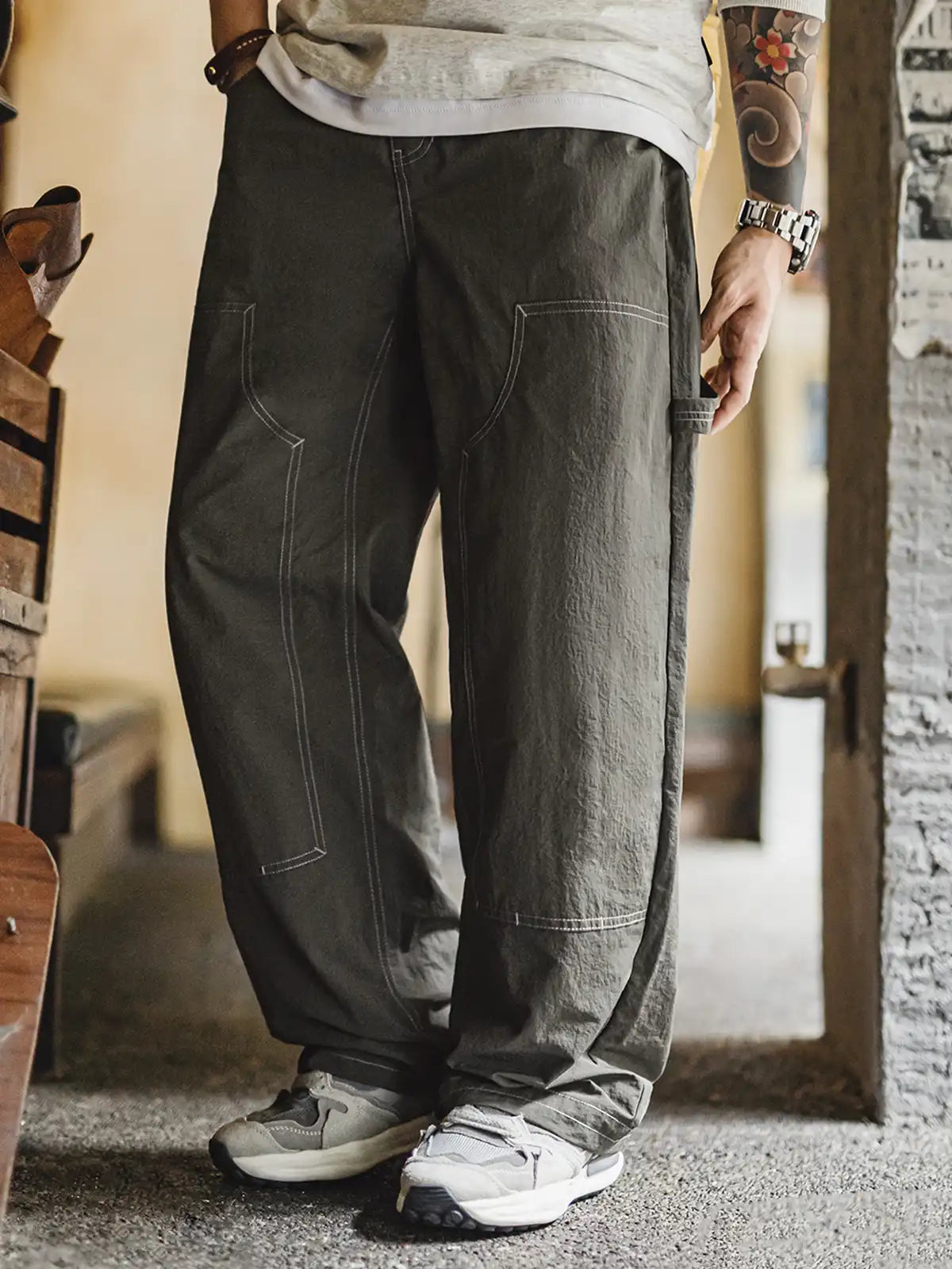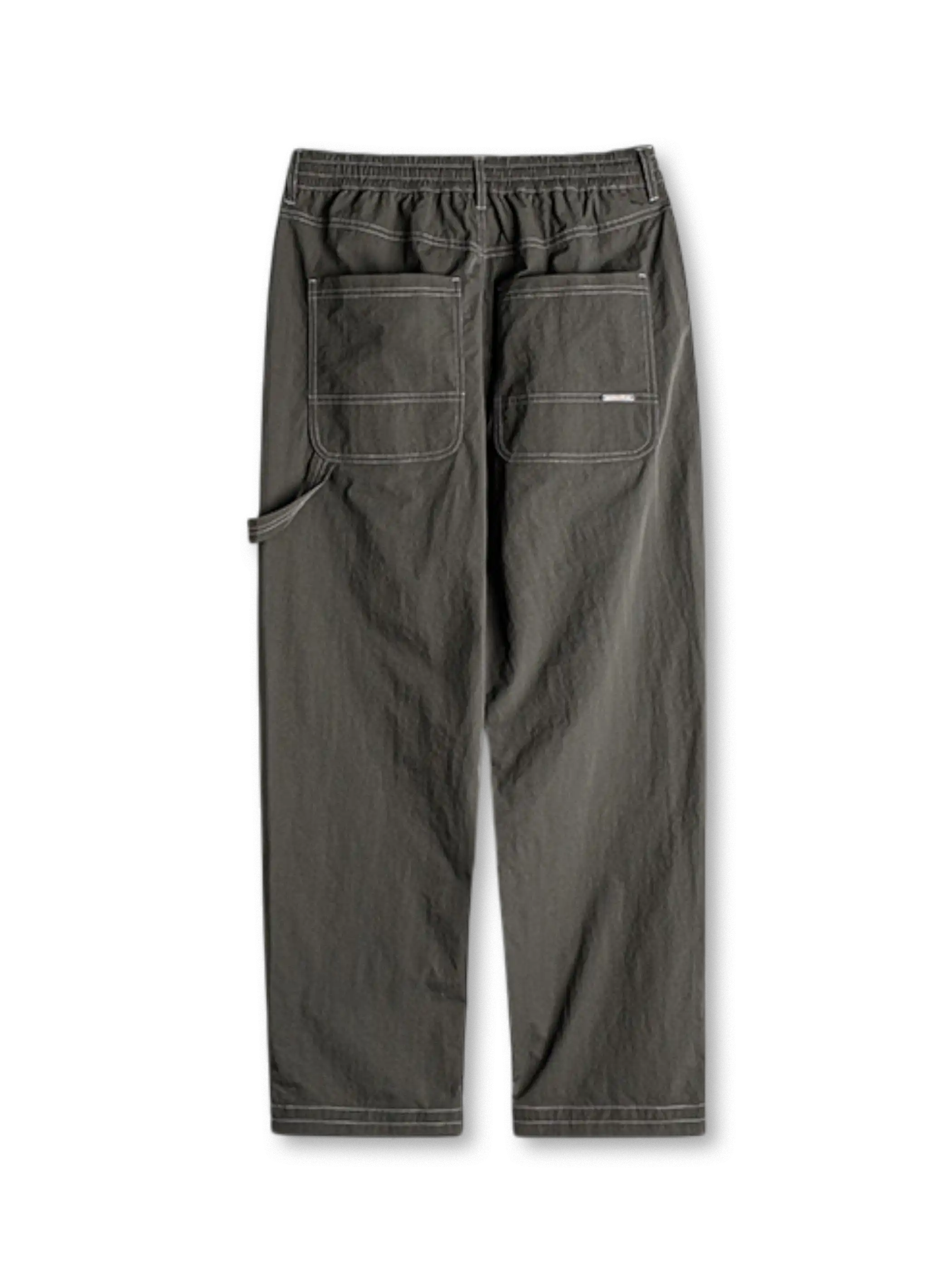 20世紀初頭の伐木工パンツを現代的に再解釈し、カーキコットンを置き換えた「池藻グリーン」TASLONを採用。ダブルニーパッチとハンマーループを配した本格仕様ながら、ドローストリングのウエストでラフに穿きこなせるリラックスシルエットを実現。130g/m²の軽量撥水TASLONは肌触りが滑らかで速乾性に優れ、太腿から裾にかけて自然に落ちるドレープが美しい一本です。