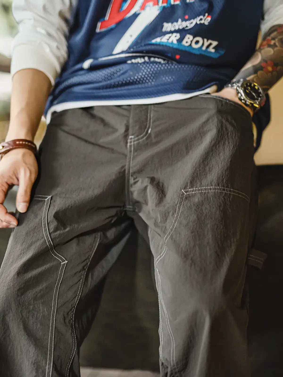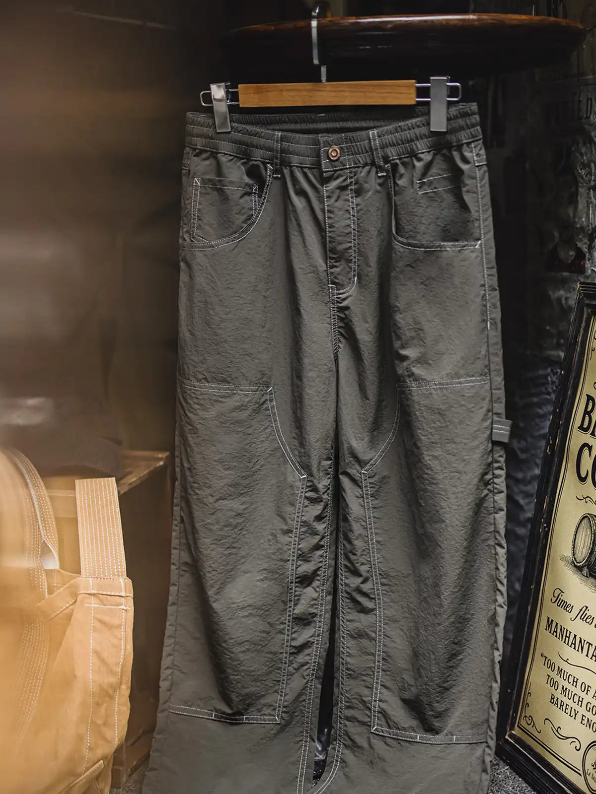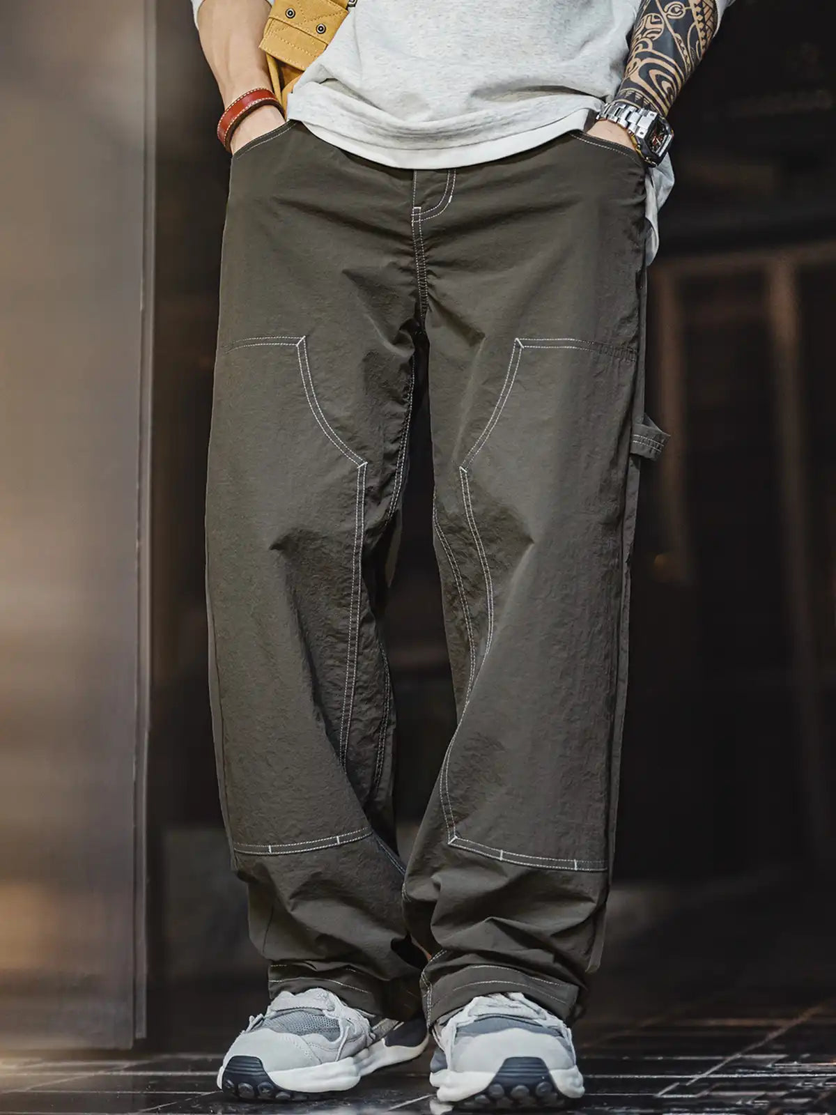 20世紀初頭の伐木工パンツを現代的に再解釈し、カーキコットンを置き換えた「池藻グリーン」TASLONを採用。ダブルニーパッチとハンマーループを配した本格仕様ながら、ドローストリングのウエストでラフに穿きこなせるリラックスシルエットを実現。130g/m²の軽量撥水TASLONは肌触りが滑らかで速乾性に優れ、太腿から裾にかけて自然に落ちるドレープが美しい一本です。