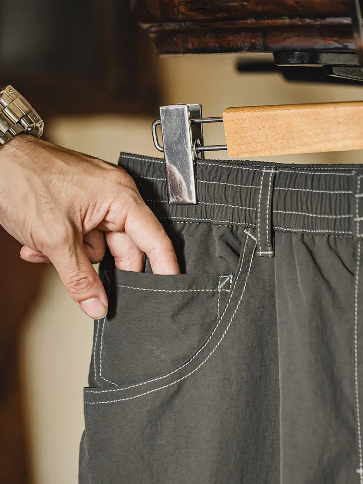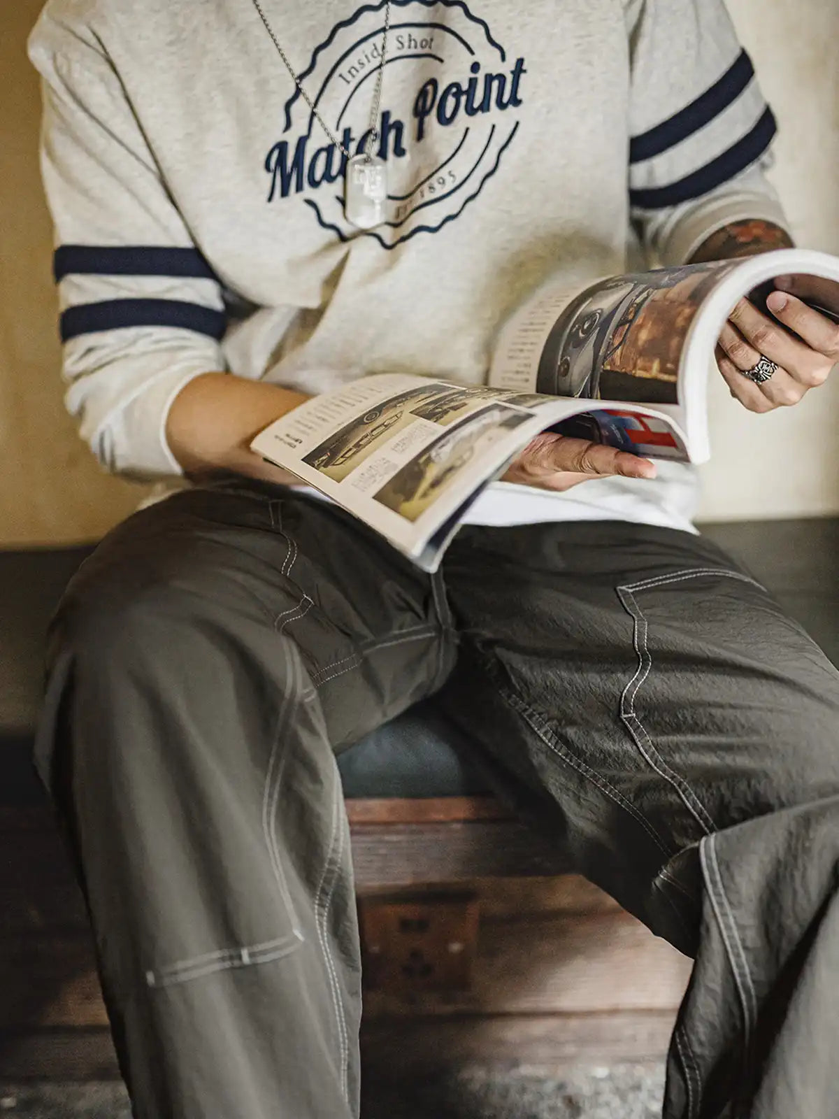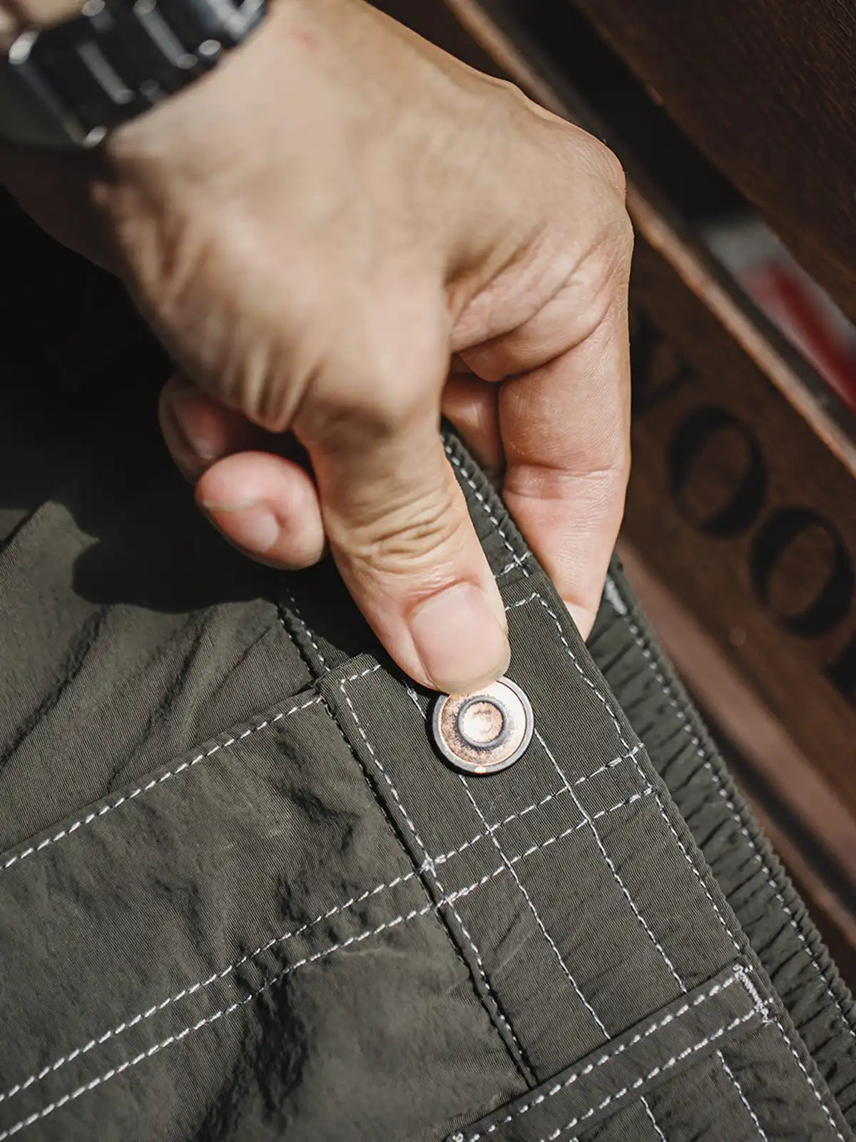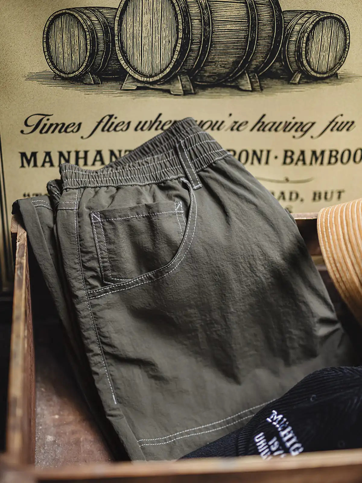 20世紀初頭の伐木工パンツを現代的に再解釈し、カーキコットンを置き換えた「池藻グリーン」TASLONを採用。ダブルニーパッチとハンマーループを配した本格仕様ながら、ドローストリングのウエストでラフに穿きこなせるリラックスシルエットを実現。130g/m²の軽量撥水TASLONは肌触りが滑らかで速乾性に優れ、太腿から裾にかけて自然に落ちるドレープが美しい一本です。