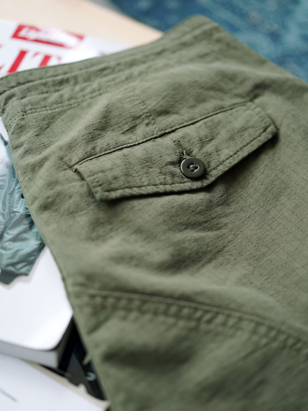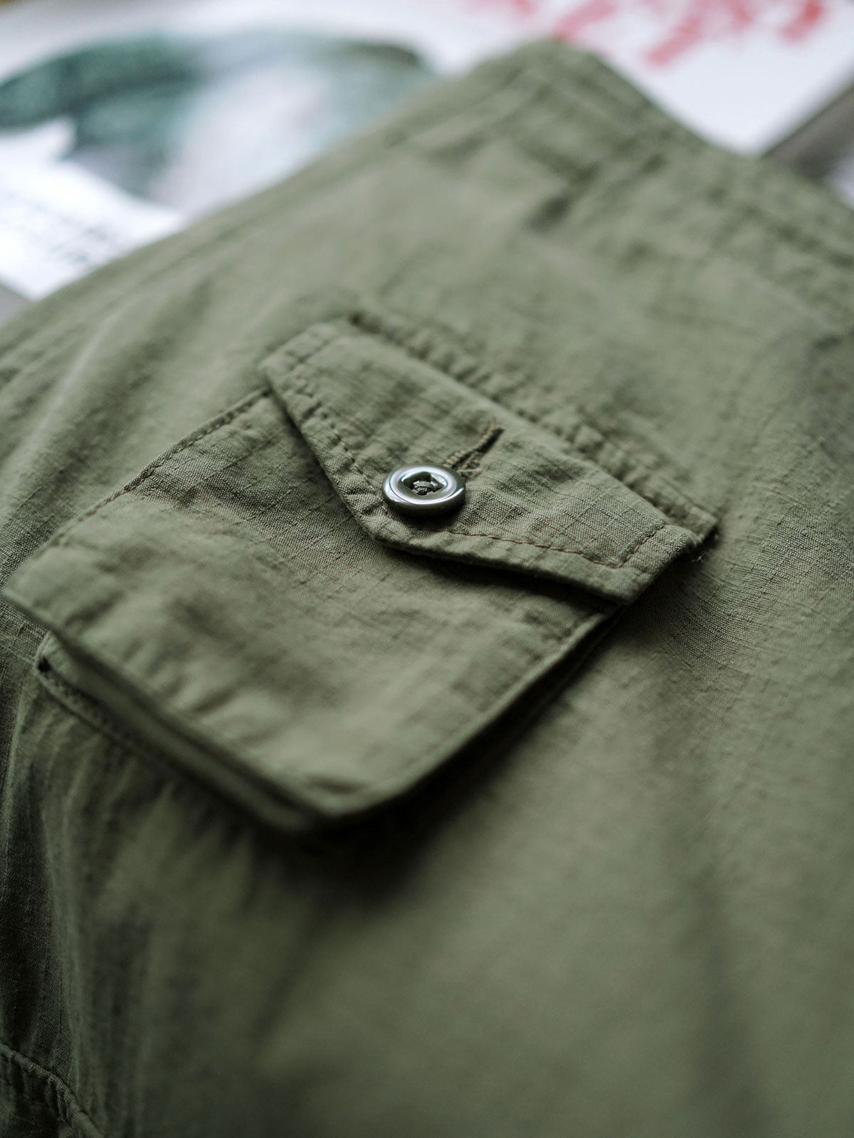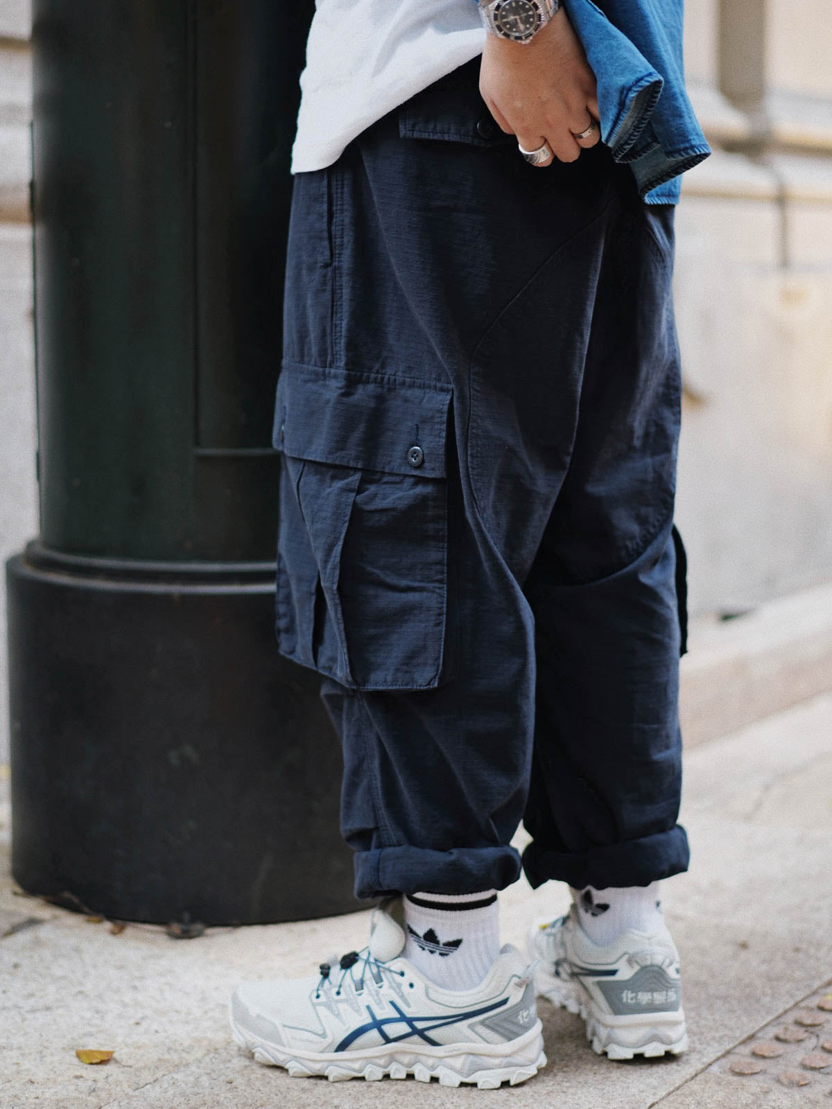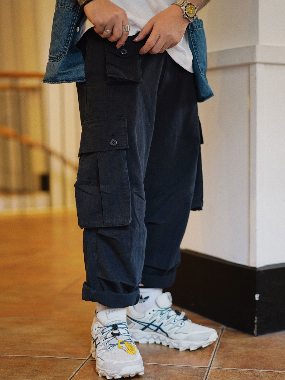 このワークパンツは、100%コットンのミリタリースタイルの生地を使用しており、ガーメントウォッシュ加工により質感と風合いが引き立っています。生地は耐久性が高く、日常の着用に最適です。バルーンポケットデザインは収納力を高め、実用性を追求しながらもスタイリッシュな印象を与えます。アーチ型ステッチがミリタリースタイルをさらに引き立てます。強いドレープ感のある素材は、ロールアップしてもそのままでも美しいシルエットを保ち、幅広いコーディネートに対応します。