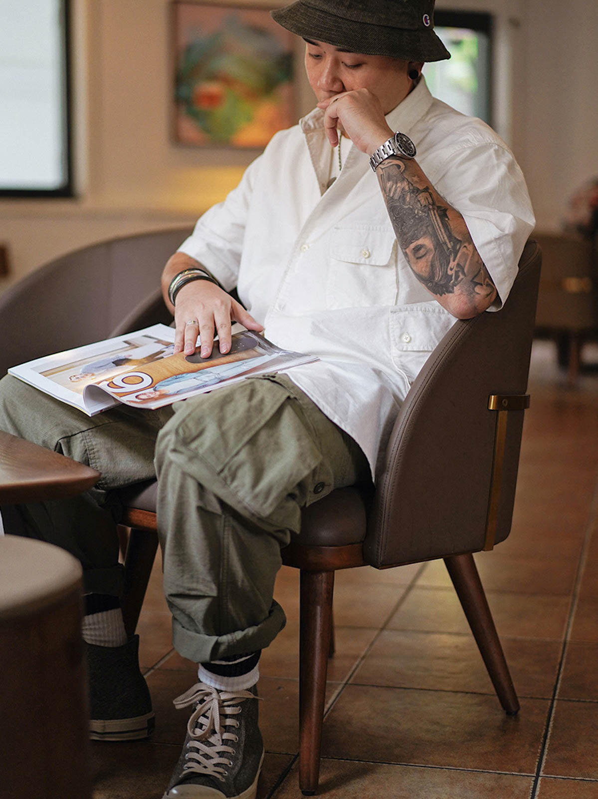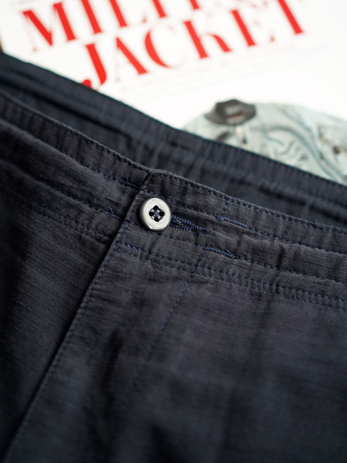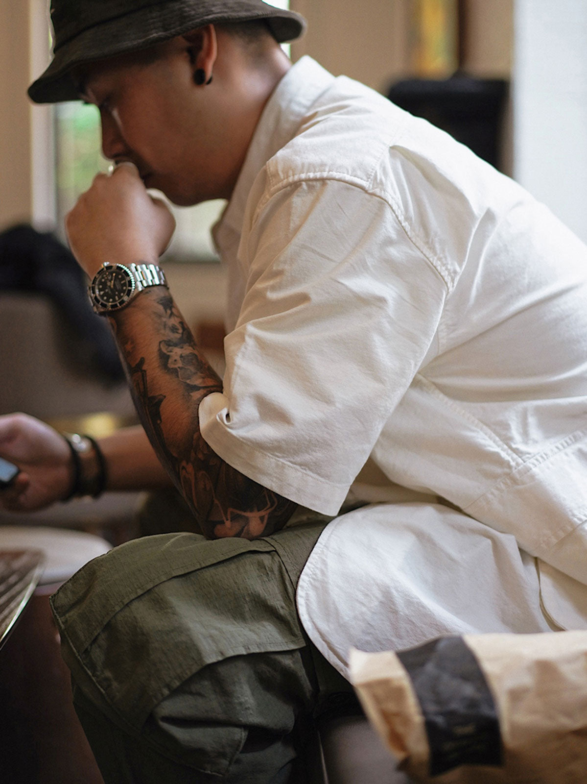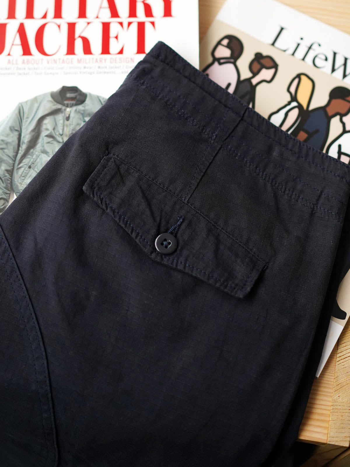 このワークパンツは、100%コットンのミリタリースタイルの生地を使用しており、ガーメントウォッシュ加工により質感と風合いが引き立っています。生地は耐久性が高く、日常の着用に最適です。バルーンポケットデザインは収納力を高め、実用性を追求しながらもスタイリッシュな印象を与えます。アーチ型ステッチがミリタリースタイルをさらに引き立てます。強いドレープ感のある素材は、ロールアップしてもそのままでも美しいシルエットを保ち、幅広いコーディネートに対応します。