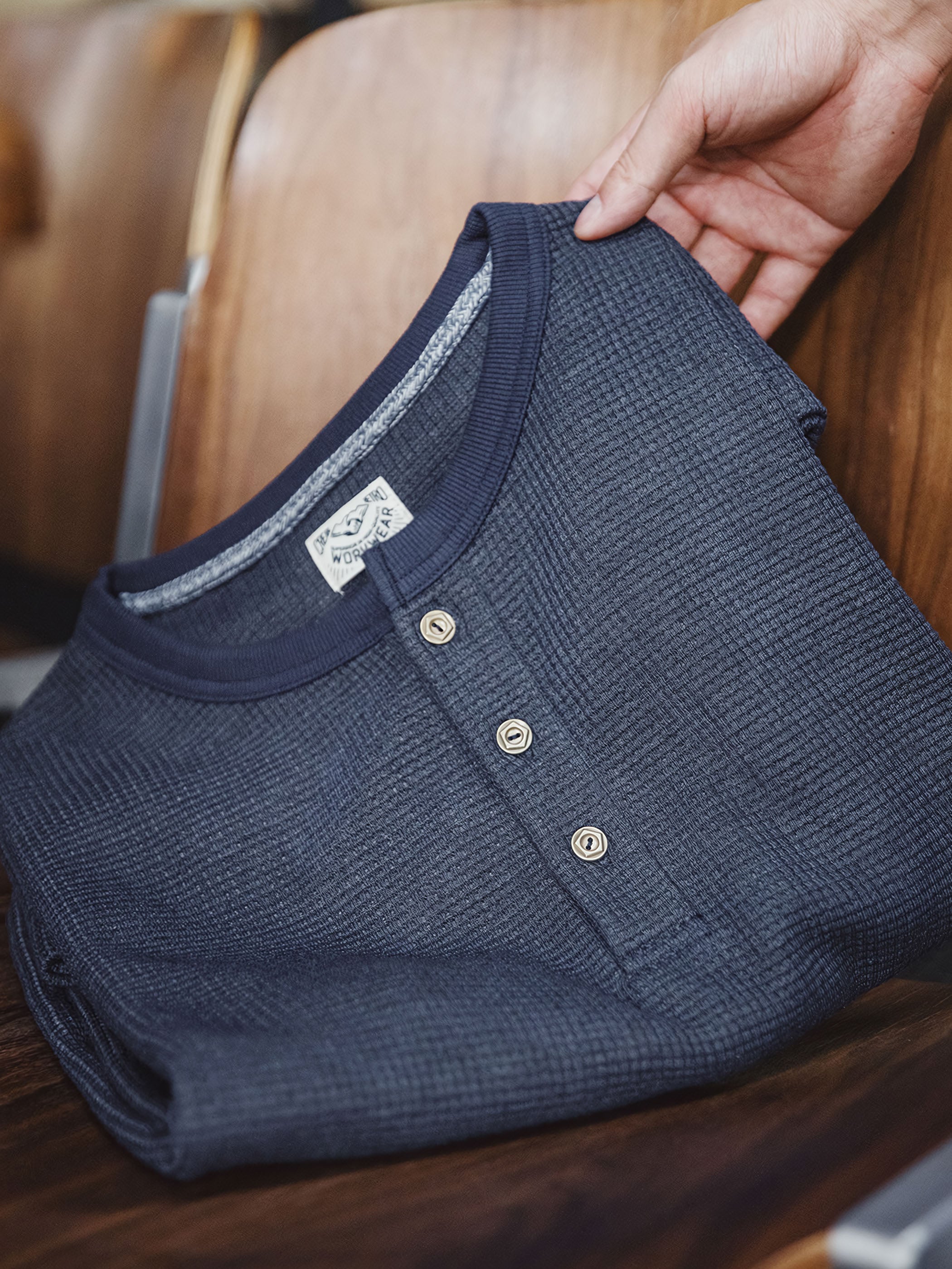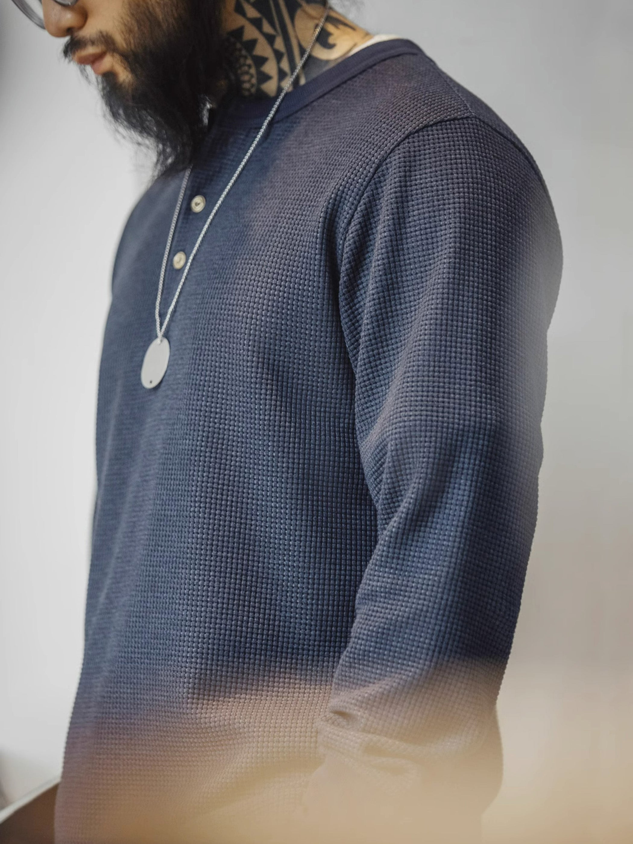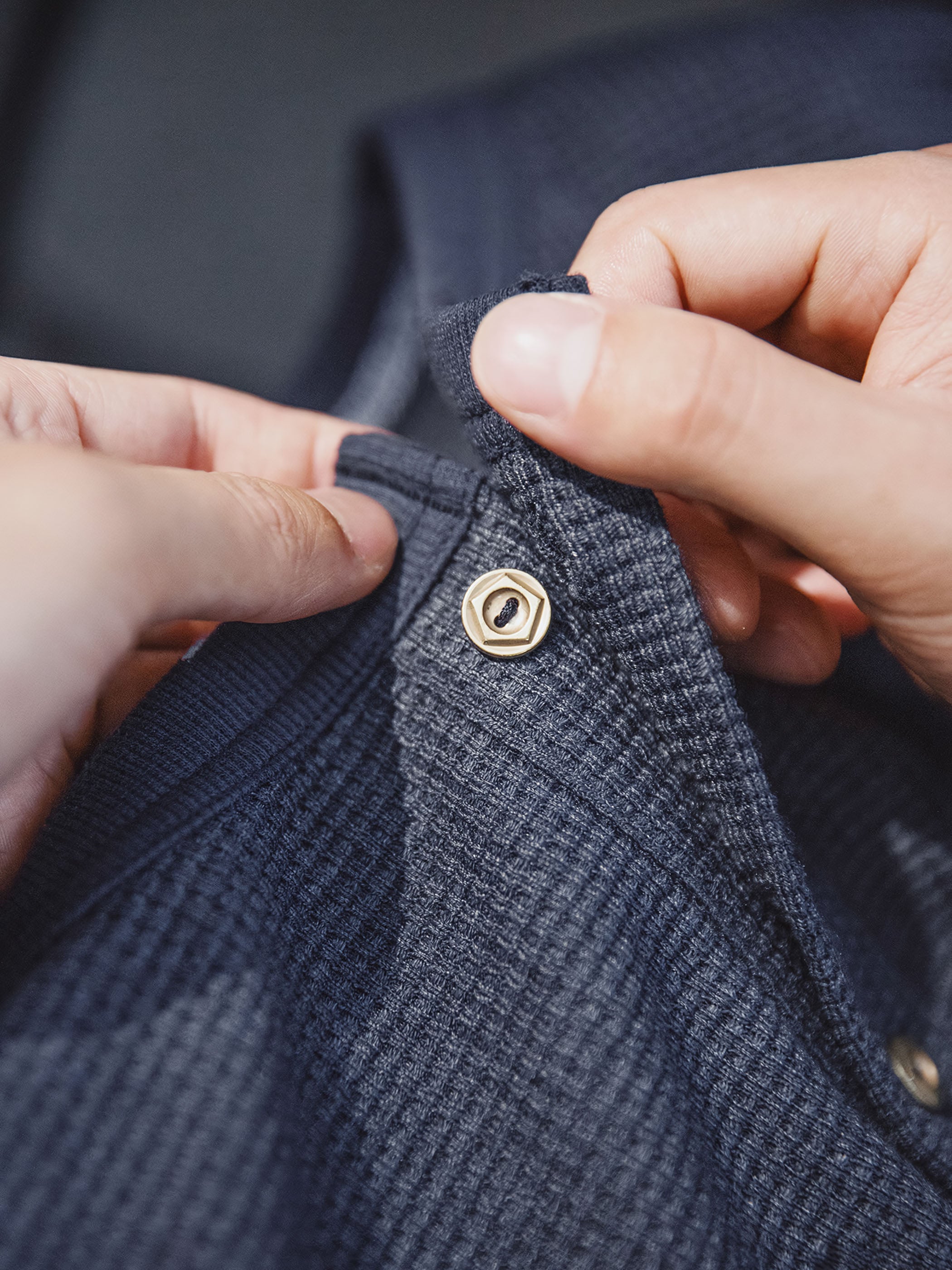 このヘンリーシャツはワッフル状の織り模様を採用し、クラシックなスタイルを表現しています。リブ編みの襟と袖口はシャツに上品な趣を加えています。袖口のナット形状のデザインは全体のディテールを引き立て、シャツに独自の特徴をもたらしています。