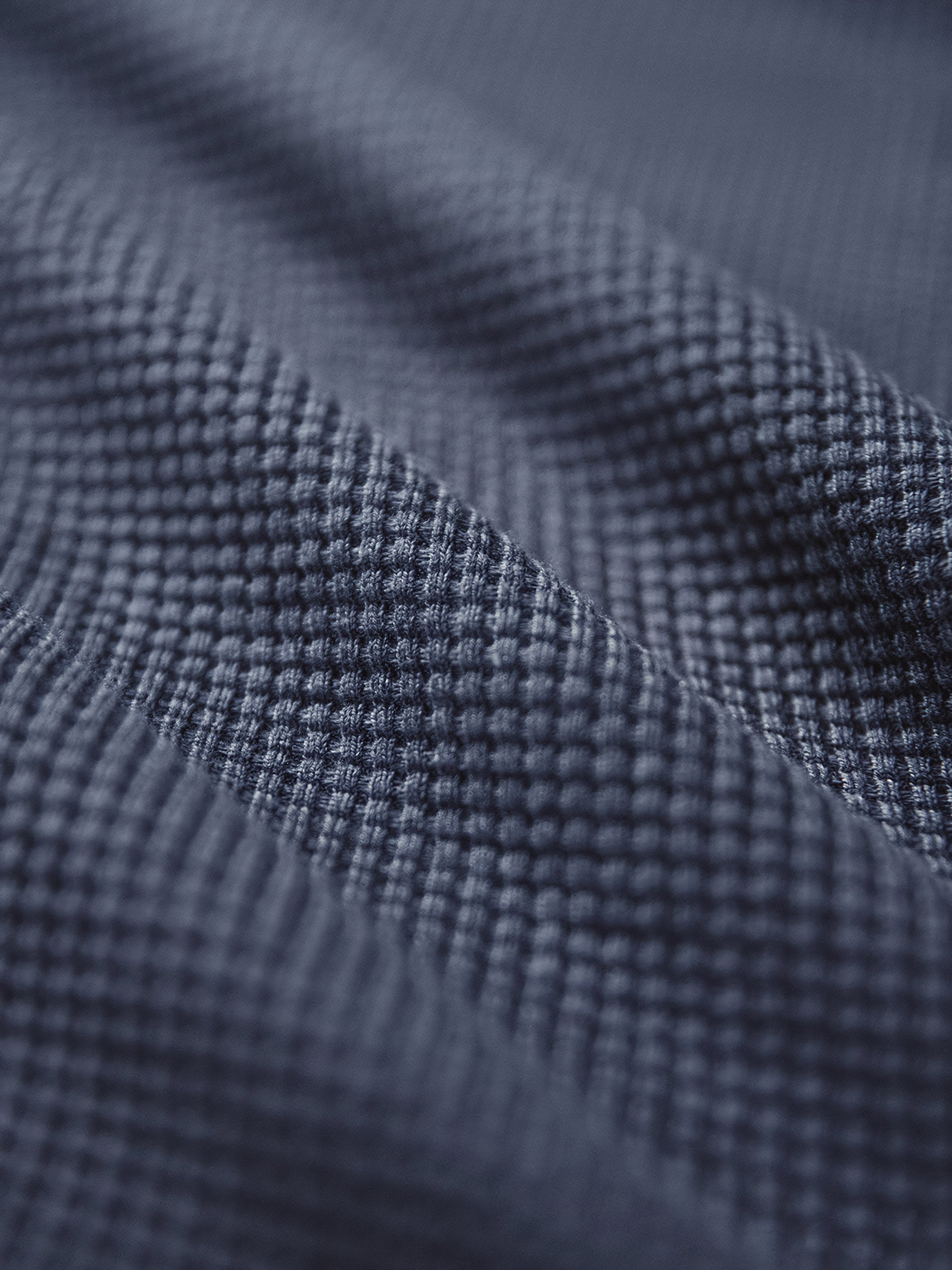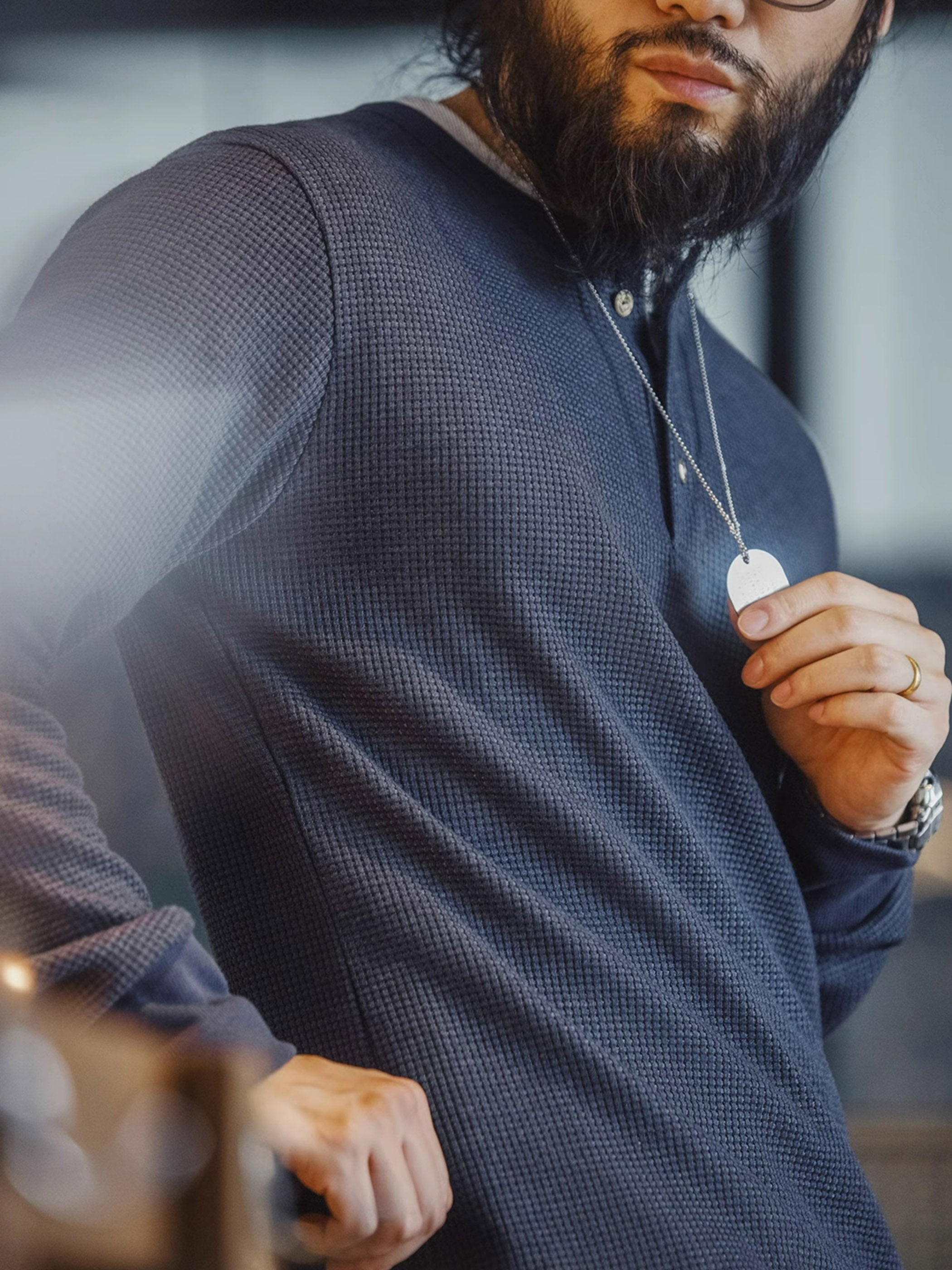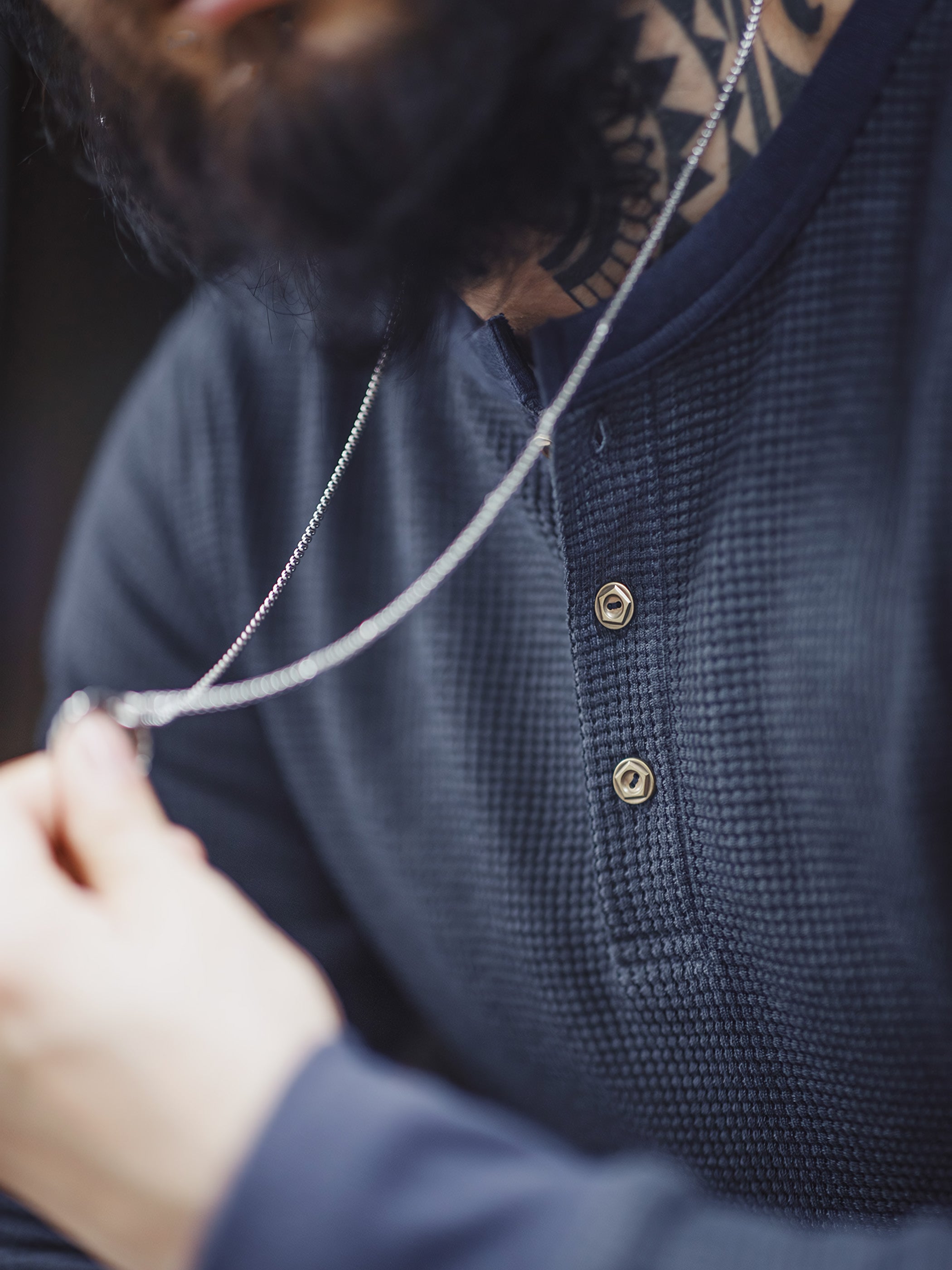 このヘンリーシャツはワッフル状の織り模様を採用し、クラシックなスタイルを表現しています。リブ編みの襟と袖口はシャツに上品な趣を加えています。袖口のナット形状のデザインは全体のディテールを引き立て、シャツに独自の特徴をもたらしています。