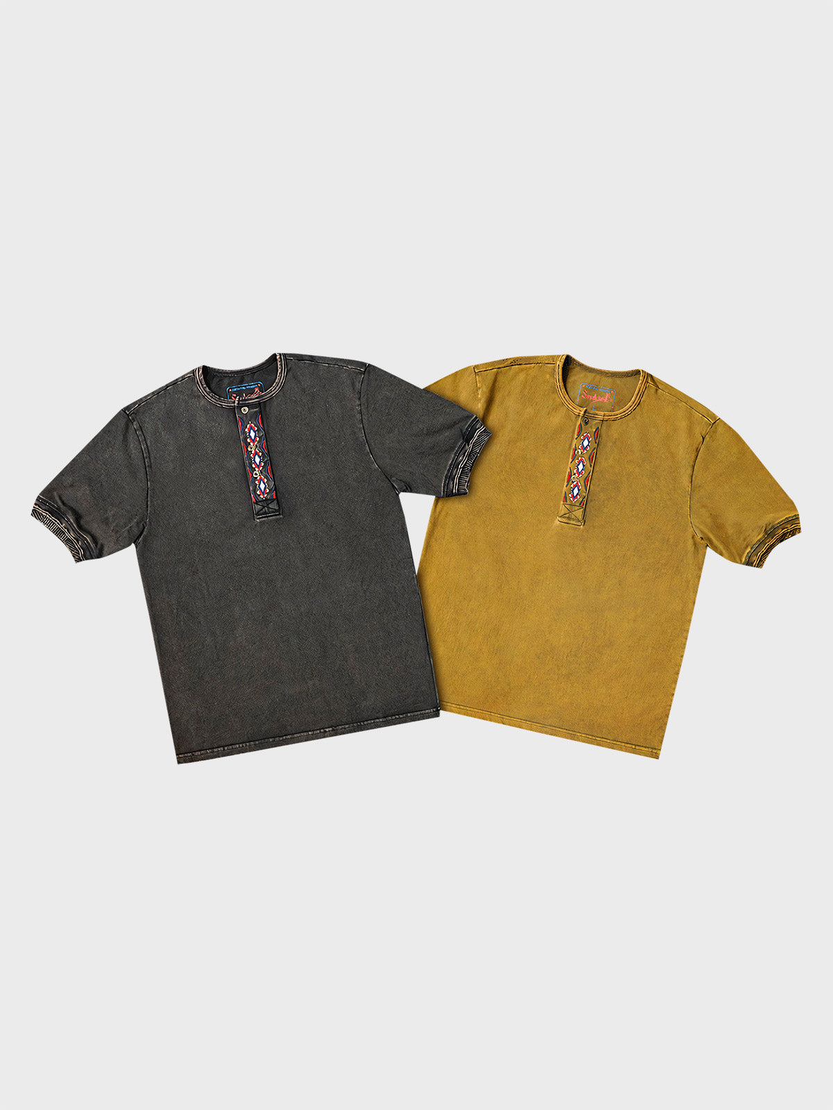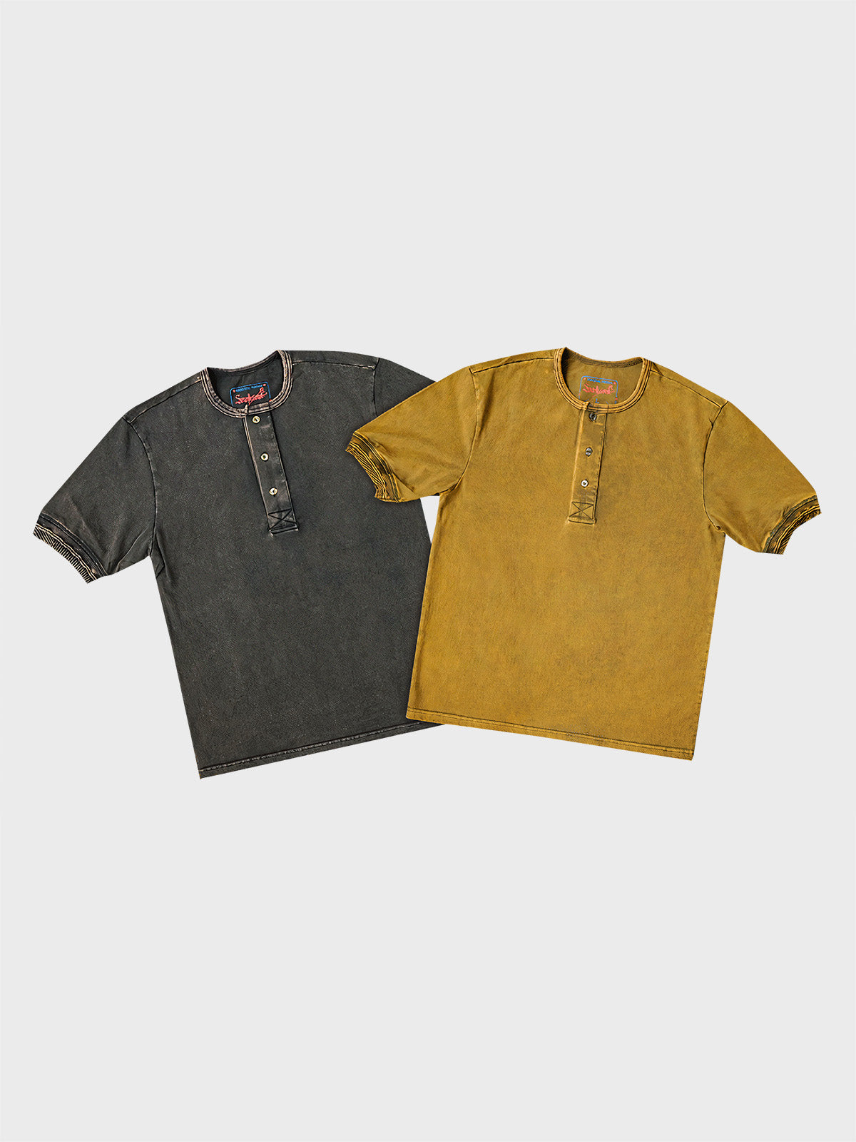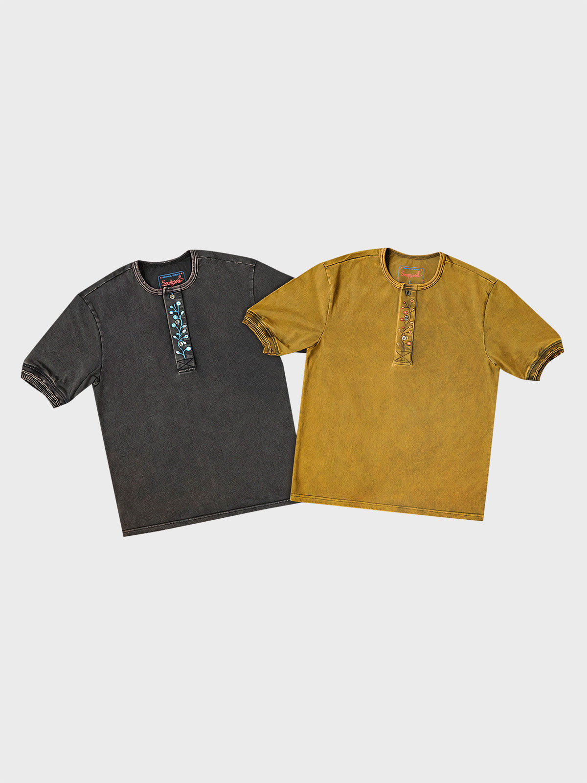 このヘンリーネック半袖シャツはアメリカンヴィンテージスタイルと精巧な刺繍技術を融合し、古着のようなヴィンテージ加工が施されています。この加工技術により、各アイテムが独自の歴史感と質感を持つことが特徴です。
