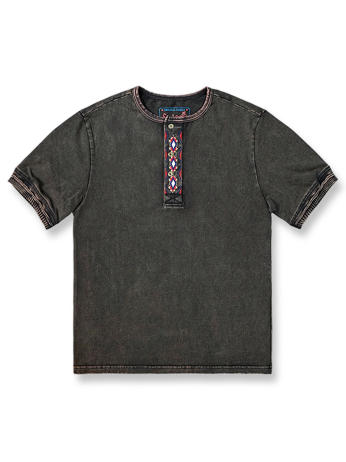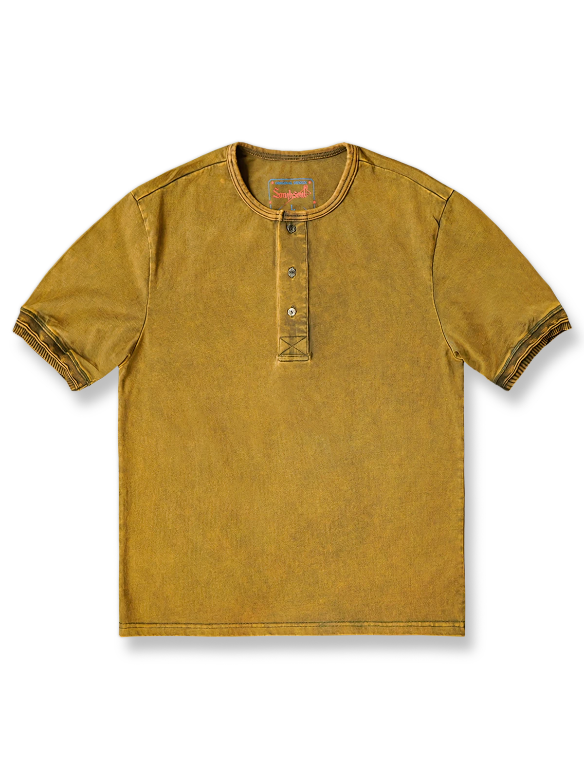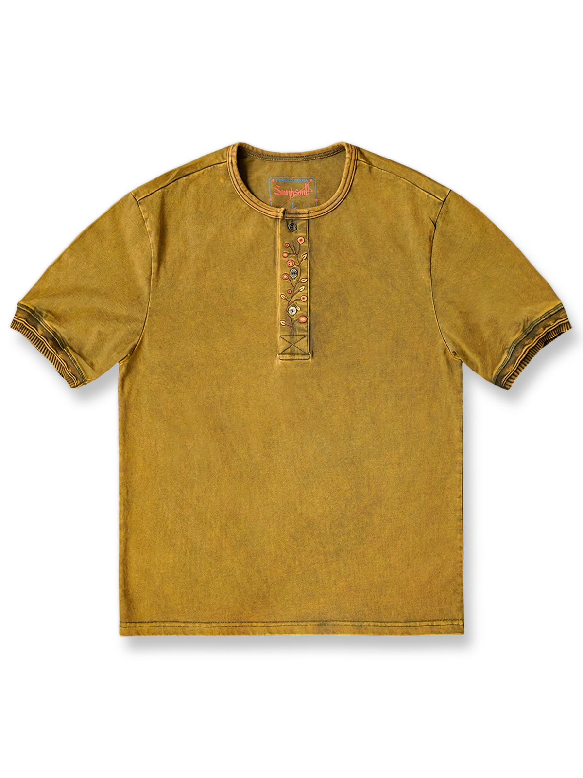 このヘンリーネック半袖シャツはアメリカンヴィンテージスタイルと精巧な刺繍技術を融合し、古着のようなヴィンテージ加工が施されています。この加工技術により、各アイテムが独自の歴史感と質感を持つことが特徴です。