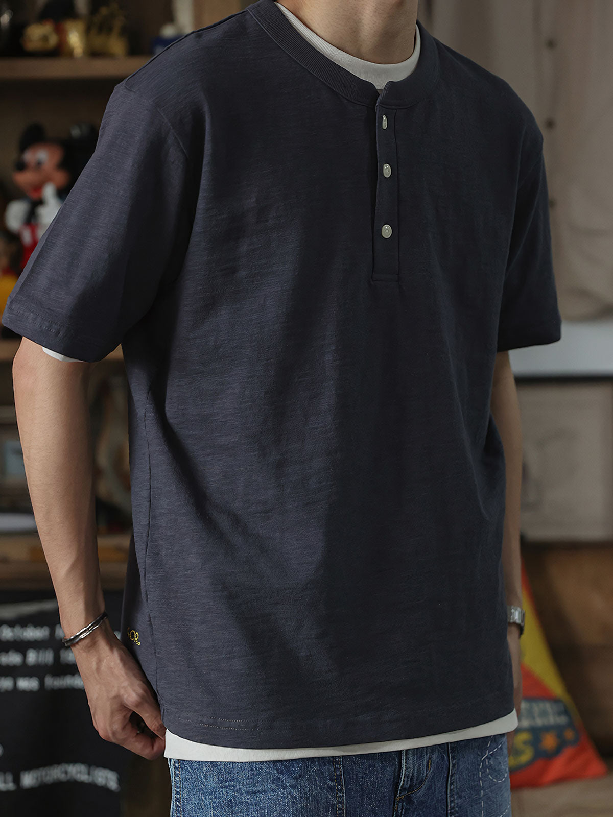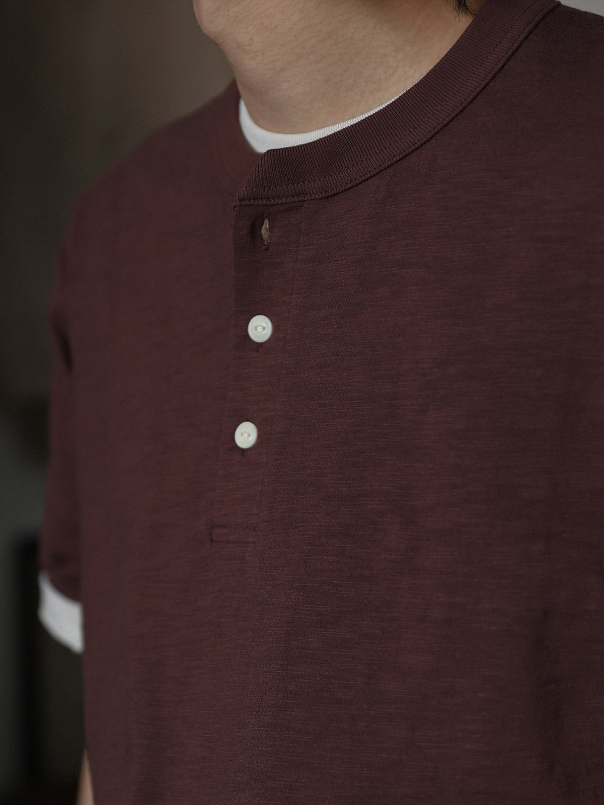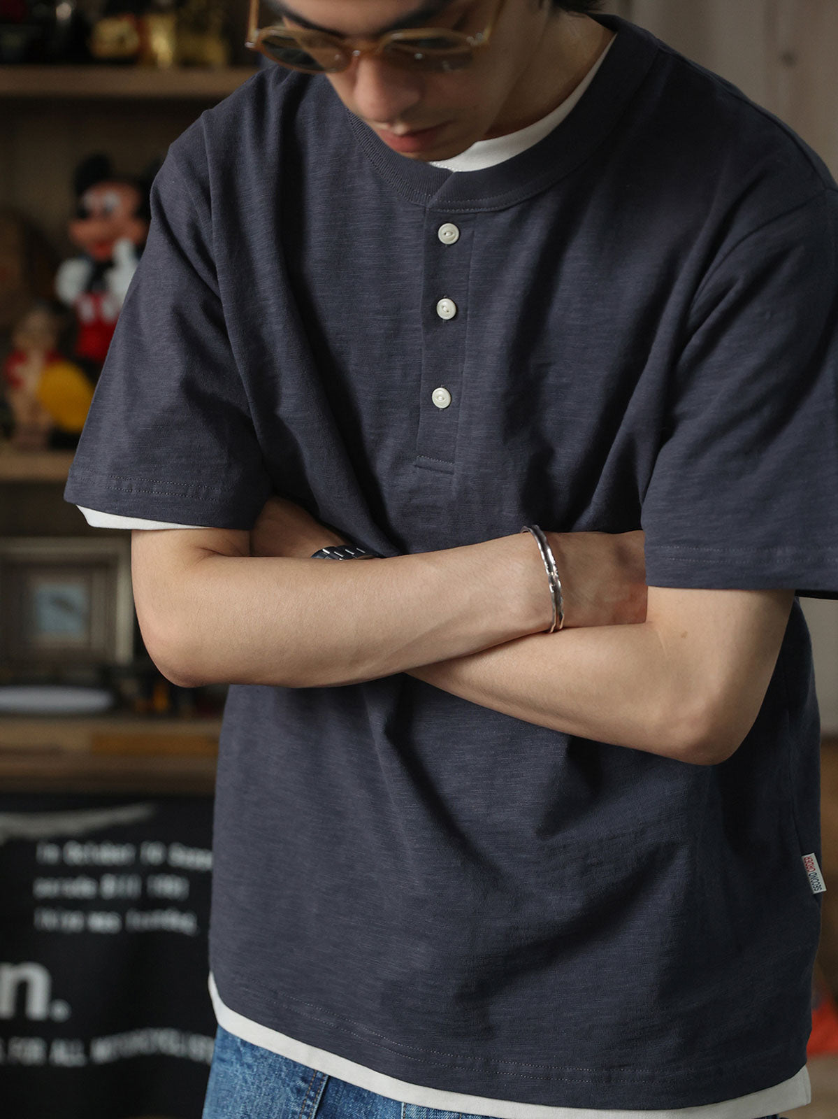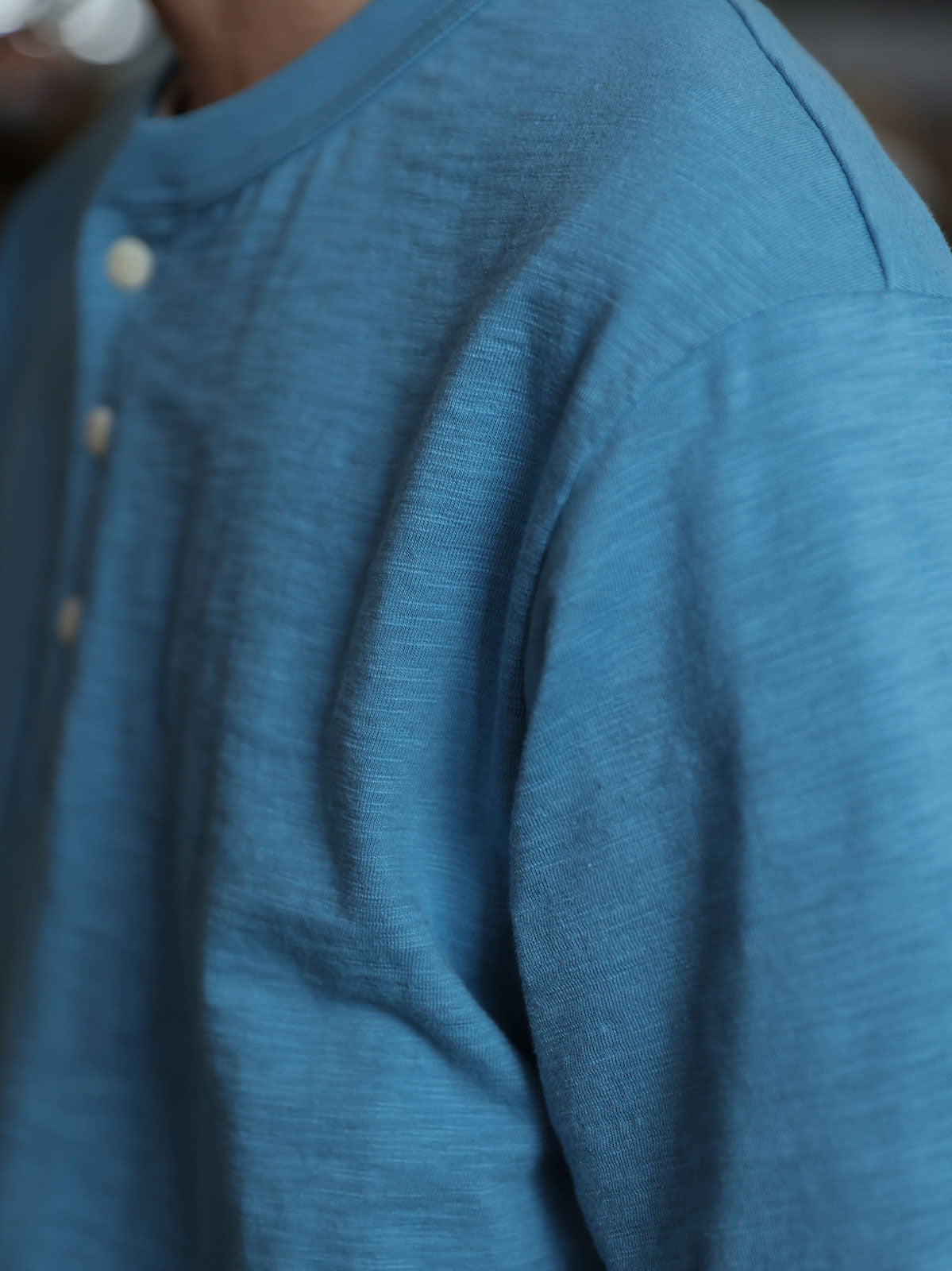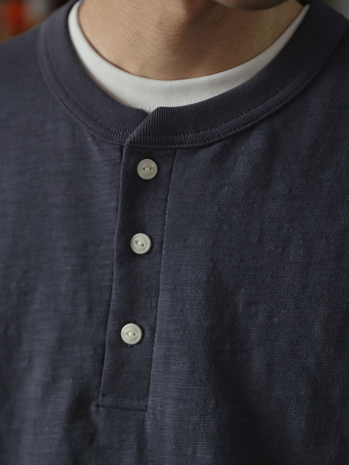 クラシックなヘンリーネックデザイン。高品質なスラブコットン素材を使用し、多様な魅力を引き立てます。