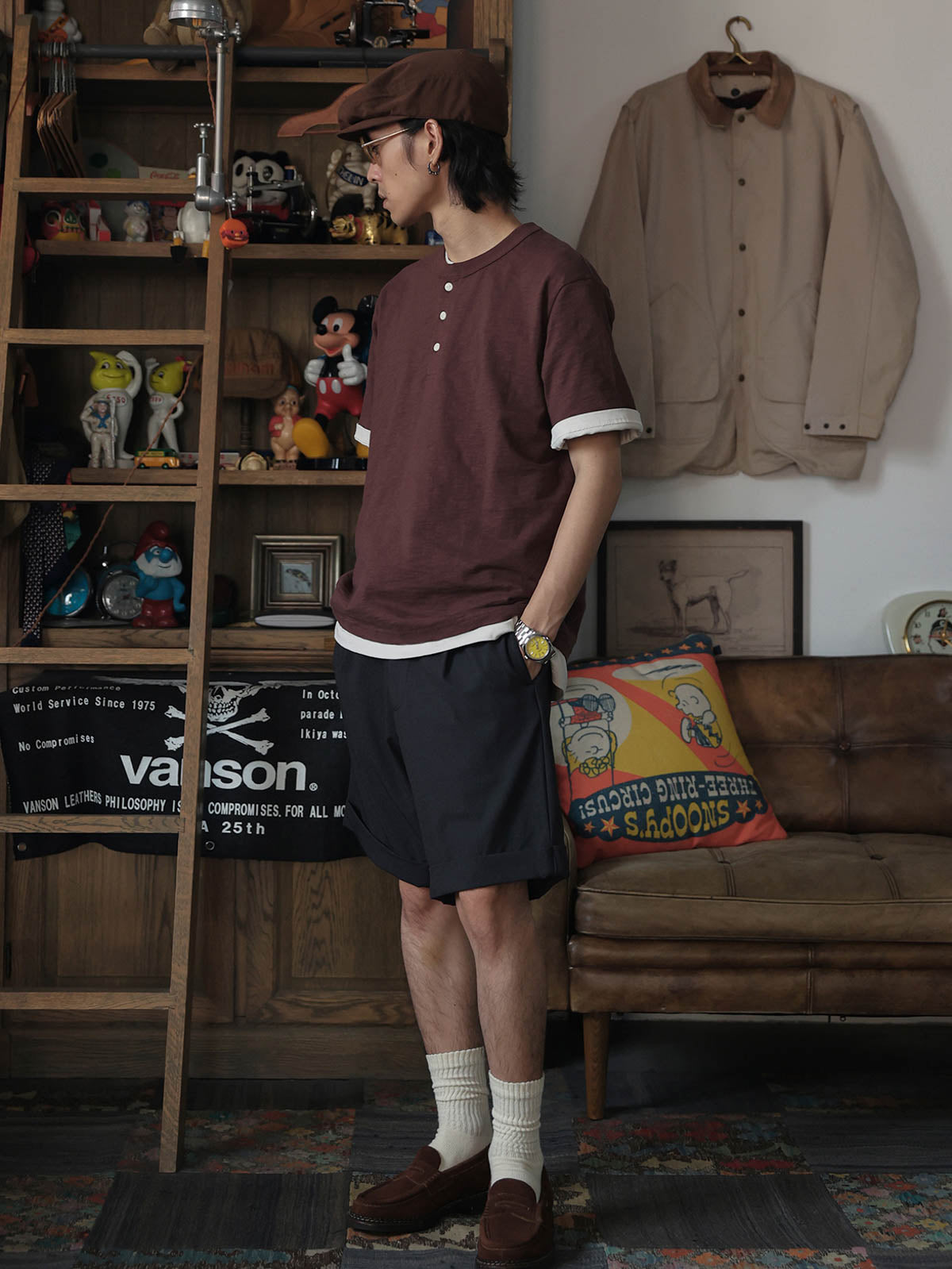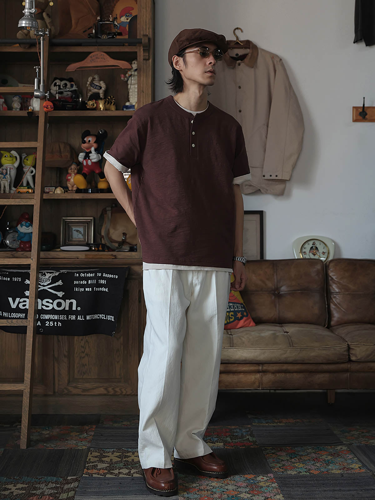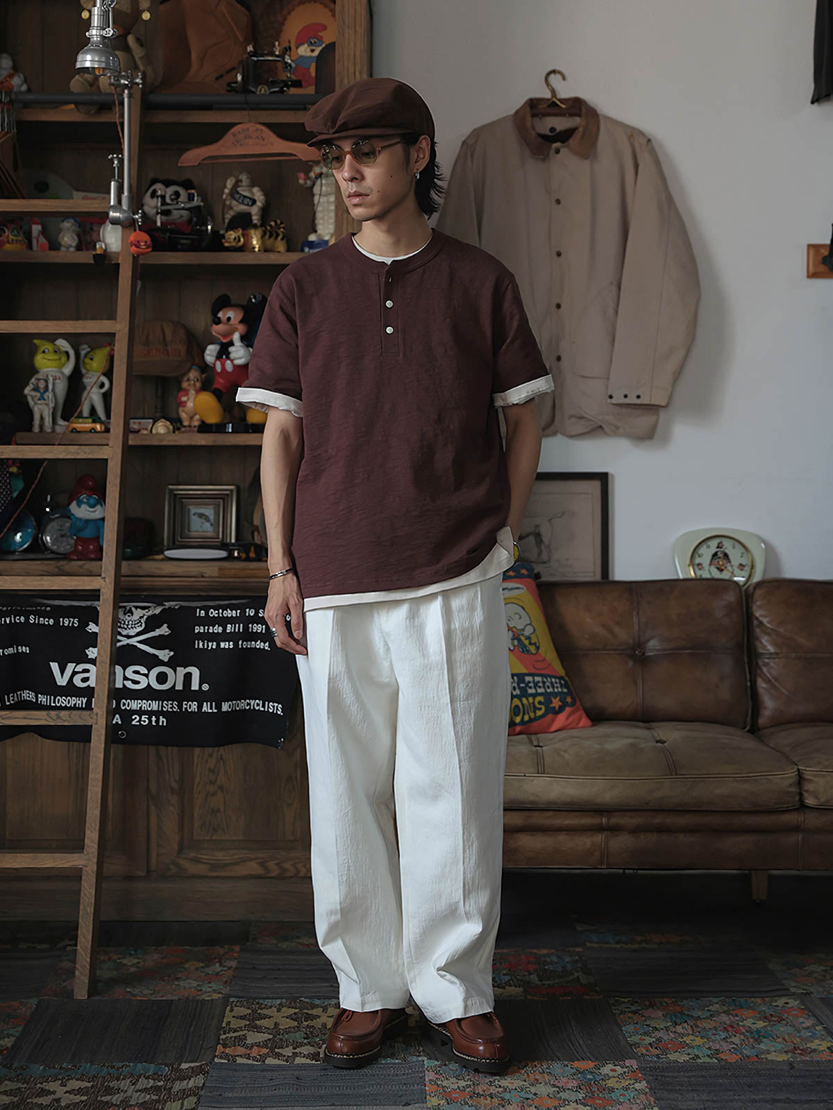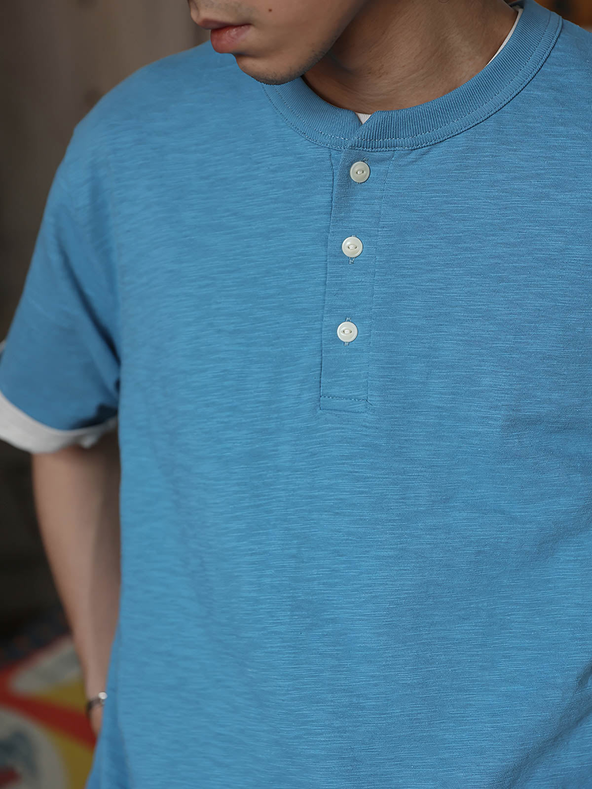 クラシックなヘンリーネックデザイン。高品質なスラブコットン素材を使用し、多様な魅力を引き立てます。