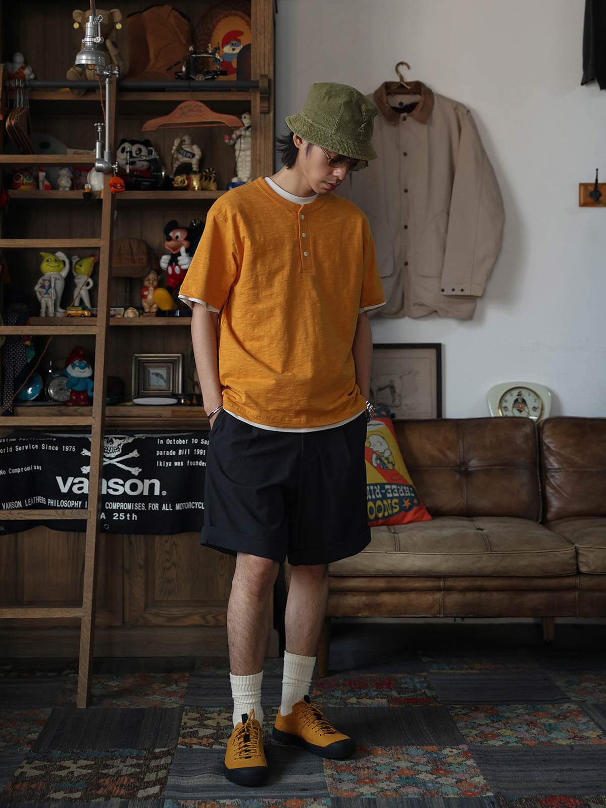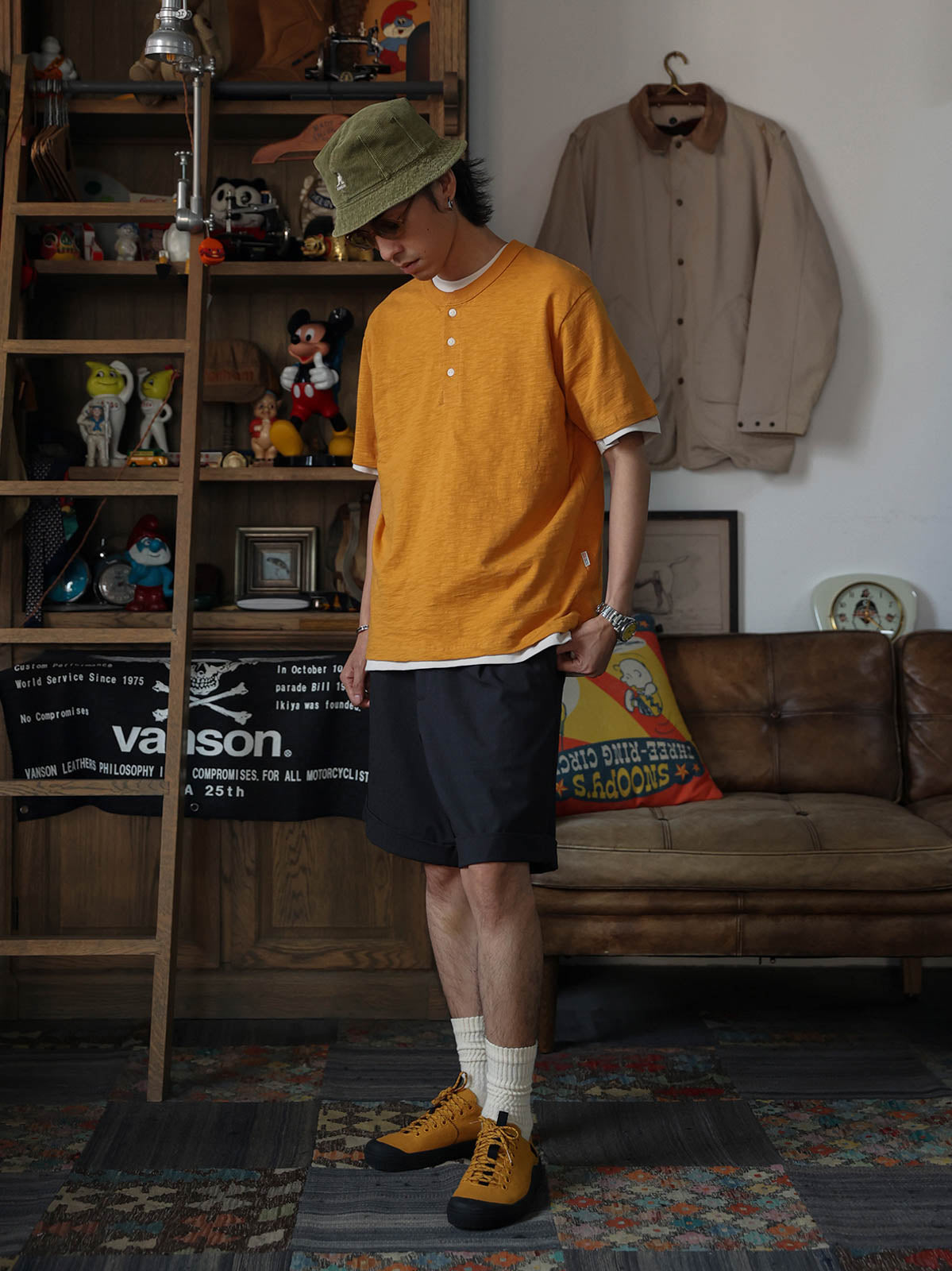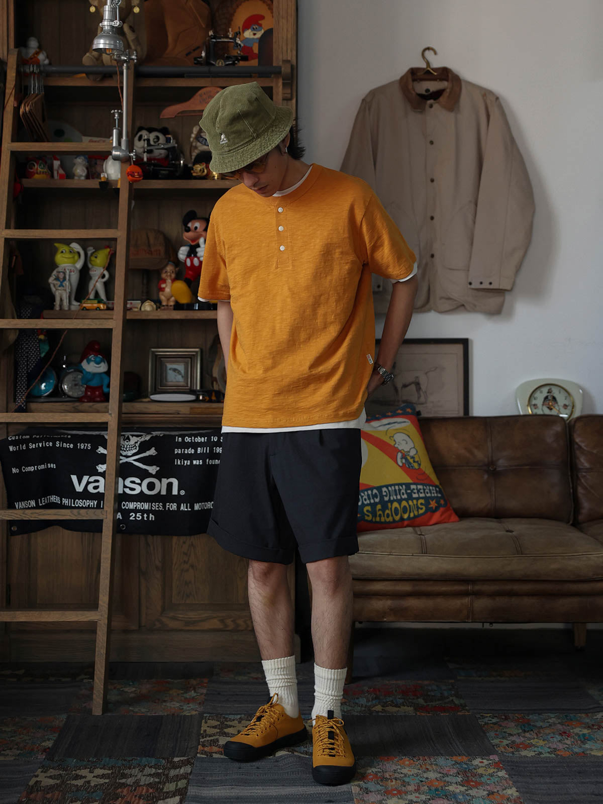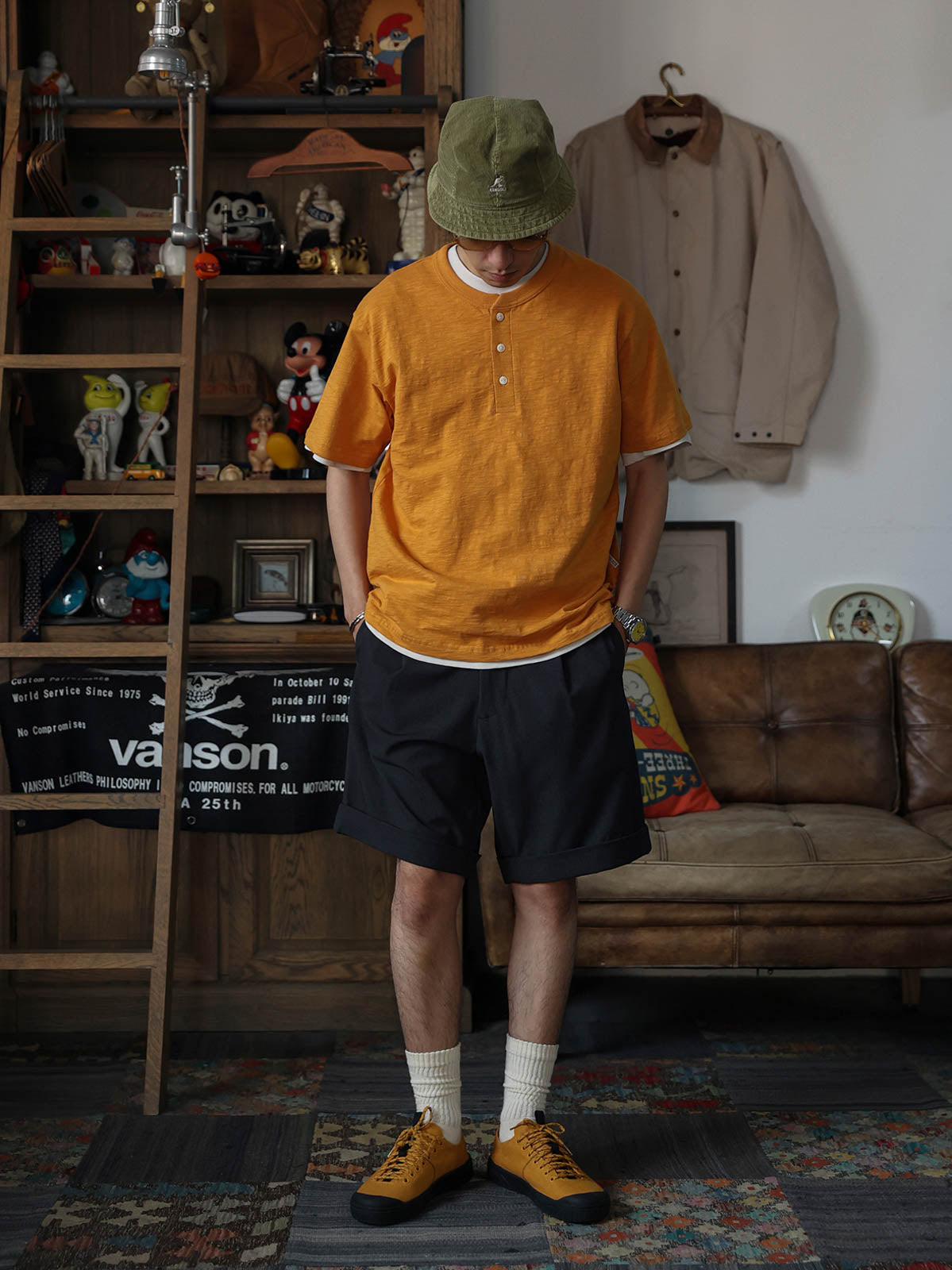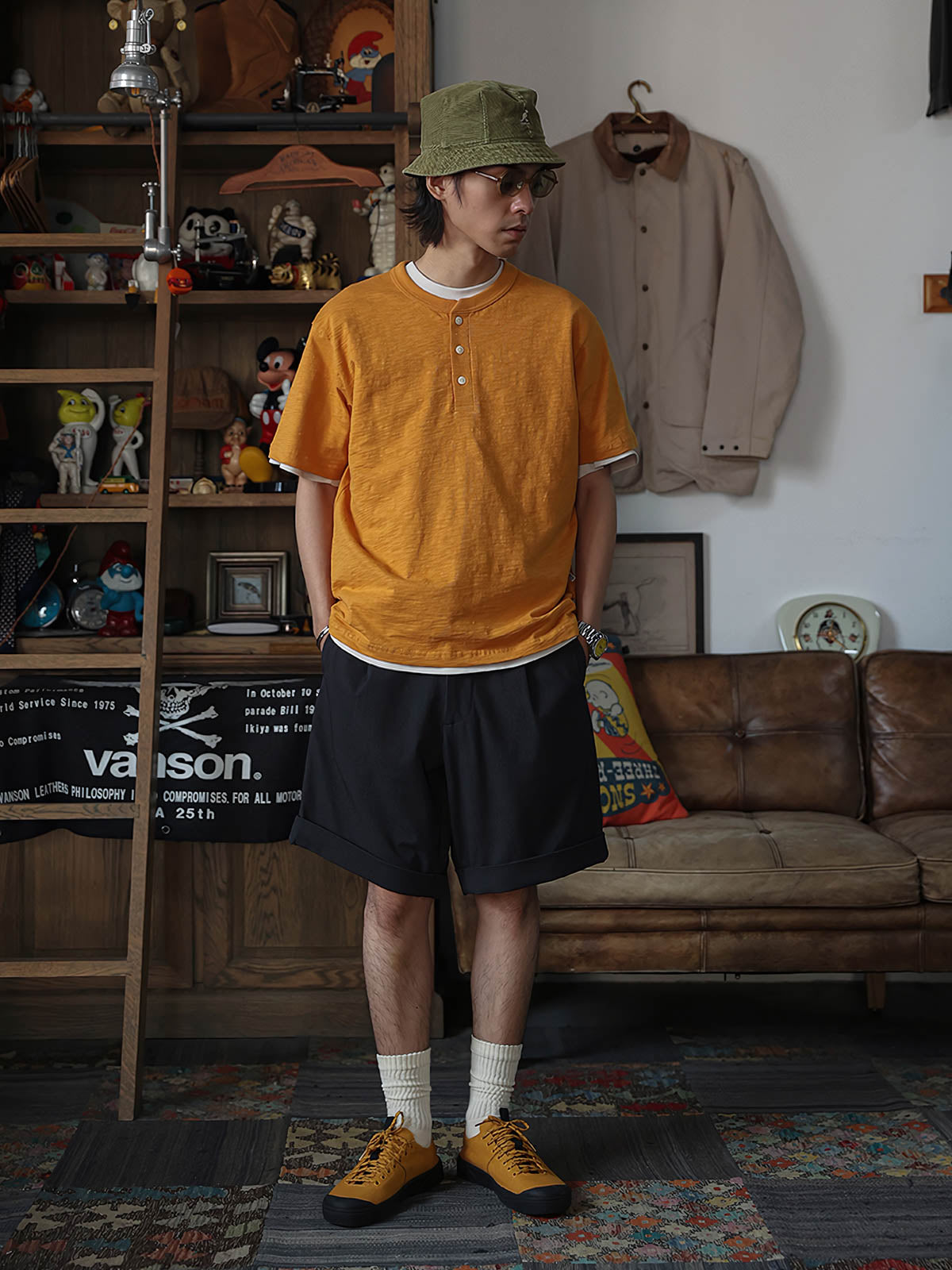 クラシックなヘンリーネックデザイン。高品質なスラブコットン素材を使用し、多様な魅力を引き立てます。