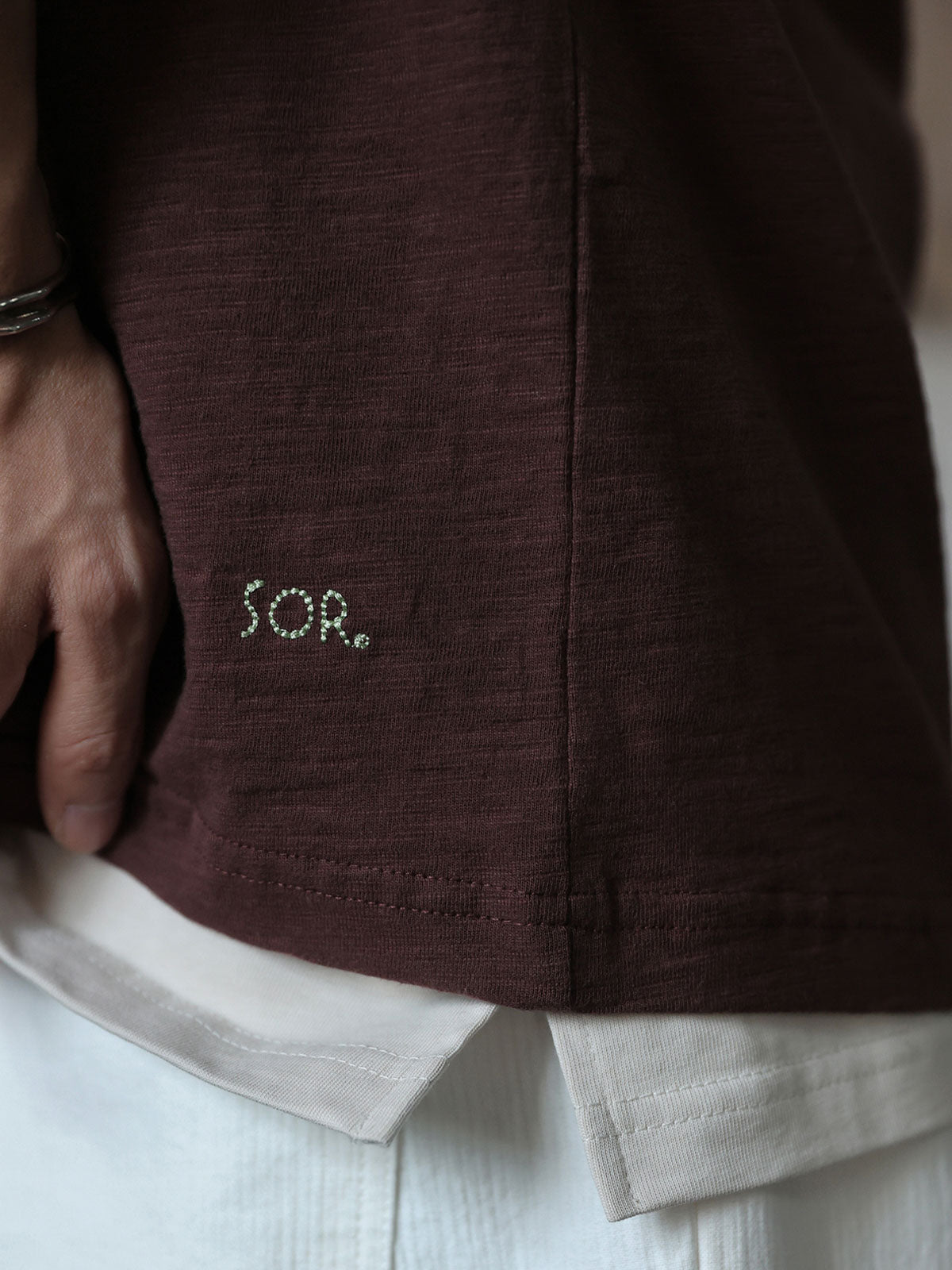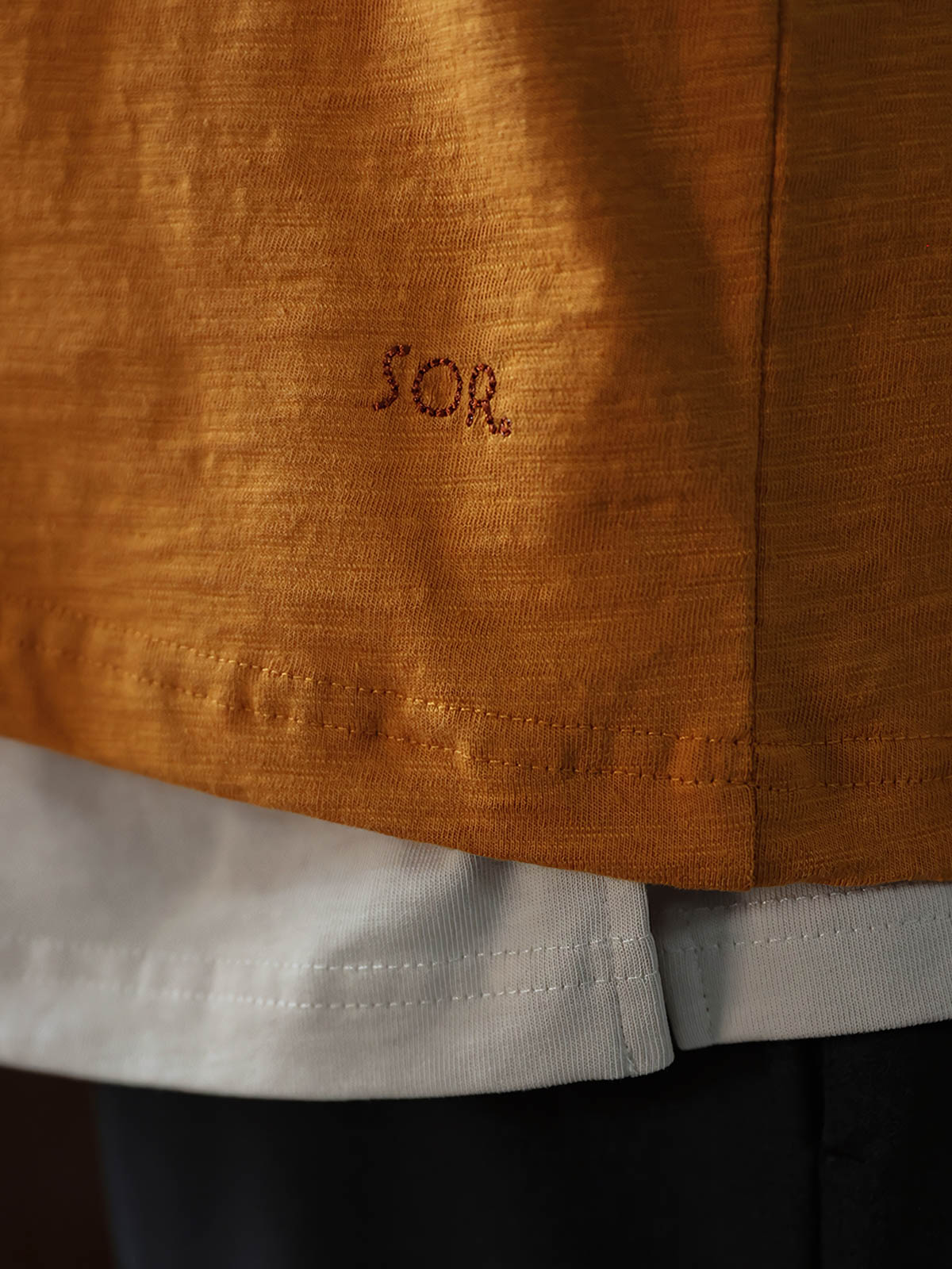 このヘンリーネックTシャツは、1839年にボート競技のユニフォームとしてデザインされ、三つのボタンが特徴です。成熟した雰囲気とカジュアルな魅力を兼ね備えています。SecondorderはクラシックなThree buttonsデザインを保持し、フルーツボタンを採用して最も快適なHenley Shirtを再現しました。260グラムのロングステープルコットン(シーアイランドコットン)を使用し、独特のスラブテクスチャーと柔らかい肌触りが特徴です。一般的なプレーンニットコットン生地よりも通気性と吸汗性に優れ、夏の着用に最適です。特別な織り方により、立体的なテクスチャーと自然なヴィンテージ感を実現しました。アメリカンフィットのシルエットは、単独でもレイヤリングでも快適に着用できます。柔らかくふんわりとした生地で、背面の裾には「SOR」ブランドのイニシャルが刺繍され、シンプルながら遊び心のあるデザインとなっています。