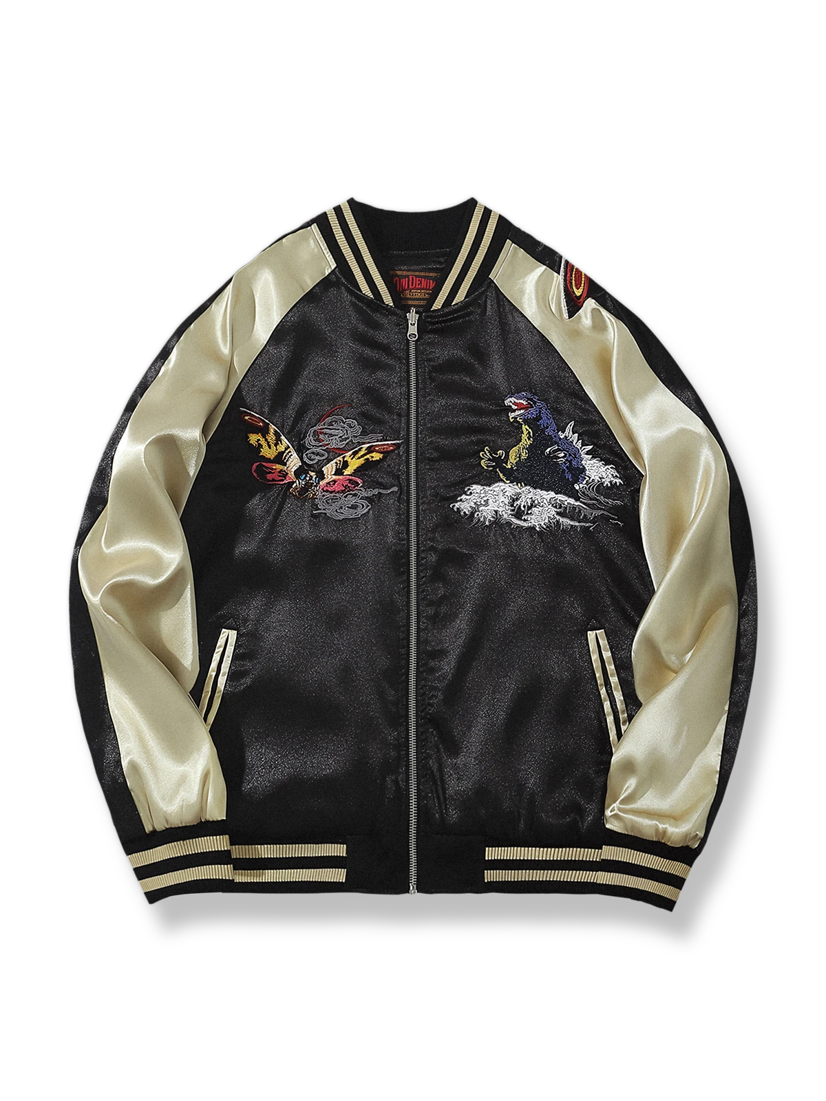 このジャケットは、映画史に残る怪獣たち、ゴジラとモスラをテーマにしたもので、その背面の刺繍はこれらの文化的アイコンへの敬意を表しています。このジャケットはこれらの要素をファッションと融合させ、独特の文化的魅力と歴史的深みを表現しています。
