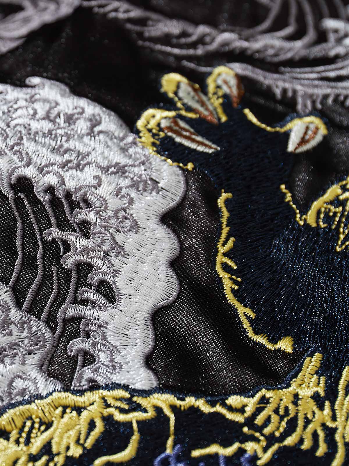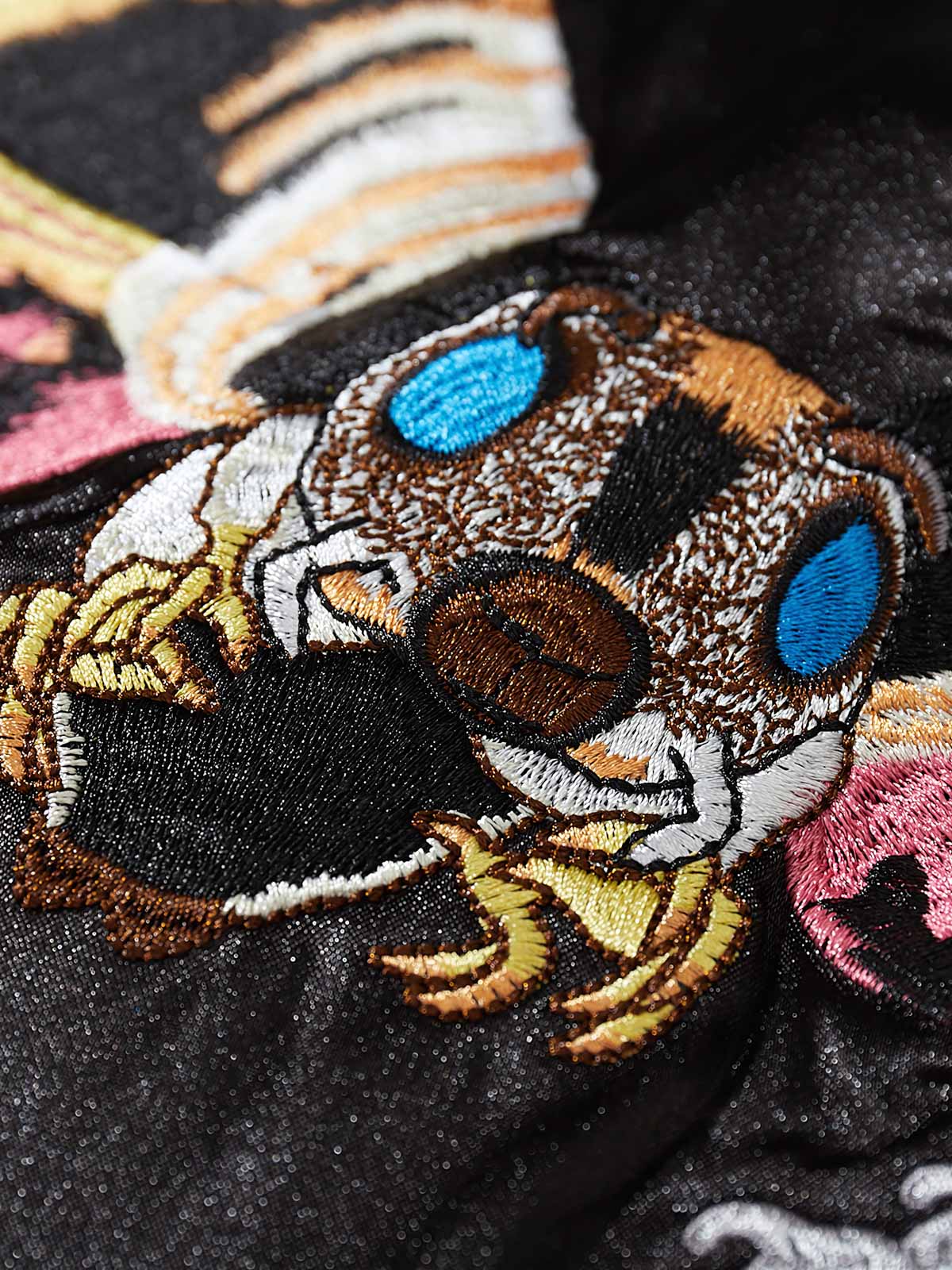 素材選びでは、高品質のサテンを使用し、滑らかな手触りと耐久性を提供しています。刺繍は細かく精巧で、ゴジラとモスラの姿を生き生きと表現しており、一針一針に職人の技術の高さと細部へのこだわりが感じられます。